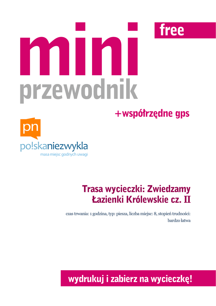 Trasa wycieczki: Zwiedzamy Łazienki Królewskie cz. II czas trwania: 1 godzina, typ: piesza, liczba miejsc: 8, stopień trudności: bardzo łatwa Opis wycieczki Drugą część zwiedzania warszawskich Łazienek Królewskich, rozpoczynamy od… budynku Koszarów Inwalidów, zwanego również Koszarami Kantonistów. Dlaczego nie od domu Narutowicza? A to dlatego, że stanowiąc placówkę „wczesno-oświatową”, czyli przedszkole, willa ta jest ogrodzona i nie ma do niej swobodnego dostępu. Budynek dawnych koszar (podobnie jak stajnie Kubickiego), wzniesiono w latach 20. XIX wieku. Obecnie mieści się w nim Muzeum Jeździectwa i Łowiectwa. To właśnie na przyległym do niego wybiegu można spotkać różnej maści konie, które są jedną z atrakcji parku. Teraz proponuję pójść dalej w kierunku południowym, by dojść do miejsca, którego jeszcze na Polsce Niezwykłej nie ma. A jest to miejsce, na którym w latach 1929-1937 odbywały się Międzynarodowe Oficjalne Zawody Konne CHIO, co upamiętnia pamiątkowa płyta, ufundowana przez Polski Związek Jeździecki. To miejsce upodobały sobie łazienkowe pawie i naprawdę trudno ich tu nie spotkać. Obieramy kierunek północno-zachodni i podążamy do teatru. Nim jednak do niego dojdziemy, spotkamy, usytuowane na niewielkim pagórku, popiersie Stanisława Wyspiańskiego. Stąd widać już scenę na wodzie. Teatr zbudowany został tuż przed II rozbiorem, wg. projektów Jana Chrystiana Kamsetzera, na wzór starożytnego teatru w Herkulanum. Składa się z kamiennego amfiteatru na brzegu stawu oraz sceny na wyspie. W okresie letnim odbywają się tu koncerty i przedstawienia teatralne. Idąc dalej, w kierunku najważniejszego obiektu Łazienek, napotykamy piękną, niezwykłą rzeźbę zatytułowaną „Tankred i Klorynda”. Jest to kopia, jej oryginał znajduje się w Puławach. Najważniejszym obiektem parku jest oczywiście Pałac na Wyspie. Nad jego historią, architekturą, a także dekoracjami rzeźbiarskimi oraz malarskimi, rozwodzić można byłoby się długo. Wystarczy tu wymienić słynne alegoryczne wyobrażenia Wisły i Bugu z 1820 r., autorstwa Ludwika Kaufmana, czy dwie rzeźby Andrzeja LeBruna z 1776 r.: Tańczący Satyr i Bachantka. Wzniesiony został na zrębie dawnej łaźni Lubomirskiego. Obecny klasycystyczny pałac pochodzi z lat 1792-93. Składa się z korpusu głównego, dobudowanych doń skrzydeł bocznych, piętra z belwederem oraz dwóch pawilonów połączonych z pałacem kolumnadą przerzuconą nad kanałami. Idąc dalej w kierunku północnym, dochodzimy do Starej Kordegardy, klasycystycznego budynku z 1793 r., który strzegł wówczas głównego wjazdu do pałacu, a który obecnie przeznaczony jest na wystawy sztuki współczesnej. Kilkadziesiąt metrów dalej znajduje się kartusz herbowy króla Stanisława Augusta Poniatowskiego. Po przejściu przez ulicę Agrykola, docieramy do ostatniego punktu drugiego etapu naszej wycieczki, a mianowicie jednego z dwóch najstarszych budynków Łazienek, tj. Ermitażu. Na jego ścianie frontowej umieszczono tabliczkę informującą kim był inżynier Agricola, od którego nazwiska wzięła się ulica Agrykola. Tu, będąc w połowie naszej wycieczki, możemy odsapnąć i zjeść smaczny posiłek w barze, oddalonym o kilkadziesiąt metrów od Ermitażu. Program wycieczki 2 3 Warszawa Koszary Kantonistów (1826-1829) Położone we wschodniej części Łazienek Koszary Kantonistów nazywane są również Koszarami Inwalidów lub Domkiem Ogrodnika. Zbudowano je w latach 1826-1829 z przeznaczeniem na koszary dla szkolących się tutaj kantonistów (dzieci żołnierzy przygotowujących się do służby wojskowej). Skromny, klasycystyczny, dwukondygnacyjny budynek z użytkowym poddaszem mieści obecnie Muzeum Łowiectwa i Jeździectwa. Atrakcją, szczególnie dla dzieci, jest wybieg z końmi znajdujący się przy muzeum. 52°12'50"N 21°02'20"E | na mapie:A Warszawa Teatr na Wyspie Przy wschodnim brzegu niższego stawu łazienkowskiego wznosi się nawiązujący do starożytności, Amfiteatr – z malowniczo usytuowaną na wyspie sceną. Projektantem Amfiteatru wybudowanego w latach 1790-91 był Jan Chrystian Kamsetzer. Półkolista widownia wzorowana jest na antycznym amfiteatrze w Herkulanum, a trwałe dekoracje sceny imitują ruinę świątyni Jowisza w Baalbek w Syrii. Górny parapet widowni wieńczy osiem posągów dłuta Tomasza Righiego, wyobrażających najwybitniejszych dramaturgów starożytnych i nowożytnych, w tym dwóch Polaków – Adama Naruszewicza i Stanisława Trembeckiego. Warszawa Popiersie Stanisława Wyspiańskiego w Łazienkach Królewskich W Łazienkach Królewskich, tuż przy amfiteatrze, w roku 2004 odsłonięto popiersie Stanisława Wyspiańskiego, znakomitego dramatopisarza, autora "Nocy Listopadowej". Miejsce ustawienia pomnika nie jest przypadkowe, to między innym w Łazienkach odbywa się akcja tego dramatu. Popiersie, replikę rzeźby Apolinarego Głowińskiego, wykonano i ustawiono z inicjatywy Janusza Zakrzeńskiego, znakomitego aktora, który zginął w katastrofie smoleńskiej. Pierwotnie posągów tych było szesnaście, lecz wykonane w nietrwałym materiale narzutowym i w XIX w. niekonserwowane zaczęły się rozsypywać. W latach 192627 osiem posągów przekuł w kamieniu Stanisław jakubowski, pozostałych nie udało się niestety uratować. Oryginalnym rozwiązaniem Amfiteatru łazienkowskiego, nie występującym w jego antycznym pierwowzorze, jest oddzielenie sceny od widowni wodą, co umożliwiało wystawianie widowisk przedstawiających bitwy morskie lub sztuk, których fabuła wymagała wprowadzenia łodzi. Taką sztuką był balet Kleopatra wystawiony na inaugurację Amfiteatru w dniu 7 września 1791 r. w 27 rocznicę elekcji Stanisława Augusta. 52°12'50"N 21°02'11"E | na mapie:C 52°12'51"N 21°01'55"E | na mapie:B 4 Warszawa Warszawa Rzeźba „Tankred i Klorynda” w Łazienkach Pałac na Wyspie Podczas spaceru po