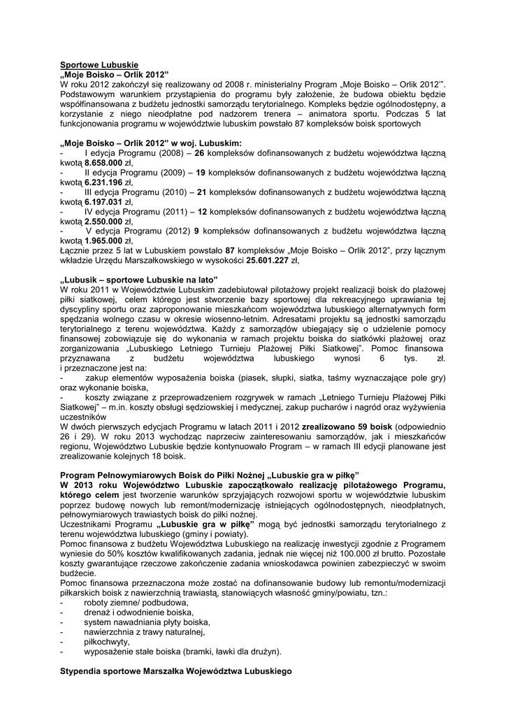 Sportowe Lubuskie „Moje Boisko – Orlik 2012” W roku 2012 zakończył się realizowany od 2008 r. ministerialny Program „Moje Boisko – Orlik 2012’”. Podstawowym warunkiem przystąpienia do programu były założenie, że budowa obiektu będzie współfinansowana z budżetu jednostki samorządu terytorialnego. Kompleks będzie ogólnodostępny, a korzystanie z niego nieodpłatne pod nadzorem trenera – animatora sportu. Podczas 5 lat funkcjonowania programu w województwie lubuskim powstało 87 kompleksów boisk sportowych „Moje Boisko – Orlik 2012” w woj. Lubuskim: I edycja Programu (2008) – 26 kompleksów dofinansowanych z budżetu województwa łączną kwotą 8.658.000 zł, II edycja Programu (2009) – 19 kompleksów dofinansowanych z budżetu województwa łączną kwotą 6.231.196 zł, III edycja Programu (2010) – 21 kompleksów dofinansowanych z budżetu województwa łączną kwotą 6.197.031 zł, IV edycja Programu (2011) – 12 kompleksów dofinansowanych z budżetu województwa łączną kwotą 2.550.000 zł, V edycja Programu (2012) 9 kompleksów dofinansowanych z budżetu województwa łączną kwotą 1.965.000 zł, Łącznie przez 5 lat w Lubuskiem powstało 87 kompleksów „Moje Boisko – Orlik 2012”, przy łącznym wkładzie Urzędu Marszałkowskiego w wysokości 25.601.227 zł, „Lubusik – sportowe Lubuskie na lato” W roku 2011 w Województwie Lubuskim zadebiutował pilotażowy projekt realizacji boisk do plażowej piłki siatkowej, celem którego jest stworzenie bazy sportowej dla rekreacyjnego uprawiania tej dyscypliny sportu oraz zaproponowanie mieszkańcom województwa lubuskiego alternatywnych form spędzania wolnego czasu w okresie wiosenno-letnim. Adresatami projektu są jednostki samorządu terytorialnego z terenu województwa. Każdy z samorządów ubiegający się o udzielenie pomocy finansowej zobowiązuje się do wykonania w ramach projektu boiska do siatkówki plażowej oraz zorganizowania „Lubuskiego Letniego Turnieju Plażowej Piłki Siatkowej”. Pomoc finansowa przyznawana z budżetu województwa lubuskiego wynosi 6 tys. zł. i przeznaczone jest na: zakup elementów wyposażenia boiska (piasek, słupki, siatka, taśmy wyznaczające pole gry) oraz wykonanie boiska, koszty związane z przeprowadzeniem rozgrywek w ramach „Letniego Turnieju Plażowej Piłki Siatkowej” – m.in. koszty obsługi sędziowskiej i medycznej, zakup pucharów i nagród oraz wyżywienia uczestników W dwóch pierwszych edycjach Programu w latach 2011 i 2012 zrealizowano 59 boisk (odpowiednio 26 i 29). W roku 2013 wychodząc naprzeciw zainteresowaniu samorządów, jak i mieszkańców regionu, Województwo Lubuskie będzie kontynuowało Program – w ramach III edycji planowane jest zrealizowanie kolejnych 18 boisk. Program Pełnowymiarowych Boisk do Piłki Nożnej „Lubuskie gra w piłkę” W 2013 roku Województwo Lubuskie zapoczątkowało realizację pilotażowego Programu, którego celem jest tworzenie warunków sprzyjających rozwojowi sportu w województwie lubuskim poprzez budowę nowych lub remont/modernizację istniejących ogólnodostępnych, nieodpłatnych, pełnowymiarowych trawiastych boisk do piłki nożnej. Uczestnikami Programu „Lubuskie gra w piłkę” mogą być jednostki samorządu terytorialnego z terenu województwa lubuskiego (gminy i powiaty). Pomoc finansowa z budżetu Województwa Lubuskiego na realizację inwestycji zgodnie z Programem wyniesie do 50% kosztów kwalifikowanych zadania, jednak nie więcej niż 100.000 zł brutto. Pozostałe koszty gwarantujące rzeczowe zakończenie zadania wnioskodawca powinien zabezpieczyć w swoim budżecie. Pomoc finansowa przeznaczona może zostać na dofinansowanie budowy lub remontu/modernizacji piłkarskich boisk z nawierzchnią trawiastą, stanowiących własność gminy/powiatu, tzn.: roboty ziemne/ podbudowa, drenaż i odwodnienie boiska, system nawadniania płyty boiska, nawierzchnia z trawy naturalnej, piłkochwyty, wyposażenie stałe boiska (bramki, ławki dla drużyn). Stypendia sportowe Marszałka Województwa Lubuskiego Stypendia sportowe Marszałka Województwa Lubuskiego wręczane są od roku 2008. Przeznaczone są dla wybitnie uzdolnionych sportowców w kategoriach wiekowych junior i młodzieżowiec oraz osób niepełnosprawnych za osiągnięte wysokie wyniki sportowe w międzynarodowym i krajowym współzawodnictwie sportowym, którzy są członkami klubów sportowych zarejestrowanych na terenie Województwa Lubuskiego. W latach 2009 -2012 przyznano łącznie 131 stypendiów na kwotę 286.041 zł Program Rozwoju Bazy Sportowej Urząd Marszałkowski pośredniczy w rozdysponowaniu środków finansowych na przebudowę, remonty i inwestycje obiektów sportowych., na które Ministerstwo Sportu i Turystyki latach 2011-2012 przeznaczyło ponad 11,5 mln zł, z przeznaczeniem na budowę/modernizację 33 obiektów sportowych. Od 1999 roku w ramach Programu ze środków pochodzących z Funduszu Rozwoju Kultury Fizycznej w województwie lubuskim około 140 inwestycji na łączną kwotę około 103 mln zł. Wojewódzki Ośrodek Sportu i Rekreacji w Drzonkowie W latach 2008 – 2012 na terenie WOSiR ze środków pochodzących m.in. z Województwa Lubuskiego, Ministerstwa Sportu i Rekreacji, programów unijnych, w tym Lubuskiego Regionalnego Programu Operacyjnego zrealizowano, bądź w dalszym ciągu realizowanych jest 26 inwestycji związanych z rozwojem bazy sportowej Ośrodka. W ramach wykonywanych inwestycji m.in. zmodernizowano basen kryty, halę sportową oraz strzelnicę, przebudowano i rozbudowano zespół basenów odkrytych oraz wielofunkcyjny obiekt jeździecki, a także zrealizowano inwestycję termomodernizacji hali tenisowej. W 2012 roku na terenie WOSiR odbyły się zgrupowania m.in. w pięcioboju nowoczesnym, pływaniu, tenisie stołowym, szermierce, jeździectwie oraz strzelectwie. Na obiektach WOSiR trenowały kadry olimpijskie pięcioboju nowoczesnego Polski, 