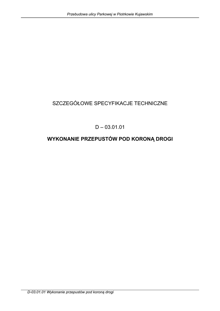 Przebudowa ulicy Parkowej w Piotrkowie Kujawskim SZCZEGÓŁOWE SPECYFIKACJE TECHNICZNE D – 03.01.01 WYKONANIE PRZEPUSTÓW POD KORONĄ DROGI D-03.01.01 Wykonanie przepustów pod koroną drogi Przebudowa ulicy Parkowej w Piotrkowie Kujawskim D-03.01.01 Wykonanie przepustów pod koroną drogi Przebudowa ulicy Parkowej w Piotrkowie Kujawskim 1. Wstęp 1.1 Przedmiot SST. Przedmiotem niniejszej specyfikacji technicznej są wymagania dotyczące wykonania i odbioru robot odwodnieniowych, związanych z „Przebudową ulicy Parkowej w Piotrkowie Kujawskim”. 1.2.Zakres robót objętych SST Ustalenia zawarte w niniejszej specyfikacji dotyczą zasad prowadzenia robót związanych z wykonaniem przepustów pod koroną drogi oraz ścianek czołowych jako samodzielnych elementów i mogą posłużyć jako dokument przetargowy przy zlecaniu i realizowaniu robot wymienionych w punkcie 1.1. 1.3. Określenia podstawowe Przepust - budowla inżynierska mająca nad sobą nasyp i służąca do przeprowadzania ciągu wodnego, komunikacyjnego lub innych urządzeń. Głowica wlotowa i wylotowa - konstrukcja zabezpieczająca nasyp drogowy przed uszkodzeniem od strony wlotu lub wylotu. 2. Materiały 2.1. Materiały Materiały potrzebne do wykonania przepustu wraz z wykonaniem wlot i wylotu przepustu oraz fundamentu: – beton C 20/25 – rura z polietylenu o wysokiej gęstości, dwustronna. Wewnętrzna część gładka zewnętrzna karbowana, – prefabrykaty zbrojarskie – lepik asfaltowy stosowany na gorąco – drut stalowy okrągły miękki 4-5mm – pręty zbrojeniowe ze stali St3SX i 18G2 – roztwór asfaltowy do gruntowania Abizol R – deski iglaste obrzynane III kl.gr 25mm – krawędziaki iglaste II kl. – drewno na stemple okrągłe – gwoździe budowlane okrągłe gołe – Środek antyathezyjny 2.2. Wymagania 2.2.1. Beton powinien być klasy C- 20/25 ,składniki betonu powinny odpowiadać PN-EN 206 -1 Beton wymagania ,właściwości , produkcja i zgodność. 2.2.2. Lepik asfaltowy z aktualną PN 2.2.3. Tarcica iglasta do robot ciesielskich należy stosować zgodnie z aktualną PN w przypadku obudowy wlotów i wylotów należy stosować tarcicę III kl. 2.2.4. Żelbetowe elementy prefabrykowane Kształt i wymiary żelbetowych elementów prefabrykowanych do przepustów i ścianek czołowych powinny być zgodne z dokumentacją projektową. Odchyłki wymiarów prefabrykatów powinny odpowiadać PN-B-02356 [2]. Powierzchnie elementów powinny być gładkie i bez raków, pęknięć i rys. Dopuszcza się drobne pory jako pozostałości po pęcherzykach powietrza i wodzie do głębokości 5 mm. Po wbudowaniu elementów dopuszcza się wyszczerbienia krawędzi o głębokości do 10 mm i długości do 50 mm w liczbie 2 sztuk na 1 m krawędzi elementu, przy czym na jednej krawędzi nie może być więcej niż 5 wyszczerbień. Składowanie elementów powinno odbywać się na wyrównanym, utwardzonym i odwodnionym podłożu. Poszczególne rodzaje elementów powinny być składowane oddzielnie. 3. Sprzęt 3.1. Roboty związane z wykonaniem części przelotowej powinny należy wykonywać z wykorzystaniem następującego sprzętu : – samochód skrzyniowy 5-10T – narzędzia ciesielskie – dźwig 4-5ton – sprzęt do wytworzenia i wbudowania betonu – inny akceptowany przez inżyniera( inspektora nadzoru) 4. Transport 4.1. Beton należy przewozić w taki sposób aby nie spowodować rozsegregowania składników. Materiały D-03.01.01 Wykonanie przepustów pod koroną drogi Przebudowa ulicy Parkowej w Piotrkowie Kujawskim izolacyjne przewozić w pojemnikach i rolkach fabrycznie zabezpieczonych. 5. Wykonanie robot 5.1 Zakres robot obejmuje: – Wykonanie deskowania fundamentu pod ścianki pionowe, – Ułożenie betonu w fundamencie, – Rozebranie deskowania, – Wykonanie deskowania ścianek pionowych – Montaż zbrojenia o ile występuje – Ułożenie betonu. – Rozebranie deskowania – Wykonanie izolacji poprzez smarowanie lepikiem od strony nasypu. – Pielęgnacja betonu, – Zakup, dowóz i ułożenie rur, – Obsypanie rur piaskiem, Parametry geometryczne ,kształt i wysokości zgodnie z opracowaniem Warszawskiego Biura Studiów i Projektów Transportu Drogowego i Lotniczego „Przepusty Drogowe – Typowe Elementy Przepustów Rurowych” dla rur o średnicy fi 1000, karta 38. 6. Kontrola jakości robot 6.1. Kontroli jakości robot powinien dokonywać inspektor nadzoru z ramienia inwestora W zakres kontroli jakości wykonywania robot związanych z wykonaniem obudowy wlotów/wylotów wchodzi: – sprawdzenie właściwości materiałów PN-EN 206 -1 oraz zgodnie z atestami producentów – sprawdzenie wymiarów z tolerancją ± 5cm. – sprawdzenie rzędnych wysokości niwelatorem z tolerancją na jednym stanowisku niwelatora do 1 cm, – płaszczyzny i krawędzie odchylenie od pionu 0,5cm 7. Obmiar robot 7.1. Obmiaru robot należy wykonywać zgodnie z jednostkami obmiaru w przedmiarze robot oraz kosztorysie ślepym 8. Odbiór robot 8.1 Odbioru robot należy dokonać komisyjnie z uwzględnieniem pkt 6 Odbiorowi podlegają wszystkie roboty zanikające. 9. Podstawa płatności 9.1. Podstawę płatności stanowią jednostki wyszczególnione w przedmiarze robot i kosztorysie ślepym cena obejmuje: – transport ( przygotowanie i dostarczenie materiałów) – wykonanie robot wg pkt 5, – koszt organizacji ruchu na drodze, – koszty ewentualnej zmiany koryta cieku na czas remontu. 10. Przepisy związane - PN-73 /S-02202 "Przepusty" - podział , nazwy ,określenia - PN-EN 206 -1 Beton wymagania ,właściwości , produkcja i zgodność. - PN-B-06265 /2004 Beton wymagania ,właściwości , produkcja i zgodność. Uzupełnienie do PN-EN 206-1 - PN-77/S-10040 "żelbetowe i betonowe konstrukcje mostowe" wymagania i badania - S.S.T.13.01.01 Beton Konstrukcyjny w deskowaniu - PN-EN 13043-04 Kruszywa do mieszanek bitumicznych i powierzchniowych utrwaleń stosowanych na drogach ,lotniskach i innych powierzchniach pr