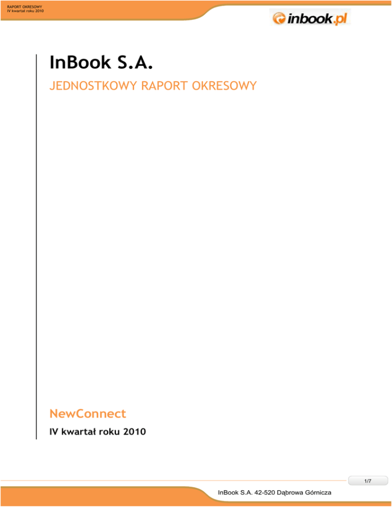 RAPORT OKRESOWY IV kwartał roku 2010 InBook S.A. JEDNOSTKOWY RAPORT OKRESOWY NewConnect IV kwartał roku 2010 1/7 InBook S.A. 42-520 Dąbrowa Górnicza RAPORT OKRESOWY IV kwartał roku 2010 1. Podstawowe informacje o Spółce Spółka Emitenta: Forma prawna: Kraj siedziby: Siedziba i adres: InBook S.A. Spółka Akcyjna Polska Osiedle Robotnicze 6 Numer KRS: REGON: Numer NIP: Kapitał zakładowy: 0000310188 277501658 6292195774 609 783,00 zł tel./fax: +48 32 2686405 e-mail: [email protected] WWW: www.inbook.com.pl Skład Zarządu Spółki Mariusz Dąbrowski Jakub Dębski Prezes Zarządu Wiceprezes Zarządu Skład Rady Nadzorczej Spółki Iwona Chometa Albin Wabiszczewicz Katarzyna Pachulska Maciej Debski Adam Raciborski Członek RN Członek RN Członek RN Członek RN Członek RN 2/7 InBook S.A. 42-520 Dąbrowa Górnicza RAPORT OKRESOWY IV kwartał roku 2010 2. Wybrane dane finansowe z bilansu oraz rachunku zysków i strat (wyszczególnienie) stan na 31.12.2010 stan na 31.12.2009 1 2 3 Kapitał (fundusz) własny 1 047 748,32 1 143 635,96 Należności długoterminowe - - Należności krótkoterminowe 87 641,22 198 036,19 Inwestycje długoterminowe 90 000,00 161 223,00 Inwestycje krótkoterminowe, w tym: 309 198,35 247 586,06 Środki pieniężne i inne aktywa pieniężne 309 198,35 247 586,06 Zobowiązania długoterminowe 9 066,61 18 088,59 Zobowiązania krótkoterminowe 206 484,42 367 614,36 1 485 119,80 949 857,25 849 735,43 755 854,66 2 334 855,23 1 705 711,91 Aktywa trwałe Aktywa obrotowe Aktywa/Pasywa razem Dane finansowe w tys. zł (wyszczególnienie) Amortyzacja IV kwartał 2010r. IV kwartał 2009r. 2010r. narastająco 2009r. narastająco od 01.10.2010 do 31.12.2010 od 01.10.2009 do 31.12.2009 od 01.01.2010 do 31.12.2010 od 01.01.2009 do 31.12.2009 64 334,27 22 138,62 230 642,22 49 550,60 921 739,87 966 407,43 3 052 340,63 3 380 243,77 Zysk (strata) na sprzedaży - 69 081,74 - 7 556,08 - 419 177,12 - 33 385,11 Zysk (strata) na działalności operacyjnej - 19 540,52 20 768,26 - 224 813,41 5 670,46 Zysk (strata) brutto - 27 658,67 14 630,40 - 255 887,64 577,53 Zysk (strata) netto - 27 658,67 5 955,38 - 255 887,64 - 8 097,47 Przychody netto ze sprzedaży Dane finansowe w tys. zł 3/7 InBook S.A. 42-520 Dąbrowa Górnicza RAPORT OKRESOWY IV kwartał roku 2010 3. Komentarz Zarządu lub osoby zarządzającej Emitenta na temat czynników i zdarzeń, które miały wpływ na osiągnięte wyniki finansowe Przychody netto ze sprzedaży w IV kwartale 2010 roku zamknęły się kwotą 921 739,87 zł. Powyższa wartość przychodów nie pozwoliła wypracować zysku netto, w związku z czym strata netto w okresie sprawozdawczym wyniosła 27 658,67zł. Na wynik finansowy znaczący wpływ miała amortyzacja, która w przedmiotowym okresie wyniosła 64334,27 zł. Sprzedaż w IV kwartale 2010 roku spadła w stosunku do analogicznego okresu w 2009r. o 5%, a w całym 2010r. w stosunku do 2009r. o 10%. Podane dane dotyczą całkowitej sprzedaży detalicznej. Sprzedaż zegarków mocno spadła ze względu na wypowiedzenie umowy przez Timex Group Polska Sp. z o.o. na sprzedaż zegarków tej marki. Natomiast liczba produktów sprzedawanych za pośrednictwem serwisu inbook.pl czyli głównie książek, filmów oraz multimediów wzrosła w porównaniu do zeszłorocznego kwartału. W omawianym kwartale Spółka sprzedała 1270 zegarków. Dla porównania w czwartym kwartale 2009 roku sprzedanych zostało 2160 zegarków z czego 1170 było marki Timex. Wynik ten pokazuje jednak, że liczba zegarków sprzedanych innych marek aniżeli Timex jest większa niż w zeszłym roku. Liczba sprzedanych książek oraz produktów multimedialnych w czwartym kwartale 2010 to 18260 sztuk, natomiast w ubiegłorocznym czwartym kwartale było to 10260 produktów. Biorąc pod uwagę w/w liczby jednoznacznie widać, że ostatnie działania Zarządu zaczynają przynosić rezultaty i sukcesywnie zwiększa się liczba sprzedawanych produktów. Koszt amortyzacji w 2009r. wyniósł 49 550,60 zł, natomiast w roku 2010 wyniósł 230 642,22 zł tj. wzrósł o 465%. Wiąże się to ze wzrostem wartości aktywów trwałych spółki w 2010r. w stosunku do 2009r. o 56%. Natomiast wartość aktywów/pasywów spółki w 2010r. w stosunku do roku 2009 wzrosła o 37% i wynosi 2 334 855,23 zł. Wartość aktywów obrotowych spółki w 2010r. w stosunku do roku 2009 wzrosła o 12%, natomiast zobowiązania spółki zmalały o 44 %. Ta poprawa płynności mimo odnotowanej straty jest wynikiem emisji akcji serii D. 4. Informacje Zarządu lub osoby zarządzającej Emitenta na temat aktywności, jaką w okresie objętym raportem Emitent podejmował w obszarze rozwoju prowadzonej działalności, w szczególności poprzez działania nastawione na wprowadzenie rozwiązań innowacyjnych w przedsiębiorstwie Koniec każdego roku to czas zintensyfikowanej pracy całego zespołu Spółki ze względu na przypadający okres Świąt Bożego Narodzenia, kiedy bardzo dużą ilość zamówień należy przygotować w dość krótkim czasie. Niemniej jednak dzięki podjętym uprzednio inwestycjom w księgarnię internetową w latach 2009 i 2010 Spółka poradziła sobie z obsługą zamówień. Wszystkie zastosowane do tej pory innowacje takie program "Spinacz" czy też "Box" zdały egzamin zwiększając liczbę zamówień i ułatwiając realizację zadań powierzonych pracownikom. Najważniejszym wydarzeniem w okresie IV kwartału 2010 roku było uruchomienie dnia 24.11.2010 roku nowej księgarni internetowej www.inbook.pl, o czym Spółka informowała w raporcie EBI 30/2010. Nowo powstała księgarnia była wynikiem prac całego działu IT, wielu lat doświadczeń pracy na starszym programie oraz uwag klientów, za które serdecznie dziękujemy. Założeniem nowego sklepu jest jego stały rozwój oparty na poszerzaniu asortymentu oraz pozyskiwaniu 4/7 InBook S.A. 42-520 Dąbrowa Górnicza RAPORT OKRESOWY IV kwartał roku 2010 nowych odbiorców. Nowy serwis posiada nowo