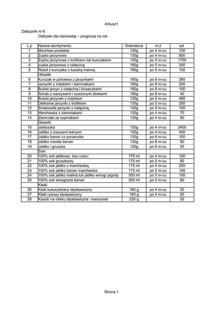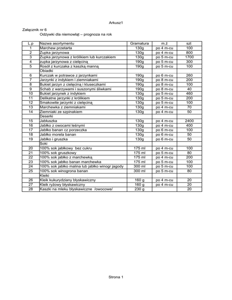 Arkusz1 Załącznik nr 6 Odżywki dla niemowląt – prognoza na rok L.p 1 2 3 4 5 6 7 8 9 10 11 12 13 14 15 16 17 18 19 20 21 22 23 24 25 26 27 28 Nazwa asortymentu Marchew przetarta Zupka jarzynowa Zupka jarzynowa z królikiem lub kurczakiem zupka jarzynowa z cielęciną Rosół z kurczaka z kaszką manną Obiadki Kurczak w potrawce z jarzynkami Jarzynki z indykiem i ziemniakami Bukiet jarzyn z cielęciną i kluseczkami Schab z warzywami i suszonymi śliwkami Bukiet jarzynek z indykiem Delikatne jarzynki z królikiem Smakowite jarzynki z cielęciną Marchewka z ziemniakami Ziemniaki ze szpinakiem Deserki Jabłuszka Jabłko z owocami leśnymi Jabłko banan cz porzeczka Jabłko morela banan Jabłko i gruszka Soki 100% sok jabłkowy bez cukru 100% sok gruszkowy 100% sok jabłko z marchewką 100% sok jabłko banan marchewka 100% sok jabłko malina lub jabłko winogr jagody 100% sok winogrona banan Kleiki Kleik kukurydziany błyskawiczny Kleik ryżowy błyskawiczny Kaszki na mleku błyskawiczne /owocowe/ Strona 1 Gramatura 130g 130g 130g 190g 190g m.ż po 4 m-cu po 4 m-cu po 5 m-cu po 5 m-cu po 5 m-cu szt 100 800 1700 300 100 190g 190g 190g 190g 130g 130g 130g 130g 130g po 6 m-cu po 8 m-cu po 8 m-cu po 8 m-cu po 5 m-cu po 5 m-cu po 5 m-cu po 4 m-cu po 4 m-cu 260 200 100 40 460 200 100 70 50 130g 130g 130g 130g 130g po 4 m-cu po 4 m-cu po 6 m-cu po 6 m-cu po 6 m-cu 2400 400 100 50 50 175 ml 175 ml 175 ml 175 ml 300 ml 300 ml po 4 m-cu po 5 m-cu po 4 m-cu po 5 m-cu po 5 m-cu po 5 m-cu 100 80 200 100 100 80 160 g 160 g 230 g po 4 m-cu po 4 m-cu 20 20 20