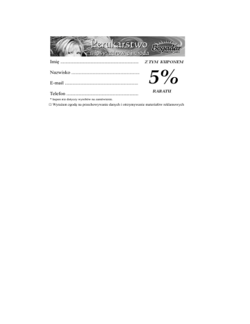 Imię .............................................................. Nazwisko ...................................................... E-mail .......................................................... Telefon ......................................................... * kupon nie dotyczy wyrobów na zamówienie. □ Wyrażam zgodę na przechowywanie danych i otrzymywanie materiałów reklamowych