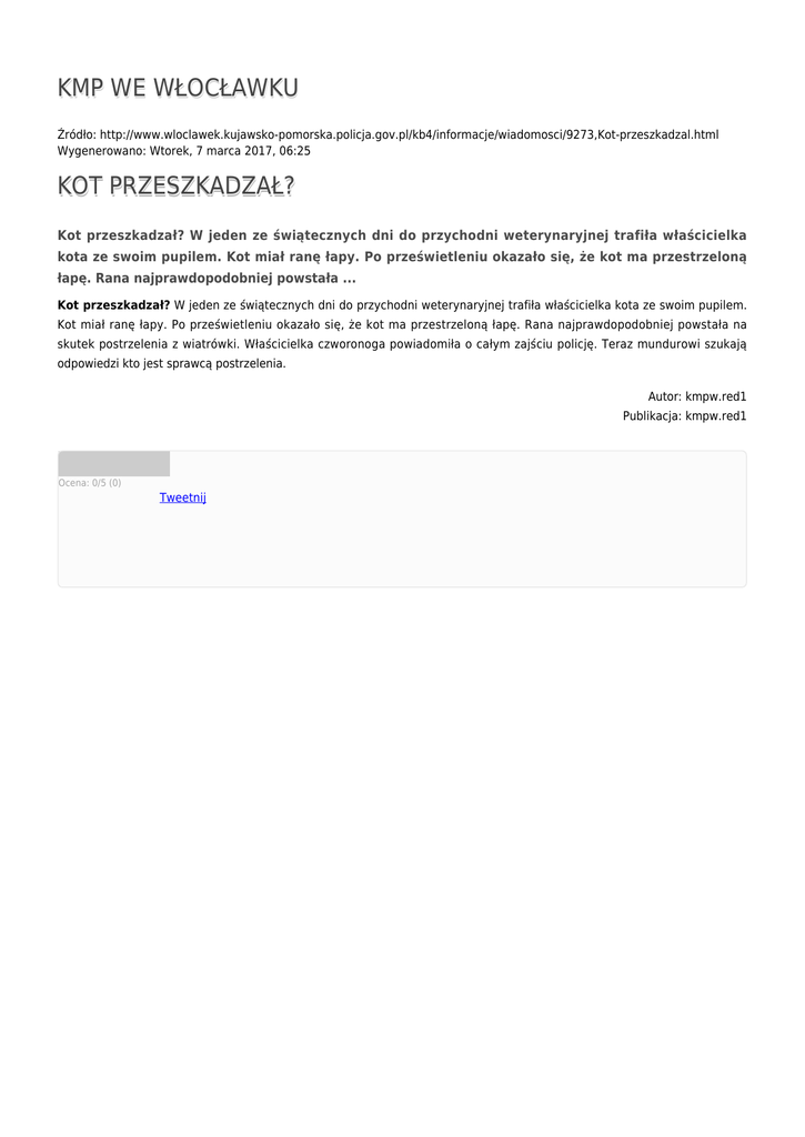 KMP WE WŁOCŁAWKU Źródło: http://www.wloclawek.kujawsko-pomorska.policja.gov.pl/kb4/informacje/wiadomosci/9273,Kot-przeszkadzal.html Wygenerowano: Wtorek, 7 marca 2017, 06:25 KOT PRZESZKADZAŁ? Kot przeszkadzał? W jeden ze świątecznych dni do przychodni weterynaryjnej trafiła właścicielka kota ze swoim pupilem. Kot miał ranę łapy. Po prześwietleniu okazało się, że kot ma przestrzeloną łapę. Rana najprawdopodobniej powstała ... Kot przeszkadzał? W jeden ze świątecznych dni do przychodni weterynaryjnej trafiła właścicielka kota ze swoim pupilem. Kot miał ranę łapy. Po prześwietleniu okazało się, że kot ma przestrzeloną łapę. Rana najprawdopodobniej powstała na skutek postrzelenia z wiatrówki. Właścicielka czworonoga powiadomiła o całym zajściu policję. Teraz mundurowi szukają odpowiedzi kto jest sprawcą postrzelenia. Autor: kmpw.red1 Publikacja: kmpw.red1 Ocena: 0/5 (0) Tweetnij