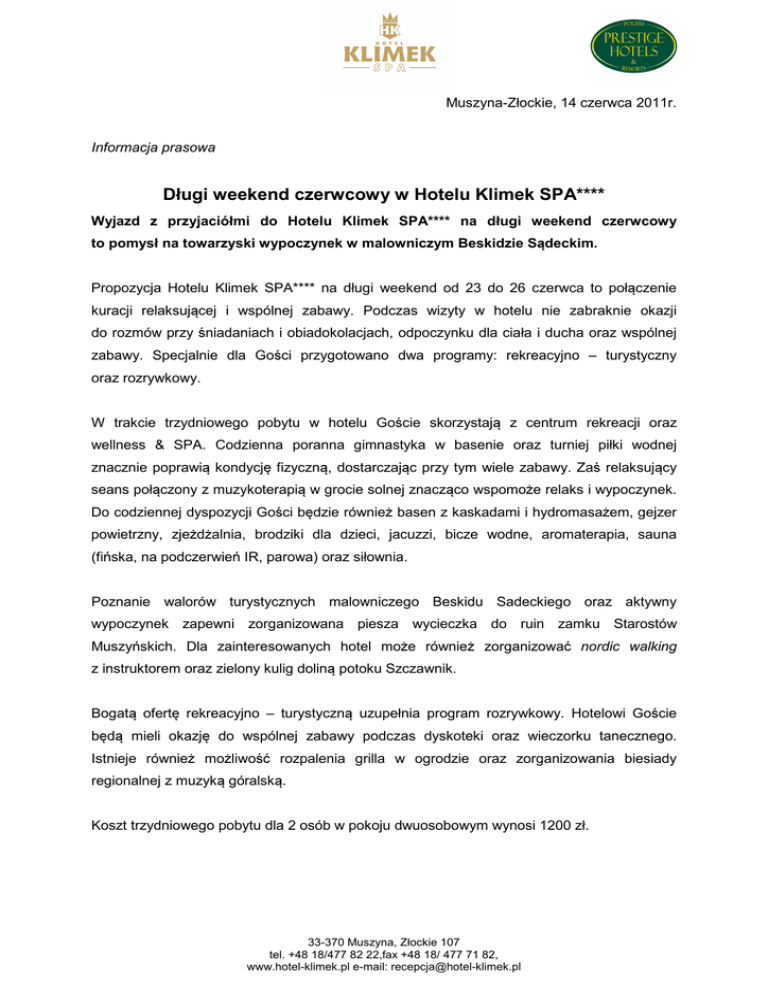Muszyna-Złockie, 14 czerwca 2011r. Informacja prasowa Długi weekend czerwcowy w Hotelu Klimek SPA**** Wyjazd z przyjaciółmi do Hotelu Klimek SPA**** na długi weekend czerwcowy to pomysł na towarzyski wypoczynek w malowniczym Beskidzie Sądeckim. Propozycja Hotelu Klimek SPA**** na długi weekend od 23 do 26 czerwca to połączenie kuracji relaksującej i wspólnej zabawy. Podczas wizyty w hotelu nie zabraknie okazji do rozmów przy śniadaniach i obiadokolacjach, odpoczynku dla ciała i ducha oraz wspólnej zabawy. Specjalnie dla Gości przygotowano dwa programy: rekreacyjno – turystyczny oraz rozrywkowy. W trakcie trzydniowego pobytu w hotelu Goście skorzystają z centrum rekreacji oraz wellness & SPA. Codzienna poranna gimnastyka w basenie oraz turniej piłki wodnej znacznie poprawią kondycję fizyczną, dostarczając przy tym wiele zabawy. Zaś relaksujący seans połączony z muzykoterapią w grocie solnej znacząco wspomoże relaks i wypoczynek. Do codziennej dyspozycji Gości będzie również basen z kaskadami i hydromasażem, gejzer powietrzny, zjeżdżalnia, brodziki dla dzieci, jacuzzi, bicze wodne, aromaterapia, sauna (fińska, na podczerwień IR, parowa) oraz siłownia. Poznanie walorów turystycznych malowniczego Beskidu Sadeckiego oraz aktywny wypoczynek zapewni zorganizowana piesza wycieczka do ruin zamku Starostów Muszyńskich. Dla zainteresowanych hotel może również zorganizować nordic walking z instruktorem oraz zielony kulig doliną potoku Szczawnik. Bogatą ofertę rekreacyjno – turystyczną uzupełnia program rozrywkowy. Hotelowi Goście będą mieli okazję do wspólnej zabawy podczas dyskoteki oraz wieczorku tanecznego. Istnieje również możliwość rozpalenia grilla w ogrodzie oraz zorganizowania biesiady regionalnej z muzyką góralską. Koszt trzydniowego pobytu dla 2 osób w pokoju dwuosobowym wynosi 1200 zł. 33-370 Muszyna, Złockie 107 tel. +48 18/477 82 22,fax +48 18/ 477 71 82, www.hotel-klimek.pl e-mail: [email protected]