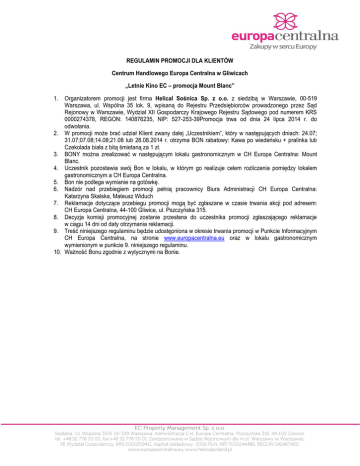 REGULAMIN PROMOCJI DLA KLIENTÓW Centrum Handlowego Europa Centralna w Gliwicach „Letnie Kino EC – promocja Mount Blanc” 1. Organizatorem promocji jest firma Helical Sośnica Sp. z o.o. z siedzibą w Warszawie, 00-519 Warszawa, ul. Wspólna 35 lok. 9, wpisaną do Rejestru Przedsiębiorców prowadzonego przez Sąd Rejonowy w Warszawie, Wydział XII Gospodarczy Krajowego Rejestru Sądowego pod numerem KRS 0000274378, REGON: 140876235, NIP: 527-253-39Promocja trwa od dnia 24 lipca 2014 r. do odwołania. 2. W promocji może brać udział Klient zwany dalej „Uczestnikiem”, który w następujących dniach: 24.07; 31.07;07.08;14.08;21.08 lub 28.08.2014 r. otrzyma BON rabatowy: Kawa po wiedeńsku + pralinka lub Czekolada biała z bitą śmietaną za 1 zł. 3. BONY można zrealizować w następującym lokalu gastronomicznym w CH Europa Centralna: Mount Blanc. 4. Uczestnik pozostawia swój Bon w lokalu, w którym go realizuje celem rozliczenia pomiędzy lokalem gastronomicznym a CH Europa Centralna. 5. Bon nie podlega wymianie na gotówkę. 6. Nadzór nad przebiegiem promocji pełnią pracownicy Biura Administracji CH Europa Centralna: Katarzyna Skalska, Mateusz Widuch 7. Reklamacje dotyczące przebiegu promocji mogą być zgłaszane w czasie trwania akcji pod adresem: CH Europa Centralna, 44-100 Gliwice, ul. Pszczyńska 315. 8. Decyzja komisji promocyjnej zostanie przesłana do uczestnika promocji zgłaszającego reklamacje w ciągu 14 dni od daty otrzymania reklamacji. 9. Treść niniejszego regulaminu będzie udostępniona w okresie trwania promocji w Punkcie Informacyjnym CH Europa Centralna, na stronie www.europacentralna.eu oraz w lokalu gastronomicznym wymienionym w punkcie 9. niniejszego regulaminu. 10. Ważność Bonu zgodnie z wytycznymi na Bonie.