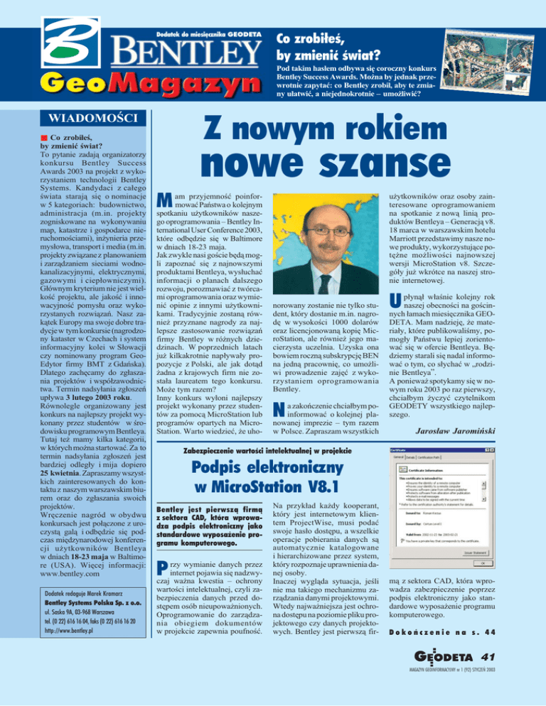 Dodatek do miesiêcznika GEODETA Co zrobi³eœ, by zmieniæ œwiat? Pod takim has³em odbywa siê coroczny konkurs Bentley Success Awards. Mo¿na by jednak przewrotnie zapytaæ: co Bentley zrobi³, aby te zmiany u³atwiæ, a niejednokrotnie – umo¿liwiæ? Z nowym rokiem WIADOMOŒCI ■ Co zrobi³eœ, by zmieniæ œwiat? To pytanie zadaj¹ organizatorzy konkursu Bentley Success Awards 2003 na projekt z wykorzystaniem technologii Bentley Systems. Kandydaci z ca³ego œwiata staraj¹ siê o nominacje w 5 kategoriach: budownictwo, administracja (m.in. projekty zogniskowane na wykonywaniu map, katastrze i gospodarce nieruchomoœciami), in¿ynieria przemys³owa, transport i media (m.in. projekty zwi¹zane z planowaniem i zarz¹dzaniem sieciami wodnokanalizacyjnymi, elektrycznymi, gazowymi i ciep³owniczymi). G³ównym kryterium nie jest wielkoœæ projektu, ale jakoœæ i innowacyjnoœæ pomys³u oraz wykorzystanych rozwi¹zañ. Nasz zak¹tek Europy ma swoje dobre tradycje w tym konkursie (nagrodzony kataster w Czechach i system informacyjny kolei w S³owacji czy nominowany program GeoEdytor firmy BMT z Gdañska). Dlatego zachêcamy do zg³aszania projektów i wspó³zawodnictwa. Termin nadsy³ania zg³oszeñ up³ywa 3 lutego 2003 roku. Równolegle organizowany jest konkurs na najlepszy projekt wykonany przez studentów w œrodowisku programowym Bentleya. Tutaj te¿ mamy kilka kategorii, w których mo¿na startowaæ. Za to termin nadsy³ania zg³oszeñ jest bardziej odleg³y i mija dopiero 25 kwietnia. Zapraszamy wszystkich zainteresowanych do kontaktu z naszym warszawskim biurem oraz do zg³aszania swoich projektów. Wrêczenie nagród w obydwu konkursach jest po³¹czone z uroczyst¹ gal¹ i odbêdzie siê podczas miêdzynarodowej konferencji u¿ytkowników Bentleya w dniach 18-23 maja w Baltimore (USA). Wiêcej informacji: www.bentley.com Dodatek redaguje Marek Kramarz Bentley Systems Polska Sp. z o.o. ul. Saska 9A, 03-968 Warszawa tel. (0 22) 616 16 04, faks (0 22) 616 16 20 http://www.bentley.pl nowe szanse M am przyjemnoœæ poinformowaæ Pañstwa o kolejnym spotkaniu u¿ytkowników naszego oprogramowania – Bentley International User Conference 2003, które odbêdzie siê w Baltimore w dniach 18-23 maja. Jak zwykle nasi goœcie bêd¹ mogli zapoznaæ siê z najnowszymi produktami Bentleya, wys³uchaæ informacji o planach dalszego rozwoju, porozmawiaæ z twórcami oprogramowania oraz wymieniæ opinie z innymi u¿ytkownikami. Tradycyjnie zostan¹ równie¿ przyznane nagrody za najlepsze zastosowanie rozwi¹zañ firmy Bentley w ró¿nych dziedzinach. W poprzednich latach ju¿ kilkakrotnie nap³ywa³y propozycje z Polski, ale jak dot¹d ¿adna z krajowych firm nie zosta³a laureatem tego konkursu. Mo¿e tym razem? Inny konkurs wy³oni najlepszy projekt wykonany przez studentów za pomoc¹ MicroStation lub programów opartych na MicroStation. Warto wiedzieæ, ¿e uho- u¿ytkowników oraz osoby zainteresowane oprogramowaniem na spotkanie z now¹ lini¹ produktów Bentleya – Generacj¹ v8. 18 marca w warszawskim hotelu Marriott przedstawimy nasze nowe produkty, wykorzystuj¹ce potê¿ne mo¿liwoœci najnowszej wersji MicroStation v8. Szczegó³y ju¿ wkrótce na naszej stronie internetowej. norowany zostanie nie tylko student, który dostanie m.in. nagrodê w wysokoœci 1000 dolarów oraz licencjonowan¹ kopiê MicroStation, ale równie¿ jego macierzysta uczelnia. Uzyska ona bowiem roczn¹ subskrypcjê BEN na jedn¹ pracowniê, co umo¿liwi prowadzenie zajêæ z wykorzystaniem oprogramowania Bentley. N a zakoñczenie chcia³bym poinformowaæ o kolejnej planowanej imprezie – tym razem w Polsce. Zapraszam wszystkich U p³yn¹³ w³aœnie kolejny rok naszej obecnoœci na goœcinnych ³amach miesiêcznika GEODETA. Mam nadziejê, ¿e materia³y, które publikowaliœmy, pomog³y Pañstwu lepiej zorientowaæ siê w ofercie Bentleya. Bêdziemy starali siê nadal informowaæ o tym, co s³ychaæ w „rodzinie Bentleya”. A poniewa¿ spotykamy siê w nowym roku 2003 po raz pierwszy, chcia³bym ¿yczyæ czytelnikom GEODETY wszystkiego najlepszego. Jaros³aw Jaromiñski Zabezpieczenie wartoœci intelektualnej w projekcie Podpis elektroniczny w MicroStation V8.1 Bentley jest pierwsz¹ firm¹ z sektora CAD, która wprowadza podpis elektroniczny jako standardowe wyposa¿enie programu komputerowego. P rzy wymianie danych przez internet pojawia siê nadzwyczaj wa¿na kwestia – ochrony wartoœci intelektualnej, czyli zabezpieczenia danych przed dostêpem osób nieupowa¿nionych. Oprogramowanie do zarz¹dzania obiegiem dokumentów w projekcie zapewnia poufnoœæ. Na przyk³ad ka¿dy kooperant, który jest internetowym klientem ProjectWise, musi podaæ swoje has³o dostêpu, a wszelkie operacje pobierania danych s¹ automatycznie katalogowane i hierarchizowane przez system, który rozpoznaje uprawnienia danej osoby. Inaczej wygl¹da sytuacja, jeœli nie ma takiego mechanizmu zarz¹dzania danymi projektowymi. Wtedy najwa¿niejsza jest ochrona dostêpu na poziomie pliku projektowego czy danych projektowych. Bentley jest pierwsz¹ fir- m¹ z sektora CAD, która wprowadza zabezpieczenie poprzez podpis elektroniczny jako standardowe wyposa¿enie programu komputerowego. Dokoñczenie na s. 44 41 MAGAZYN GEOINFORMACYJNY nr 1 (92) STYCZEÑ 2003 Co zrobi³eœ, by zmieniæ œwiat? œwiata. Nowe narzêdzia zmieniaj¹ sposób myœlenia i dzia³ania. Kiedyœ projektant musia³ zobaczyæ oczyma Pod takim has³em odbywa siê coroczny konkurs Bentley Success Awards. Mo¿na by jednak przewrotnie zapytaæ: co Bentley zrobi³, aby te zmiany u³atwiæ, a niejednokrotnie – umo¿liwiæ? Albo inaczej: Jakie atuty umo¿liwi³y organizacji – zatrudniaj¹cej na ca³ym œwiecie ponad 1300 osób, maj¹cej 300 000 u¿ytkowników i roczn¹ sprzeda¿ na poziomie ok. 220 mln dolarów – dostosowanie siê do zmian na rynku IT, a w czasach kryzysu z³o¿enie wniosku o wejœcie na gie³dê nowojorsk¹ – New York Stock Exchange? A 