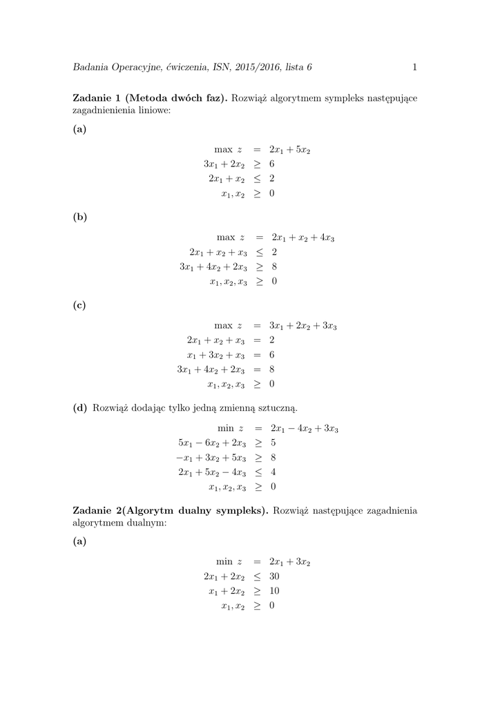 Badania Operacyjne, ćwiczenia, ISN, 2015/2016, lista 6 1 Zadanie 1 (Metoda dwóch faz). Rozwiąż algorytmem sympleks następujące zagadnienienia liniowe: (a) max z 3x1 + 2x2 2x1 + x2 x1 , x2 = ≥ ≤ ≥ 2x1 + 5x2 6 2 0 max z 2x1 + x2 + x3 3x1 + 4x2 + 2x3 x1 , x2 , x3 = ≤ ≥ ≥ 2x1 + x2 + 4x3 2 8 0 max z 2x1 + x2 + x3 x1 + 3x2 + x3 3x1 + 4x2 + 2x3 x1 , x2 , x3 = = = = ≥ 3x1 + 2x2 + 3x3 2 6 8 0 (b) (c) (d) Rozwiąż dodając tylko jedną zmienną sztuczną. min z 5x1 − 6x2 + 2x3 −x1 + 3x2 + 5x3 2x1 + 5x2 − 4x3 x1 , x2 , x3 = ≥ ≥ ≤ ≥ 2x1 − 4x2 + 3x3 5 8 4 0 Zadanie 2(Algorytm dualny sympleks). Rozwiąż następujące zagadnienia algorytmem dualnym: (a) min z 2x1 + 2x2 x1 + 2x2 x1 , x2 = ≤ ≥ ≥ 2x1 + 3x2 30 10 0 Badania Operacyjne, ćwiczenia, ISN, 2015/2016, lista 6 2 (b) min z x1 + x2 4x1 + x2 x1 , x2 = ≥ ≥ ≥ 5x1 + 6x2 2 4 0 min z x1 + x2 3x1 − x2 x1 , x2 = = ≥ ≥ 4x1 + 2x2 1 2 0 min z 2x1 + x2 x1 + x2 x1 , x2 = ≥ = ≥ 2x1 + 3x2 3 2 0 (c) (d) (e) max z 2x1 + 3x2 − 5x3 −x1 + 9x2 − x3 4x1 − 6x2 − 3x3 x1 , x2 , x3 = ≥ ≥ ≤ ≥ 2x1 − x2 + x3 4 3 8 0 Wskazówka! Dodaj do początkowej tablicy sympleksowej ograniczenia x1 + x3 ≤ M (gdzie M jest dostatecznie dużą liczbą) i następnie wykorzystaj to ograniczenie jako wiersz centralny biorąc x1 jako zmienną wchodzacą. Zastosuj teraz algorytm dualny. Zadanie 3. Rozwiąż trzema metodami zagadnienie następujące zagadnienie liniowe: min z 5x1 + 6x2 − 3x3 + 4x4 x2 − 5x3 − 6x4 2x1 + 5x2 + x3 + x4 x1 , x2 , x3 , x4 = ≥ ≥ ≥ ≥ 6x1 + 7x2 + 3x3 + 5x4 12 10 8 0 Badania Operacyjne, ćwiczenia, ISN, 2015/2016, lista 6 3 Zadanie 4(Dualność). (a) Zapisz zagadnienie dualne do następującego: min z x1 + x2 + x3 + x4 x1 + x3 + x4 x1 − x4 x1 , x2 , x4 = ≥ ≤ = ≥ 2x1 + 3x2 + 4x3 + 5x4 0 0 1 0 (b) Na podstawie zagadnienia dualnego wyznacz optymalną wartość funkcji celu zadania: min z = n X ixi i=1 k X xi ≥ k, k=1,. . . ,n i=1 xi ≥ 0, i=1,. . . ,n (c) Wykorzystując twierdzenie o warunkach komplementarnych sprawdzić, czy wektor x = [1, 0, 1]T jest rozwiązaniem optymalnych zadania: max z x1 + x2 + 4x3 x1 − x2 + 2x3 x1 , x2 , x3 = = = ≥ x1 + 8x2 + 10x3 2 0 0 Zadanie 5(Zakresy cen dualnych i współczynników funkcji celu). Dla następującego zadania liniowego: max z 2x1 + 5x2 + x3 + 2x4 + 4x5 5x1 + 4x2 + 3x3 + 5x4 + x5 4x1 + 2x2 + x3 + 3x4 + 6x5 x1 + 2x2 + x4 + 2x5 x1 , x2 , x3 , x4 , x5 = ≤ ≤ ≤ ≤ ≥ 78x1 + 72x2 + 18x3 + 72x4 + 10x5 606 1158 624 156 0 optymalną jest następująca tablica sympleksowa: Badania Operacyjne, ćwiczenia, ISN, 2015/2016, lista 6 cB 0 72 18 78 xB Z s1 x4 x3 x1 x1 x2 x3 x4 0 24 0 0 0 3 0 0 0 4 0 1 0 -2 1 0 1 -2 0 0 4 x5 s 1 s2 s3 s4 98 0 4 6 34 13680 3 1 − 13 0 − 13 168 1 7 -1 0 126 -1 3 3 1 5 -3 0 126 0 −3 3 1 4 3 0 −3 1 −3 30 (a) Podaj rozwiazanie optymalne problemu, sformułuj problem dualny i odczytaj rozwiązanie optymalne zagadnienia dualnego z tablicy. (b) Jak zmieni się rozwiązanie optymalne, gdy wektor współczynników funkcji celu zastąpimy wektorem c=[60,40,36,60,10] a jak wektorem c=[60,40,36,60,21]? (c) Wyznacz zmiany współcznników funkcji celu, przy których otrzymane bazowe rozwiązanie pozostaje optymalnym. (d) Jak zmieni się rozwiązanie optymalne, gdy wektor wyrazów wolnych b zastąpimy wektorem b=[600,1200,600,144] a jak wektorem b=[780,696,574,150]? (e) Wyznacz zakresy cen dualnych. Zadanie 6. Dla następującego zadania liniowego: max z x1 − 2x2 + x4 x2 + x3 − 2x4 3x2 + x4 + x5 x1 , x2 , x3 , x4 , x5 = = = = ≥ −x1 − 2x2 + 3x3 − 3x4 3 5 4 0 optymalną jest następująca tablica sympleksowa: cB xB Z -3 x4 3 x3 -2 x2 x1 x2 x3 x4 x5 4.8 0 0 0 0.2 24.2 0.6 0 0 1 0.4 3.4 1.4 0 1 0 0.6 11.6 -0.2 1 0 0 0.2 0.2 (a) Dla jakich wartości współczynnika c6 dołączenie zmiennej x6 z wektorem a6 = [1, 2, 0.5]T nie zmieni bazy optymalnej? (b) Czy i jak zmieni się rozwiązanie optymalne, gdy do zadania dołączymy nowy warunek x1 + 2x2 + 3x3 + x4 ≤ 35?