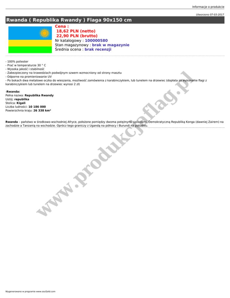 Informacje o produkcie Utworzono 07-03-2017 Rwanda ( Republika Rwandy ) Flaga 90x150 cm Cena : 18,62 PLN (netto) 22,90 PLN (brutto) Nr katalogowy : 100000580 Stan magazynowy : brak w magazynie Średnia ocena : brak recenzji .p l - 100% poliester - Prać w temperaturze 30 ° C - Wysoka jakość i stabilność - Zabezpieczony na krawedziach podwójnym szwem wzmocniony od strony masztu - Odporne na promieniowanie UV - Po bokach dwa metalowe oczka do wieszania, mozliwość zamówienia z karabinczykiem, lub tunelem na drzewiec (dopłata za wykonanie flagi z karabinczykiem lub tunelem na drzewiec wynosi 2 zł) af la g -Rwanda: Pełna nazwa: Republika Rwandy Ustój: republika Stolica: Kigali Liczba ludności: 10 186 000 Powierzchnia kraju: 26 338 km² w w w .p ro du kc j Rwanda – państwo w środkowo-wschodniej Afryce, położone pomiędzy dwoma potężnymi sąsiadami, Demokratyczną Republiką Konga (dawniej Zairem) na zachodzie a Tanzanią na wschodzie. Oprócz tego graniczy z Ugandą na północy i Burundi na południu. Wygenerowano w programie www.oscGold.com