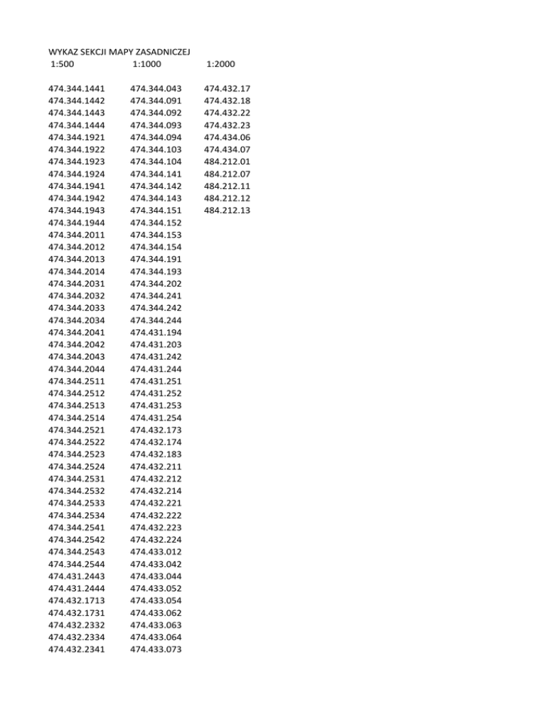 WYKAZ SEKCJI MAPY ZASADNICZEJ 1:500 1:1000 474.344.1441 474.344.1442 474.344.1443 474.344.1444 474.344.1921 474.344.1922 474.344.1923 474.344.1924 474.344.1941 474.344.1942 474.344.1943 474.344.1944 474.344.2011 474.344.2012 474.344.2013 474.344.2014 474.344.2031 474.344.2032 474.344.2033 474.344.2034 474.344.2041 474.344.2042 474.344.2043 474.344.2044 474.344.2511 474.344.2512 474.344.2513 474.344.2514 474.344.2521 474.344.2522 474.344.2523 474.344.2524 474.344.2531 474.344.2532 474.344.2533 474.344.2534 474.344.2541 474.344.2542 474.344.2543 474.344.2544 474.431.2443 474.431.2444 474.432.1713 474.432.1731 474.432.2332 474.432.2334 474.432.2341 474.344.043 474.344.091 474.344.092 474.344.093 474.344.094 474.344.103 474.344.104 474.344.141 474.344.142 474.344.143 474.344.151 474.344.152 474.344.153 474.344.154 474.344.191 474.344.193 474.344.202 474.344.241 474.344.242 474.344.244 474.431.194 474.431.203 474.431.242 474.431.244 474.431.251 474.431.252 474.431.253 474.431.254 474.432.173 474.432.174 474.432.183 474.432.211 474.432.212 474.432.214 474.432.221 474.432.222 474.432.223 474.432.224 474.433.012 474.433.042 474.433.044 474.433.052 474.433.054 474.433.062 474.433.063 474.433.064 474.433.073 1:2000 474.432.17 474.432.18 474.432.22 474.432.23 474.434.06 474.434.07 484.212.01 484.212.07 484.212.11 484.212.12 484.212.13 474.432.2343 474.432.2344 474.433.0422 474.433.0424 474.433.0511 474.433.0512 474.433.0513 474.433.0514 474.433.0521 474.433.0523 474.433.0531 474.433.0532 474.433.0533 474.433.0534 474.433.1134 474.433.1144 474.433.1221 474.433.1222 474.433.1223 474.433.1224 474.433.1311 474.433.1334 474.433.1341 474.433.1342 474.433.1343 474.433.1344 474.433.1414 474.433.1422 474.433.1423 474.433.1424 474.433.1431 474.433.1432 474.433.1433 474.433.1441 474.433.1442 474.433.1542 474.433.1543 474.433.1544 474.433.1622 474.433.1624 474.433.1631 474.433.1632 474.433.1633 474.433.1634 474.433.1641 474.433.1642 474.433.1643 474.433.1644 474.433.1711 474.433.1713 474.433.092 474.433.093 474.433.094 474.433.101 474.433.102 474.433.103 474.433.104 474.433.111 474.433.112 474.433.113 474.433.114 474.433.121 474.433.123 474.433.124 474.433.132 474.433.141 474.433.143 474.433.152 474.433.161 474.433.162 474.433.173 474.433.174 474.433.181 474.433.183 474.433.212 474.433.214 474.433.221 474.433.222 474.433.223 474.433.224 474.434.011 474.434.012 474.434.013 474.434.014 474.434.021 474.434.022 474.434.023 474.434.024 474.434.132 474.434.174 474.434.182 474.434.184 474.434.222 474.434.224 484.122.042 484.122.053 484.122.101 484.122.102 484.122.104 484.211.012 474.433.1714 474.433.1721 474.433.1722 474.433.1723 474.433.1724 474.433.1811 474.433.1812 474.433.1813 474.433.1814 474.433.1821 474.433.1822 474.433.1823 474.433.1824 474.433.1832 474.433.1834 474.433.1841 474.433.1842 474.433.1843 474.433.1844 474.433.1911 474.433.1912 474.433.1913 474.433.1914 474.433.1921 474.433.1922 474.433.1923 474.433.1924 474.433.1931 474.433.1932 474.433.1933 474.433.1934 474.433.1941 474.433.1942 474.433.1943 474.433.1944 474.433.2011 474.433.2012 474.433.2013 474.433.2014 474.433.2021 474.433.2022 474.433.2023 474.433.2024 474.433.2031 474.433.2032 474.433.2033 474.433.2041 474.433.2042 474.433.2111 474.433.2112 484.211.014 484.211.021 484.211.023 484.211.024 484.211.033 484.211.034 484.211.043 484.211.061 484.211.062 484.211.063 484.211.064 484.211.071 484.211.072 484.211.081 484.211.082 484.211.091 484.211.093 484.211.094 484.211.102 484.211.111 484.211.112 484.211.142 484.211.151 484.211.153 484.211.201 484.211.203 484.211.204 484.211.252 484.211.254 484.212.014 484.212.021 484.212.023 484.212.061 484.212.063 484.212.064 484.212.213 484.212.214 484.214.011 484.214.012 484.214.014 484.214.023 474.433.2113 474.433.2114 474.433.2131 474.433.2132 474.433.2133 474.433.2134 474.433.2143 474.433.2244 474.433.2311 474.433.2312 474.433.2313 474.433.2314 474.433.2321 474.433.2322 474.433.2323 474.433.2324 474.433.2331 474.433.2332 474.433.2333 474.433.2334 474.433.2341 474.433.2342 474.433.2343 474.433.2344 474.433.2411 474.433.2412 474.433.2413 474.433.2414 474.433.2421 474.433.2422 474.433.2423 474.433.2424 474.433.2431 474.433.2432 474.433.2433 474.433.2434 474.433.2441 474.433.2442 474.433.2443 474.433.2444 474.433.2511 474.433.2512 474.433.2513 474.433.2514 474.434.0311 474.434.0312 474.434.0313 474.434.0314 474.434.0321 474.434.0322 474.434.0323 474.434.0324 474.434.0331 474.434.0332 474.434.0333 474.434.0334 474.434.0341 474.434.0342 474.434.0343 474.434.0344 474.434.0411 474.434.0413 474.434.0414 474.434.0431 474.434.0432 474.434.0433 474.434.0434 474.434.0443 474.434.0634 474.434.0641 474.434.0642 474.434.0643 474.434.0644 474.434.0723 474.434.0724 474.434.0731 474.434.0732 474.434.0733 474.434.0734 474.434.0741 474.434.0742 474.434.0743 474.434.0744 474.434.0811 474.434.0812 474.434.0813 474.434.0814 474.434.0821 474.434.0822 474.434.0823 474.434.0824 474.434.0831 474.434.0832 474.434.0834 474.434.0842 474.434.0911 474.434.0912 474.434.0913 474.434.0914 474.434.0921 474.434.0923 474.434.0924 474.434.0931 474.434.0932 474.434.0941 474.434.0942 474.434.1312 474.434.1314 474.434.1831 474.434.1832 474.434.1833 474.434.1834 474.434.2311 474.434.2312 474.434.2313 474.434.2314 474.434.2321 474.434.2323 474.434.2331 484.122.0511 484.122.0512 484.122.0513 484.122.0514 484.122.0521 484.122.0522 484.122.0523 484.122.0524 484.122.0541 484.122.0542 484.122.0543 484.122.0544 484.211.0111 484.211.0112 484.211.0113 484.211.0114 484.211.0131 484.211.0132 484.211.0133 484.211.0134 484.211.0221 484.211.0222 484.211.0223 484.211.0224 484.211.0241 484.211.0243 484.211.0311 484.211.0312 484.211.0313 484.211.0314 484.211.0321 484.211.0322 484.211.0323 484.211.0324 484.211.0331 484.211.0342 484.211.0411 484.211.0412 484.211.0413 484.211.0414 484.211.0421 484.211.0422 484.211.0423 484.211.0511 484.211.0513 484.211.0531 484.211.0533 484.211.0534 484.211.0611 484.211.0613 484.211.0631 484.211.1011 484.211.1012 484.211.1013 484.211.1014 