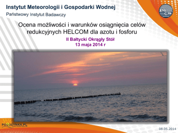 Ocena możliwości i warunków osiągnięcia celów redukcyjnych HELCOM dla azotu i fosforu II Bałtycki Okrągły Stół 13 maja 2014 r 08.05.2014 Deklaracja Ministrów HELCOM w Kopenhadze • „Raport podsumowujący opracowanie zweryfikowanych maksymalnych dopuszczalnych ładunków (MAI) i uaktualnionego podziału celów redukcyjnych pomiędzy kraje (CART) - załącznik do Deklaracji Ministrów w Kopenhadze, określa poziom oczekiwanych redukcji ładunków azotu i fosforu ogólnego odprowadzanego przez Kraje Członkowskie HELCOM, wodami do Morza Bałtyckiego. • Oczekiwane na rok 2021 redukcje, określono w stosunku do średnich znormalizowanych rocznych ładunków odprowadzanych przez Kraje Członkowskie do wód Bałtyku w okresie referencyjnym 1997-2003. • Oczekiwane redukcje w stosunku do Polski wynoszą odpowiednio 43 610 t azotu (z czego redukcja ładunku odprowadzanego wodami stanowi 39 257 t azotu) i 7 480 t fosforu . • Oczekiwane redukcje powodują, że docelowy roczny ładunek jaki Polska może odprowadzać do Bałtyku Właściwego wodami, powinien osiągnąć, w roku 2021 poziom 153 600 t azotu oraz ok. 4.400 t fosforu. tytuł slajdu 3 4 tytuł slajdu 5 6 Ładunki azotu i fosforu (faktyczne i znormalizowane) odprowadzane do Bałtyku w latach bilansowych PLC Rok Odpływ Roczny ładunek Roczny ładunek km3/rok Obliczony t/rok Znormalizowany t/rok Azot Fosfor Azot Fosfor 1995 59,4 219 202 14 144 227 080 14 651 2000 66,3 190 811 12 493 177 224 11 606 2006 52,0 151 684 10 164 179 321 12 009 2012 44,4 106 739 6 853 147 324 9 448 Bilanse biogenów odprowadzonych do wód na polskim obszarze zlewni Bałtyku w latach 2000, 2006 i 2012 LP. ŹRÓDŁA ZANIECZYSZCZENIA 1. 2. ŁĄCZNIE 3. ludność 4. rolnictwo 5 kanalizacja** deszczowa tło 6. OBSZAROWE AZOT [N] T/R PLC-4 PLC-5 229 991 FOSFOR [P] T/R PLC- 6 PLC-4 PLC-5 PLC-6 251 776 210768 18 725 18 977 15 269 188 649 211 459 176 076 13 256 15 173 11 617 39 159 33 829 20 876 1 780 2 110 1 898 102 488 121 754 89 881 8 328 10 123 4 942 16 340 47 002 31 374 32 314 7 272 1 401 3 148 2 117 2 582 5 698 187 163 17 231 10 967 637 631 8. depozycja atmosferyczna* transgraniczne* 9. PUNKTOWE 41 342 40 317 34 692 5 469 3 804 3 652 10. komunalne 37 995 34 053 29 704 5 037 3 546 3 510 11. przemysłowe 3 268 5 311 4 173 418 184 75 12. ośrodki hodowli ryb 79 26 250 14 3 30 13. zrzuty bezpośrednie 928 565 71 37 7. Ładunki azotu odprowadzane do wód na polskim obszarze zlewni Bałtyku w roku 2012 tys. t/rok 9 Ładunki fosforu odprowadzane do wód na polskim obszarze zlewni Bałtyku w roku 2012 tys. t/rok tytuł slajdu 10 Porównanie oczekiwanych redukcji ze stanem aktualnym zanieczyszczenia wód • Docelowy roczny ładunek jaki Polska może odprowadzać do Bałtyku wodami powinien osiągnąć w roku 2021 poziom 153 600 t azotu oraz 4.400 t fosforu. • Przy obserwowanych, w ostatnim dwudziestoleciu, średnim odpływie wód z Polski wynoszącym ok. 61,5 km3/rok, wymagane dla osiągnięcia wyznaczonego celu stężenia to: 2,50mg/l azotu oraz 0,072 mg/l fosforu. Średnie stężenia azotu w przekrojach odpływowych Wisły (w Kiezmarku) i Odry (Krajniku) w okresie 1992-2012, N mg/l 5,5 Wisła 5 Odra 4,5 Liniowy (Odra) Liniowy (Wisła) 4 y = -0,0816x + 4,4195 3,5 3 y = -0,0669x + 3,5338 2,5 2 1,5 1 0,5 2012 2011 2010 2009 2008 2007 2006 2005 2004 2003 2002 2001 2000 1999 1998 1997 1996 1995 1994 1993 1992 0 Średnie stężenia azotu, w latach 1994 – 2012, w polskich rzekach w oparciu o 105-243pp sprawozdawanych do UE - WISE SoE. mgN/l 5,5 5,0 4,5 4,51 4,0 3,83 3,5 3,50 3,0 2,5 2,53 2,0 1,5 1,0 0,5 Lata 2012 2011 2009 2008 2007 2006 2005 2004 2003 2002 2001 2000 1999 1998 1997 1996 1995 1994 0,0 Średnie stężenia fosforu w przekrojach odpływowych Wisły (w Kiezmarku) i Odry (Krajniku) w okresie 1992-2012, P mg/l 0,45 Wisła 0,40 Odra 0,35 Liniowy (Odra) 0,30 Liniowy (Wisła) y = -0,0137x + 0,3995 0,25 0,20 y = -0,0029x + 0,2226 0,15 0,10 0,05 2012 2011 2010 2009 2008 2007 2006 2005 2004 2003 2002 2001 2000 1999 1998 1997 1996 1995 1994 1993 1992 0,00 rok Średnie stężenia fosforu, w latach 1994 – 2012, w polskich rzekach w oparciu o 105-243pp sprawozdawanych do UE - WISE SoE. mgP/l 0,9 0,8 0,7 0,6 0,5 0,455 0,4 0,343 0,3 0,220 0,253 0,2 0,1 Lata 2012 2011 2009 2008 2007 2006 2005 2004 2003 2002 2001 2000 1999 1998 1997 1996 1995 1994 1993 1992 0 Profile podłużne - średnie stężenia fosforu ogólnego w przekrojach badawczych Wisły w latach 1994, 2001, 2008 mg P/l 1,10 1,00 Rok 1994 0,90 Rok 2001 0,80 Rok 2008 0,70 0,60 0,50 0,40 0,30 0,20 0,10 10 00 95 0 90 0 85 0 80 0 75 0 70 0 65 0 60 0 55 0 50 0 45 0 40 0 35 0 30 0 25 0 20 0 15 0 10 0 50 0 -50 -10 0 0,00 km Średnie roczne stężenia fosforu ogólnego w niemieckich rzekach w latach 1982-2005. (146 punktów WISE SoE) mgP/l 1 0,9 0,8 0,7 0,6 0,5 0,4 0,3 0,2 0,1 lata 20 04 20 02 20 00 19 98 19 96 19 94 19 92 19 90 19 88 19 86 19 84 19 82 0 Podsumowanie • Aktualnie gromadzone w Polsce dane nie dają podstaw do określenia teoretycznie możliwej redukcji ładunku fosforu odprowadzanego z obszaru Polski do Morza. • Określenie tej wartości wymaga: zwiększenia częstotliwości pomiarów stężeń w przekrojach przyujściowych Wisły i Odry wyznaczenia obszarów bezpośrednio oddziaływujących na Bałtyk na terenie zlewni największych rzek Kraju (Odry i Wisły). dokładnej informacji o ładunkach pochodzących z punktowych i obszarowych źródeł zanieczyszczeń na wyznaczonych obszarach. opracowania szczegółowego planu działań dla maksymalnie efektywnego ograniczenia ładunków z tych obszarów . określenia kosztów i harmonogramu czasowego zaplanowanych działań. Podsumowanie cd • Szacunkowe analizy danych monitoringu rzek wskazują, że docelowy osiągalny znormalizowany ładunek fosforu odprowadzany z obszaru Polski do Bałtyku może przypuszczalnie osiągnąć poziom 6000-6500 t P w perspektywie 15–20 lat. • Osiągnięcie tego poziomu wymaga zespolonych działań resortó