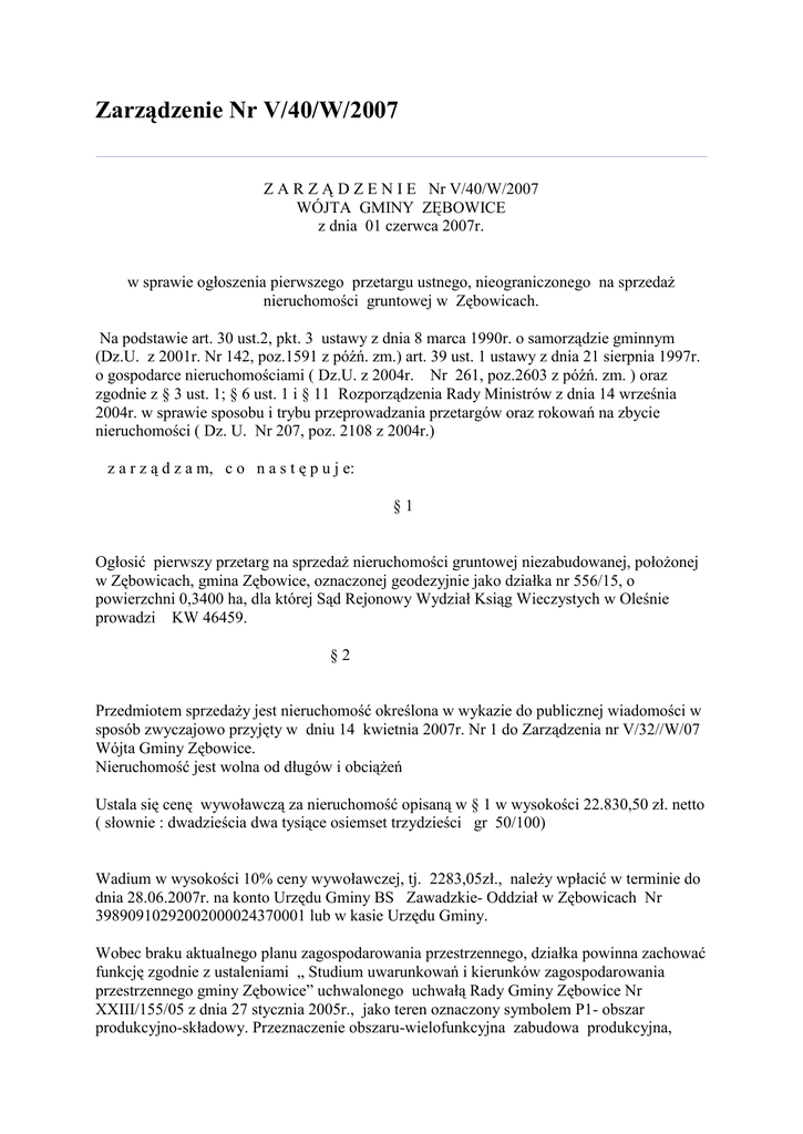 Zarządzenie Nr V/40/W/2007 Z A R Z Ą D Z E N I E Nr V/40/W/2007 WÓJTA GMINY ZĘBOWICE z dnia 01 czerwca 2007r. w sprawie ogłoszenia pierwszego przetargu ustnego, nieograniczonego na sprzedaż nieruchomości gruntowej w Zębowicach. Na podstawie art. 30 ust.2, pkt. 3 ustawy z dnia 8 marca 1990r. o samorządzie gminnym (Dz.U. z 2001r. Nr 142, poz.1591 z późń. zm.) art. 39 ust. 1 ustawy z dnia 21 sierpnia 1997r. o gospodarce nieruchomościami ( Dz.U. z 2004r. Nr 261, poz.2603 z późń. zm. ) oraz zgodnie z § 3 ust. 1; § 6 ust. 1 i § 11 Rozporządzenia Rady Ministrów z dnia 14 września 2004r. w sprawie sposobu i trybu przeprowadzania przetargów oraz rokowań na zbycie nieruchomości ( Dz. U. Nr 207, poz. 2108 z 2004r.) z a r z ą d z a m, c o n a s t ę p u j e: §1 Ogłosić pierwszy przetarg na sprzedaż nieruchomości gruntowej niezabudowanej, położonej w Zębowicach, gmina Zębowice, oznaczonej geodezyjnie jako działka nr 556/15, o powierzchni 0,3400 ha, dla której Sąd Rejonowy Wydział Ksiąg Wieczystych w Oleśnie prowadzi KW 46459. §2 Przedmiotem sprzedaży jest nieruchomość określona w wykazie do publicznej wiadomości w sposób zwyczajowo przyjęty w dniu 14 kwietnia 2007r. Nr 1 do Zarządzenia nr V/32//W/07 Wójta Gminy Zębowice. Nieruchomość jest wolna od długów i obciążeń Ustala się cenę wywoławczą za nieruchomość opisaną w § 1 w wysokości 22.830,50 zł. netto ( słownie : dwadzieścia dwa tysiące osiemset trzydzieści gr 50/100) Wadium w wysokości 10% ceny wywoławczej, tj. 2283,05zł., należy wpłacić w terminie do dnia 28.06.2007r. na konto Urzędu Gminy BS Zawadzkie- Oddział w Zębowicach Nr 39890910292002000024370001 lub w kasie Urzędu Gminy. Wobec braku aktualnego planu zagospodarowania przestrzennego, działka powinna zachować funkcję zgodnie z ustaleniami „ Studium uwarunkowań i kierunków zagospodarowania przestrzennego gminy Zębowice” uchwalonego uchwałą Rady Gminy Zębowice Nr XXIII/155/05 z dnia 27 stycznia 2005r., jako teren oznaczony symbolem P1- obszar produkcyjno-składowy. Przeznaczenie obszaru-wielofunkcyjna zabudowa produkcyjna, składowa, magazynowa handlu hurtowego oraz specjalistycznych działów produkcji rolnej i obsługi rolnictwa. Przetarg odbędzie się 02 lipca 2007r. o godz. : 10,00 w Urzędzie Gminy w biurze nr 12. Wpłacone wadium zostanie zaliczone na poczet ceny nabycia nieruchomości, lub zwrócone po zamknięciu przetargu. Skutkiem uchylenia się od zawarcia umowy sprzedaży będzie przepadek wadium zaliczonego na poczet ceny nabycia nieruchomości. Nabywca pokrywa 100 % kosztów poniesionych przez Gminę w toku postępowania zmierzającego do zbycia nieruchomości, w tym koszt zleconej przez Gminę wyceny oraz czynności geodezyjnych. Do podanej ceny netto doliczany będzie podatek VAT według stawki wynikającej z obowiązujących w tym zakresie przepisów. Termin do złożenia wniosku przez osoby, którym przysługuje pierwszeństwo w nabyciu nieruchomości na podstawie art. 34 ust. 1 pkt 2 : 6 tygodni od dnia ogłoszenia wykazu nieruchomości przeznaczonej do zbycia. Protokół z przetargu stanowi podstawę zawarcia aktu notarialnego. Bliższe informacje dot. nieruchomości będącej przedmiotem przetargu można uzyskać w Urzędzie Gminy Zębowice pok. 12 w godzinach pracy Urzędu. Osoba fizyczna lub prawna , która wygra przetarg, zobowiązana jest wpłacić jednorazowo kwotę uzyskaną w przetargu na konto Urzędu Gminy w Zębowicach najpóźniej w przeddzień sporządzenia aktu notarialnego, w BS Zawadzkie- Oddział Zębowice lub w kasie Urzędu Gminy w Zębowicach do godz. 12 şş . §3 Zarządzenie podlega ogłoszeniu na tablicy ogłoszeń w siedzibie Urzędu i na tablicach ogłoszeń w poszczególnych miejscowościach Gminy Zębowice, oraz na stronie internetowej w BIP. §4 Zarządzenie wchodzi w życie z dniem pojęcia. Wprowadzono: 2007-06-01 11:53:29 przez Waldemar Czaja Zatwierdzono: 2007-06-01 11:53:34 przez Waldemar Czaja