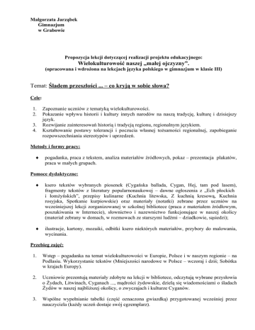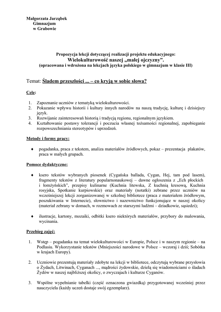 Małgorzata Jarząbek Gimnazjum w Grabowie Propozycja lekcji dotyczącej realizacji projektu edukacyjnego: Wielokulturowość naszej „małej ojczyzny”. (opracowana i wdrożona na lekcjach języka polskiego w gimnazjum w klasie III) Temat: Śladem przeszłości ... – co kryją w sobie słowa? Cele: 1. 2. 3. 4. Zapoznanie uczniów z tematyką wielokulturowości. Pokazanie wpływu historii i kultury innych narodów na naszą tradycję, kulturę i dzisiejszy język. Rozwijanie zainteresowań historią i tradycją regionu, regionalnym językiem. Kształtowanie postawy tolerancji i poczucia własnej tożsamości regionalnej, zapobieganie rozpowszechniania stereotypów i uprzedzeń. Metody i formy pracy: ♦ pogadanka, praca z tekstem, analiza materiałów źródłowych, pokaz – prezentacja plakatów, praca w małych grupach. Pomoce dydaktyczne: ♦ ksero tekstów wybranych piosenek (Cygańska ballada, Cygan, Hej, tam pod lasem), fragmenty tekstów z literatury popularnonaukowej – dawne ogłoszenia z „Ech płockich i łomżyńskich”, przepisy kulinarne (Kuchnia litewska, Z kuchnią kresową, Kuchnia rosyjska, Spotkanie kurpiowskie) oraz materiały (notatki) zebrane przez uczniów na wcześniejszej lekcji zorganizowanej w szkolnej bibliotece (praca z materiałem źródłowym, poszukiwania w Internecie), słownictwo i nazewnictwo funkcjonujące w naszej okolicy (materiał zebrany w domach, w rozmowach ze starszymi ludźmi – dziadkowie, sąsiedzi); ♦ ilustracje, kartony, mozaiki, odbitki ksero niektórych materiałów, przybory do malowania, wycinania. Przebieg zajęć: 1. Wstęp – pogadanka na temat wielokulturowości w Europie, Polsce i w naszym regionie – na Podlasiu. Wykorzystanie tekstów (Mniejszości narodowe w Polsce – wczoraj i dziś; Sobótka w krajach Europy). 2. Uczniowie prezentują materiały zdobyte na lekcji w bibliotece, odczytują wybrane przysłowia o Żydach, Litwinach, Cyganach ..., mądrości żydowskie, dzielą się wiadomościami o śladach Żydów w naszej najbliższej okolicy, o zwyczajach i kulturze Cyganów. 3. Wspólne wypełnianie tabelki (część oznaczona gwiazdką) przygotowanej wcześniej przez nauczyciela (każdy uczeń dostaje swój egzemplarz). Słownictwo jako wyraz dziejów ▪ Charakterystyczne nazwiska, sposób nazywania mieszkańców Babowicz , Makarewicz (-icz) ▪ Romańczuk, Matejuk ▪ ▪ ▪ Konopczyna, Jarząbczyna braciak Mocarzuk, Wiszowaciuk, Laszczkowiak ▪ Stasiowa, Józkowa, Felkowa, Romkowa ... O czym świadczy.... * nazwiska zakończone na –icz, -uk mają obcy rodowód (dawne ziemie wschodnie) (-uk) - widać wyraźnie wpływy wschodniej tradycji np. białoruskie: Pietruk, gniaduk, dzieciuk, chojak, Truszkowiak, ▪ tak jak w Rosji nazwiska po ojcu Nazwy miejsc w języku potocznym Skąd się wzięły? * futor (część wsi, ulica) - futor, chutor (ukr., ros.) kozacka górka (wzniesienie przy drodze) - legendarna opowieść o utopionym w bagnie Kozaku - odbywał się tam handel końmi, handlarzami byli Cyganie - miejsce, w którym było dużo Cyganów koński rynek (plac) cygański rynek (plac) Aleksandrówka (część miasta) - ziemie darowane mieszkańcom przez cara Aleksandra na zawodzie (ros. fabryka) –dziś miejsce pełne - w czasie II wojny światowej Rosjanie tłukli kamieni kamienie do budowy bunkrów Słownictwo funkcjonujące w Pochodzenie i znaczenie języku potocznym słownikowe zubelek (ros.) ząb Co oznacza słowo dziś * rezać (ros.) ciąć, krajać mały kawałeczek, coś na ząb (spróbować, smakować kawałeczek czegoś) uciąć, ukroić szuba (ros.) futro długi, ciężki płaszcz, okrycie sagan (ros.) duże naczynie żelazne, duży garnek kociołek (hebr.) żytni prosty, zwykły, zwyczajny przaśny makutra (ukr.) gliniane naczynie do ← to samo ucierania maku mamałyga (ukr. rum.) gęsta potrawa z coś niedobrego kaszy kukurydzianej mamona (hebr.) bogactwo, majątek cymes (hebr.) przysmak, smakołyk, coś dobrego, pięknego; rodzaj specjał pochwały (tur.-tatar.) nazwy koni od ich ← to samo maści bułany, kary, gniady, rumak pieniądze (duże) boćwina (brs.) burak, barszcz z buraków zupa z młodych buraczków familia (ros.) nazwisko liczna rodzina dumać (ros.) myśleć długo się nad czyś zastanawiać * potrawy (kuchnia regionalna): kołduny, sękacz, cepeliny, boćwina, kindziuk, kiszka ziemniaczana, bliny, bigos litewski, sos cygański ... 4. Praca w 5-osobowych zespołach: ♦ Korzystając z zebranych materiałów i lekcyjnej notatki przedstaw wielokulturowość swego najbliższego środowiska na plakacie (technika dowolna). 5. Prezentacja wykonanych prac. (ocena) 6. Końcowe wnioski mogą być zebrane w formie np. schematu. piosenki, folklor kuchnia regionalna przysłowia, porzekadła , mądrości ludowe zwyczaje, tradycja (ta sama symbolika) baśnie, legendy, podania Ślady Ślady wielokulturowości wielokulturowości budowle, kościoły, zabytki, cmentarze potoczny język miejsca pamięci narodowej nazwiska nazwy miejsc * Materiał ten zrealizowałam na trzech godzinach lekcyjnych. Uczniowie musieli ,mieć czas na wykonanie plakatów i ich prezentację. BIBLIOGRAFIA: 1. 2. 3. 4. 5. 6. 7. „Księga przysłów polskich” J. Ficowski – „Gałązka z drzewa słońca” (zbiór baśni cygańskich) D. Godlewska – „Dzieje Łomży ...” – część I (rozdz. V i VI) „Ziemia Łomżyńska” – pod red. Cz. Brodzickiego (Z. II) H. Szymanderska – „Polskie tradycje świąteczne” (Sobótka w innych krajach) Wielki Śpiewnik Biesiadny Mniejszości narodowe w Polsce – wczoraj i dziś (materiał pomocniczy nr 2 – Edukacja Międzykulturowa)