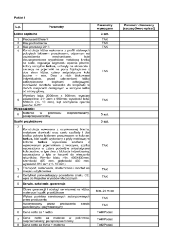 Pakiet I L.p. Parametry Łóżko szpitalne 1 2 3 4 Producent/Oferent Kraj pochodzenia Rok produkcji 2016 Konstrukcja łóżka wykonana z profili stalowych pokrytych lakierem proszkowym, odpornym na uszkodzenia mechaniczne, leże dwusegmentowe wypełnione metalową kratką na stałe, regulacja segmentu oparcia pleców, kolory szczytów turkus, uchwyty na akcesoria i zaczepy na pojemniki na płyny fizjologiczne z obu stron łóżka, cztery antystatyczne koła jezdne – min. Dwa z nich blokowane indywidualnie, przed uderzeniami łóżko zabezpieczone krążkami odbojowymi, możliwość montażu wieszaka do kroplówki w dwóch miejscach dostępnych w szczycie łóżka od strony głowy. Wymiary leża: 2000mm x 900mm; wymiary zewnętrzne: 2110mm x 950mm; wysokość leża: 5 550mm (+/- 10 mm), kąt odchylenia oparcia pleców: 0-70° Wyposażenie: w pokrowcu nieprzemakalny, 6 Materac paraprzepuszczalny Szafki przyłóżkowe 7 3 4 5 Konstrukcja wykonana z ocynkowanej blachy, metalowe drzwiczki oraz czoło szuflady i blat stolika pokryte lakierem proszkowym w kolorze: turkus, blat szafki wykonany z płyty meblowej w kolorze turkus wysuwana szuflada z wyjmowanym pojemnikiem z tworzywa, szafka wyposażona w cztery podwójne antystatyczne koła jezdne, w tym dwa z blokada indywidualną, wyposażona z tyłu w haczyki do wieszania ręczników. Wymiar blatu min. 400X430mm, szerokość 400 mm, głębokość 430 mm, wysokość 810 mm (+/- 10 mm) Transport, rozładunek, dostarczenie i montaż na miejscu użytkownika Certyfikat potwierdzający posiadanie znaku CE, wpis do Rejestru Wyrobów Medycznych Parametry wymagane 3 szt. TAK TAK TAK TAK TAK 3 szt. 3 szt. TAK TAK TAK Serwis, szkolenie, gwarancja Okres gwarancji i obsługi serwisowej na łóżka, materace i szafki przyłóżkowe Wykaz punktów serwisowych autoryzowanych przez producenta Autoryzowany przez producenta serwis gwarancyjny i pogwarancyjny Min. 24 m-ce TAK TAK 6 Cena netto za 1 łóżko TAK/Podać 7 Cena netto za materac w pokrowcu, nieprzemakalny, paraprzepuszczalny Cena netto za łóżko + materac TAK/Podać 8 TAK/Podać Parametr oferowany (szczegółowo opisać) 9 Cena netto za stolik przyłóżkowy 1 szt. TAK/Podać Parametry techniczne, przy których w rubryce "Wymagane" zapisano "Tak" są parametrami granicznymi – nie spełnienie któregokolwiek z tych parametrów spowoduje odrzucenie oferty. Należy szczegółowo opisać każdą pozycję wyposażenia oraz parametrów oferowanych. .............................................. dnia.................................. ................................................................... podpis i pieczęć osób wskazanych w dokumencie uprawniającym do występowania w obrocie prawnym lub posiadających pełnomocnictwo