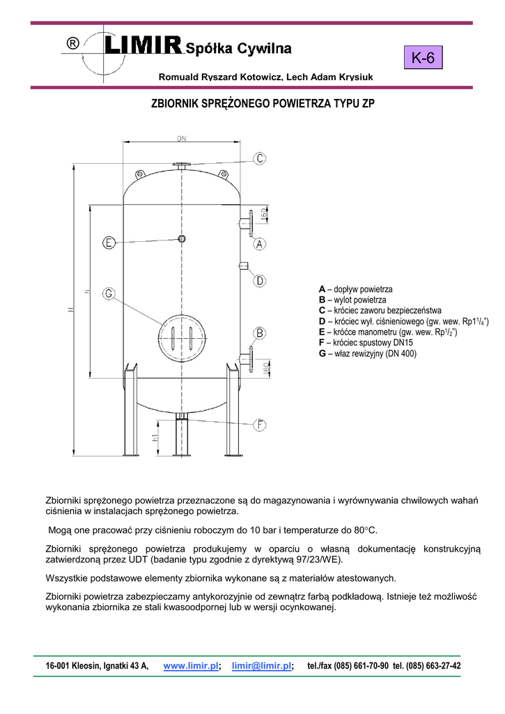 ® K-6 Romuald Ryszard Kotowicz, Lech Adam Krysiuk ZBIORNIK SPRĘśONEGO POWIETRZA TYPU ZP A – dopływ powietrza B – wylot powietrza C – króciec zaworu bezpieczeństwa D – króciec wył. ciśnieniowego (gw. wew. Rp11/4”) E – króćce manometru (gw. wew. Rp1/2”) F – króciec spustowy DN15 G – właz rewizyjny (DN 400) Zbiorniki sprężonego powietrza przeznaczone są do magazynowania i wyrównywania chwilowych wahań ciśnienia w instalacjach sprężonego powietrza. Mogą one pracować przy ciśnieniu roboczym do 10 bar i temperaturze do 80°C. Zbiorniki sprężonego powietrza produkujemy w oparciu o własną dokumentację konstrukcyjną zatwierdzoną przez UDT (badanie typu zgodnie z dyrektywą 97/23/WE). Wszystkie podstawowe elementy zbiornika wykonane są z materiałów atestowanych. Zbiorniki powietrza zabezpieczamy antykorozyjnie od zewnątrz farbą podkładową. Istnieje też możliwość wykonania zbiornika ze stali kwasoodpornej lub w wersji ocynkowanej. 16-001 Kleosin, Ignatki 43 A, www.limir.pl; [email protected]; tel./fax (085) 661-70-90 tel. (085) 663-27-42 ® K-6 Romuald Ryszard Kotowicz, Lech Adam Krysiuk Wymiary produkowanych przez nas zbiorników sprężonego powietrza podaje tabela: TYP Pojemność [dm3] DN [mm] H [mm] h [mm] h1 [mm] Króciec A, B [mm] Króciec C [mm] Masa [kg] ZP 10/2 630 800 1830 1000 190 50 25 285 ZP 10/3 1000 800 2530 1700 190 50 25 368 ZP 10/4 1500 1000 2710 1700 250 65 25 482 ZP 10/5 2500 1200 2915 1800 250 80 32 780 ZP 10/6 4000 1400 3430 2100 350 100 40 1028 ZP 10/7 6300 1600 3885 2400 400 100 50 1460 ZP 10/8 10000 1800 5090 3500 400 100 65 2330 Wymiary, rozmieszczenie oraz ilości króćców przyłączeniowych mogą zostać zmienione zgodnie z indywidualnymi wymaganiami Zamawiającego Zamówienia należy składać podając nazwę wyrobu (ZP) oraz dobrany w zależności od pojemności z tabeli numer zbiornika np. „Zbiornik wyrównawczy sprężonego powietrza ZP 10/5” 16-001 Kleosin, Ignatki 43 A, www.limir.pl; [email protected]; tel./fax (085) 661-70-90 tel. (085) 663-27-42