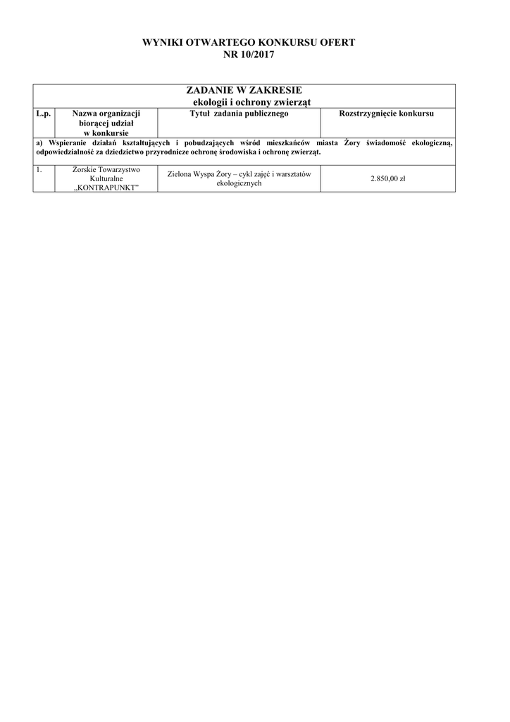 WYNIKI OTWARTEGO KONKURSU OFERT NR 10/2017 ZADANIE W ZAKRESIE ekologii i ochrony zwierząt L.p. Nazwa organizacji biorącej udział w konkursie Tytuł zadania publicznego Rozstrzygnięcie konkursu a) Wspieranie działań kształtujących i pobudzających wśród mieszkańców miasta Żory świadomość ekologiczną, odpowiedzialność za dziedzictwo przyrodnicze ochronę środowiska i ochronę zwierząt. 1. Żorskie Towarzystwo Kulturalne „KONTRAPUNKT” Zielona Wyspa Żory – cykl zajęć i warsztatów ekologicznych 2.850,00 zł