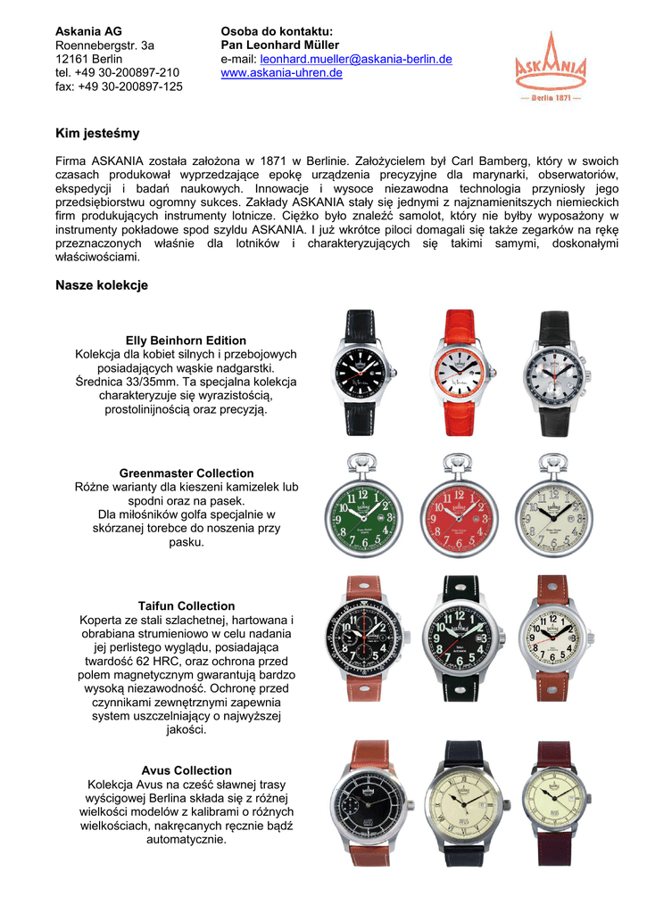 Askania AG Roennebergstr. 3a 12161 Berlin tel. +49 30-200897-210 fax: +49 30-200897-125 Osoba do kontaktu: Pan Leonhard Müller e-mail: [email protected] www.askania-uhren.de Kim jesteśmy Firma ASKANIA została założona w 1871 w Berlinie. Założycielem był Carl Bamberg, który w swoich czasach produkował wyprzedzające epokę urządzenia precyzyjne dla marynarki, obserwatoriów, ekspedycji i badań naukowych. Innowacje i wysoce niezawodna technologia przyniosły jego przedsiębiorstwu ogromny sukces. Zakłady ASKANIA stały się jednymi z najznamienitszych niemieckich firm produkujących instrumenty lotnicze. Ciężko było znaleźć samolot, który nie byłby wyposażony w instrumenty pokładowe spod szyldu ASKANIA. I już wkrótce piloci domagali się także zegarków na rękę przeznaczonych właśnie dla lotników i charakteryzujących się takimi samymi, doskonałymi właściwościami. Nasze kolekcje Elly Beinhorn Edition Kolekcja dla kobiet silnych i przebojowych posiadających wąskie nadgarstki. Średnica 33/35mm. Ta specjalna kolekcja charakteryzuje się wyrazistością, prostolinijnością oraz precyzją. Greenmaster Collection Różne warianty dla kieszeni kamizelek lub spodni oraz na pasek. Dla miłośników golfa specjalnie w skórzanej torebce do noszenia przy pasku. Taifun Collection Koperta ze stali szlachetnej, hartowana i obrabiana strumieniowo w celu nadania jej perlistego wyglądu, posiadająca twardość 62 HRC, oraz ochrona przed polem magnetycznym gwarantują bardzo wysoką niezawodność. Ochronę przed czynnikami zewnętrznymi zapewnia system uszczelniający o najwyższej jakości. Avus Collection Kolekcja Avus na cześć sławnej trasy wyścigowej Berlina składa się z różnej wielkości modelów z kalibrami o różnych wielkościach, nakręcanych ręcznie bądź automatycznie. Bremen Collection Nowa, sportowa generacja zegarków. Tarcze zegarków nawiązują do wyglądu sławnych kompasów lotniczych ASKANIA. Dostępne w różnych wielkościach i wariantach. Alexanderplatz Collection Średnice kopert tych modeli wynoszą 40mm (dla Pań 34mm) i wyposażone są w automatyczny mechanizm ASKANIA. C. Bamberg Collection Prostokątny wzór pochodzi z lat XX-tych ub. wieku. Do zegarków dobrano charakterystyczną tarczę posiadającą rzymskie cyfry, tarcze takie stosowane były w XIX wieku w zegarkach kieszonkowych dla marynarzy. Tempelhof Collection Solidna koperta ze stali szlachetnej wykonana z myślą o codziennym użytku. Posiada przeciwodblaskowe szkło szafirowe i szczelność wynoszącą 10 bar. Przeszklony spód zegarka umożliwia oglądanie pięknego mechanizmu ASKANIA. QUADRIGA Collection Corocznie powstaje ściśle limitowany model specjalny. Charakterystyczne w tym limitowaniu jest to, że ilość sztuk odpowiada liczbie lat tradycji firmy ASKANIA – w 2011 roku jest to więc ilość wynosząca 140 sztuk. Poszukujemy w Polsce W Polsce poszukujemy partnerów do sprzedaży naszych produktów. Idealnymi kandydatami są firmy, które zajmują się dystrybucją zegarków, upominków bądź biżuterii oraz posiadają dobrą znajomość tych branż oraz krąg stałych Klientów. Wymagana jest również znajomość języka niemieckiego lub angielskiego. W rachubę wchodzi przejęcie prawa wyłączności na sprzedaż naszych produktów w Polsce. Równie interesujące byłyby dla nas kontakty do sklepów zajmujących się handlem zegarkami i biżuterią, które widziałyby możliwość uzupełnienia własnej oferty naszymi produktami.