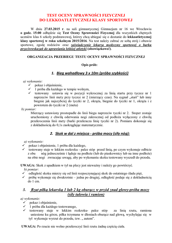 TEST OCENY SPRAWNOŚCI FIZYCZNEJ DO LEKKOATLETYCZNEJ KLASY SPORTOWEJ W dniu 27.03.2015 r. na sali gimnastycznej Gimnazjum nr 16 we Wrocławiu o godz. 15:00 odbędzie się Test Oceny Sprawności Fizycznej dla wszystkich chętnych uczniów klas 6 szkoły podstawowej, którzy chcą ubiegać się o dostanie do lekkoatletycznej klasy sportowej w roku szkolnym 2015/2016. Na test należy zabrać ze sobą strój i obuwie sportowe, zgodę rodziców oraz zaświadczenie lekarza medycyny sportowej o barku przeciwwskazań do uprawiania lekkiej atletyki (obowiązkowo!). ORGANIZACJA PRZEBIEGU TESTU OCENY SPRAWNOŚCI FIZYCZNEJ Opis prób: 1. Bieg wahadłowy 3 x 10m (próba szybkości) a) wykonanie: pokaz i objaśnienie, 1 próba dla każdego w tempie wolnym, testowany ustawia się w pozycji wykrocznej za linią startu przy tyczce nr 1 naprzeciw linii mety przy tyczce nr 2 (mierzący czas). Na sygnał „start” lub inny biegnie jak najszybciej do tyczki nr 2, okrąża, biegnie do tyczki nr 1, okrąża i z powrotem do tyczki nr 2 (meta) b) pomiar: Mierzący ustawiony prostopadle do linii biegu naprzeciw tyczki nr 2. Stoper zostaje uruchomiony z chwilą oderwania nogi zakrocznej od podłoża wyłączony z chwilą przekroczenia linii mety (barki przekracza linię tyczki nr 2). Pomiaru dokonuje się z dokładnością do 0,1s zaokrąglając matematycznie. 2. Skok w dal z miejsca - próba mocy (siły nóg): a) wykonanie: pokaz i objaśnienie, 1 próba dla każdego, testowany staje w lekkim rozkroku - palce stóp przed linią, po czym wykonuje odbicie z obu nóg jednocześnie i ląduje na podłoże (lub do piaskownicy lub na inne podłoże) na obie nogi zwracając uwagę, aby po wykonaniu skoku testowany wyszedł do przodu. UWAGA: Skok z upadkiem w tył na plecy jest nieważny i należy go powtórzyć. b) pomiar: odległość skoku mierzy się od linii rozpoczynającej skok do ostatniego śladu pięt, próbę wykonuje się dwukrotnie – jedna po drugiej, odległość podaje się z dokładnością do 1 cm. 3. Rzut piłką lekarską 1 lub 2 kg oburącz w przód znad głowy-próba mocy (siły tułowia i ramion) a) wykonanie: pokaz i objaśnienie, 1 próba dla każdego testowanego, testowany staje w lekkim rozkroku- palce stóp za linią rzutu, ramiona uniesione ku górze, piłka trzymana w dłoniach oburącz nad głową, wychylając się w tył wykonuje wyrzut do przodu, tzw. „ autem”. UWAGA: Po rzucie nie wolno przekroczyć linii rzutu żadną częścią ciała. b) pomiar: odległość rzutu mierzy się od linii rzutu do ostatniego śladu zostawionego przez lądującą piłkę, próbę wykonuje się dwukrotnie – jeden po drugim, odległość podaje się z dokładnością do 10 cm. 4. Bieg na 4 minuty- próba wytrzymałości: a)przybory: pole prostokąta o wym. 10 x 19,25 ograniczone tyczkami. Pośrodku dłuższe prostej ustawione 3 pachołki w odległościach - 2 oddalone po 4,68 od tyczek, 3-ci, środkowy, oddalony o 5m od pachołków. Pośrodku krótszej prostej pachołek odstawiony w odległości 5m od tyczek. Pachołki należy ustawić 50 cm od linii łączącej dwa pachołki, ku środkowi pola prostokąta b) wykonanie: testowana grupa ustawia się w pozycji stojącej za linią startu (12-15 osób) na sygnał przeprowadzającego test (strzał, gwizdek) grupa testowana biegnie przeciw ruchowi wskazówek zegara okrążając tyczki pomiaru liczby okrążeń dokonuje się za pomocą urządzenia przypadku pomiaru ilości okrążeń sposobem „ręcznym” druga grupa siada w odległości ok 2 m. na wprost linii startu na sygnał (gwizdek) testowani siadają w miejscu ukończenia biegu. c) pomiar: opiekun grupy wraz z prowadzącym notuje odległość przebiegnięta poza linię startu z dokładnością do 5m (pachołki) oraz spisuje od notujących ilość okrążeń.