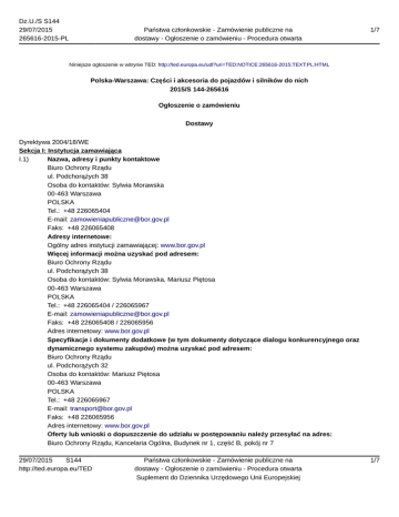 Dz.U./S S144 29/07/2015 265616-2015-PL Państwa członkowskie - Zamówienie publiczne na dostawy - Ogłoszenie o zamówieniu - Procedura otwarta 1/7 Niniejsze ogłoszenie w witrynie TED: http://ted.europa.eu/udl?uri=TED:NOTICE:265616-2015:TEXT:PL:HTML Polska-Warszawa: Części i akcesoria do pojazdów i silników do nich 2015/S 144-265616 Ogłoszenie o zamówieniu Dostawy Dyrektywa 2004/18/WE Sekcja I: Instytucja zamawiająca I.1) Nazwa, adresy i punkty kontaktowe Biuro Ochrony Rządu ul. Podchorążych 38 Osoba do kontaktów: Sylwia Morawska 00-463 Warszawa POLSKA Tel.: +48 226065404 E-mail: [email protected] Faks: +48 226065408 Adresy internetowe: Ogólny adres instytucji zamawiającej: www.bor.gov.pl Więcej informacji można uzyskać pod adresem: Biuro Ochrony Rządu ul. Podchorążych 38 Osoba do kontaktów: Sylwia Morawska, Mariusz Piętosa 00-463 Warszawa POLSKA Tel.: +48 226065404 / 226065967 E-mail: [email protected] Faks: +48 226065408 / 226065956 Adres internetowy: www.bor.gov.pl Specyfikacje i dokumenty dodatkowe (w tym dokumenty dotyczące dialogu konkurencyjnego oraz dynamicznego systemu zakupów) można uzyskać pod adresem: Biuro Ochrony Rządu ul. Podchorążych 32 Osoba do kontaktów: Mariusz Piętosa 00-463 Warszawa POLSKA Tel.: +48 226065967 E-mail: [email protected] Faks: +48 226065956 Adres internetowy: www.bor.gov.pl Oferty lub wnioski o dopuszczenie do udziału w postępowaniu należy przesyłać na adres: Biuro Ochrony Rządu, Kancelaria Ogólna, Budynek nr 1, część B, pokój nr 7 29/07/2015 S144 http://ted.europa.eu/TED Państwa członkowskie - Zamówienie publiczne na dostawy - Ogłoszenie o zamówieniu - Procedura otwarta Suplement do Dziennika Urzędowego Unii Europejskiej 1/7 Dz.U./S S144 29/07/2015 265616-2015-PL Państwa członkowskie - Zamówienie publiczne na dostawy - Ogłoszenie o zamówieniu - Procedura otwarta 2/7 ul. Podchorążych 38 00-463 Warszawa POLSKA I.2) Rodzaj instytucji zamawiającej Inna: państwowa jednostka budżetowa I.3) Główny przedmiot lub przedmioty działalności Porządek i bezpieczeństwo publiczne I.4) Udzielenie zamówienia w imieniu innych instytucji zamawiających Instytucja zamawiająca dokonuje zakupu w imieniu innych instytucji zamawiających: nie Sekcja II: Przedmiot zamówienia II.1) Opis II.1.1) Nazwa nadana zamówieniu przez instytucję zamawiającą: Dostawa pełnego asortymentu oryginalnych, fabrycznie nowych części zamiennych do samochodów i autobusów marki Mercedes. II.1.2) Rodzaj zamówienia oraz lokalizacja robót budowlanych, miejsce realizacji dostawy lub świadczenia usług Dostawy Kupno Główne miejsce lub lokalizacja robót budowlanych, miejsce realizacji dostawy lub świadczenia usług: Biuro Ochrony Rządu, 00-463 Warszawa, ul. Podchorążych 32. Kod NUTS II.1.3) Informacje na temat zamówienia publicznego, umowy ramowej lub dynamicznego systemu zakupów (DSZ) Ogłoszenie dotyczy zamówienia publicznego II.1.4) Informacje na temat umowy ramowej II.1.5) Krótki opis zamówienia lub zakupu Dostawa pełnego asortymentu oryginalnych, fabrycznie nowych części zamiennych do samochodów i autobusów marki Mercedes (Mercedes Viano, Mercedes Vito, Mercedes Sprinter, Mercedes Trasco, Mercedes S 350, Mercedes S 600, Mercedes G 320, Mercedes 711, Mercedes 310, Mercedes 290, Mercedes Travego, Mercedes Tourismo) zgodnie z wymaganiami określonymi w SIWZ. II.1.6) Wspólny Słownik Zamówień (CPV) 34300000 II.1.7) Informacje na temat Porozumienia w sprawie zamówień rządowych (GPA) Zamówienie jest objęte Porozumieniem w sprawie zamówień rządowych (GPA): tak II.1.8) Części To zamówienie podzielone jest na części: nie II.1.9) Informacje o ofertach wariantowych Dopuszcza się składanie ofert wariantowych: nie II.2) Wielkość lub zakres zamówienia II.2.1) Całkowita wielkość lub zakres: Szacunkowa wartość bez VAT: Zakres: między 134 000 i 10 000 000 EUR 29/07/2015 S144 http://ted.europa.eu/TED Państwa członkowskie - Zamówienie publiczne na dostawy - Ogłoszenie o zamówieniu - Procedura otwarta Suplement do Dziennika Urzędowego Unii Europejskiej 2/7 Dz.U./S S144 29/07/2015 265616-2015-PL Państwa członkowskie - Zamówienie publiczne na dostawy - Ogłoszenie o zamówieniu - Procedura otwarta II.2.2) Informacje o opcjach Opcje: nie II.2.3) Informacje o wznowieniach Jest to zamówienie podlegające wznowieniu: nie II.3) Czas trwania zamówienia lub termin realizacji Rozpoczęcie 1.1.2016. Zakończenie 31.12.2018 3/7 Sekcja III: Informacje o charakterze prawnym, ekonomicznym, finansowym i technicznym III.1) Warunki dotyczące zamówienia III.1.1) Wymagane wadia i gwarancje: Wymaga się wniesienia wadium w wysokości: 20 000 PLN. Zamawiający będzie żądał od Wykonawcy przed dniem zawarcia umowy wniesienie zabezpieczenia należytego wykonania umowy w wysokości 5 % wartości nominalnej zobowiązania Zamawiającego wynikającego z umowy. III.1.2) Główne warunki finansowe i uzgodnienia płatnicze i/lub odniesienie do odpowiednich przepisów je regulujących: Płatność w PLN. Zapłata w terminie 30 dni od daty prawidłowo wystawionej faktury i otrzymania części. III.1.3) Forma prawna, jaką musi przyjąć grupa wykonawców, której zostanie udzielone zamówienie: III.1.4) Inne szczególne warunki Wykonanie zamówienia podlega szczególnym warunkom: nie III.2) Warunki udziału III.2.1) Sytuacja podmiotowa wykonawców, w tym wymogi związane z wpisem do rejestru zawodowego lub handlowego Informacje i formalności konieczne do dokonania oceny spełniania wymogów: 1. W celu oceny spełniania przez Wykonawców warunków określonych w art. 22 ust. 1 Ustawy, Zamawiający żąda pisemnego oświadczenia Wykonawcy, że spełnia warunki udziału w postępowaniu zgodnie z art. 22 ust. 1 Ustawy (załącznik nr 2 do SIWZ). Wykonawca może polegać na wiedzy i doświadczeniu, potencjale technicznym, osobach zdolnych do wykonania zamówienia lub zdolnościach finansowych innych podmiotów, niezależn