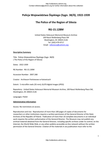 http://collections.ushmm.org Contact [email protected] for further information about this collection Policja Województwa Śląskiego (Sygn. 38/0), 1922‐1939 The Police of the Region of Silesia RG‐15.128M United States Holocaust Memorial Museum Archive 100 Raoul Wallenberg Place SW Washington, DC 20024‐2126 Tel. (202) 479‐9717 Email: [email protected] Descriptive Summary Title: Policja Województwa Śląskiego (Sygn. 38/0) ( The Police of the Region of Silesia) Dates: 1922‐1939 RG Number: RG‐15.130M Accession Number: 2007.268 Creator: Archiwum Państwowe w Katowicach Extent: 5 microfilm reels (35 mm); 8,670 digital images (JPEG) Repository: United States Holocaust Memorial Museum Archive, 100 Raoul Wallenberg Place SW, Washington, DC 20024‐2126 Languages: Polish Administrative Information Access: No restrictions on access. Reproduction and Use: Reproduction of more than 100 pages of copies of documents for researchers or other institutions requires a written permission of the General Director of the State Archives of the Republic of Poland. Publication of more than 10 complete documents in an individual work requires the written authorization of the General Director. The Museum may not publish any archival material obtained from the General Director, including specific archives under its control, on the Internet, the World Wide Web, or any other publicly accessible on‐line network without the written permission of the General Director. Citation of the materials in any publication must refer to the 1 http://collections.ushmm.org http://collections.ushmm.org Contact [email protected] for further information about this collection Museum and the Polish State Archives and must include the name of the archival group and catalogue number of the originals. To request written permission, contact the General Director, Naczelna Dyrekcja Archiwów Państwowych, ul. Rakowiecka 2D, 02‐517 Warsaw, Poland, Attention: General Director Preferred Citation: RG‐15.130M, Policja Województwa Śląskiego (Sygn. 38/0), 1922‐1939. United States Holocaust Memorial Museum Archives, Washington DC., and Archiwum Państwowe w Katowicach, Poland. Acquisition Information: Purchased from the Archiwum Państwowe w Katowicach, Poland. Forms part of the Claims Conference International Holocaust Documentation Archive at the United States Holocaust Memorial Museum. This archive consists of documentation whose reproduction and/or acquisition was made possible with funding from the Conference on Jewish Material Claims Against Germany. Accruals: Accruals may have been received since this collection was first processed, see the Archives catalog at collections.ushmm.org for further information. Custodial History Existence and Location of Originals: The original records are held by the Archiwum Państwowe w Katowicach, ul. Józefowska 104, 40‐145 Katowice, Poland. Tel. 011 48 32 208 78 01. More information about this repository can be found at www.katowice.ap.gov.pl. Processing History: Aleksandra B. Borecka Scope and Content of Collection The collection contains selected records from the files produced by the Head Command of the Police of Region of Silesia and some of the County Police Commands. They cover the following matters: orders and resolutions of the superior authorities, situation reports, searches, inquiries and arrests of the delinquents, information about the social and political events, especially relating to the German minorities and communist movement, and information about the political parties and associations. System of Arrangement The system of arrangement of the source repository has been preserved in the microfilmed reels. Files are organized in the following order: Reel 1: File 146, 147; Reel 2: File 174, 176, 178, 180; Reel 3: File 202‐207; Reel 4: File 208‐212; Reel 5: File 347, 348, 390, 391, 40; Reel 6: File 561, 622. Indexing Terms Jews‐‐Katowice (Poland)‐‐History. Holocaust survivors‐‐Poznań (Poland)‐‐History. Jews, Polish‐‐Poland‐‐History‐‐20th century. Jews‐‐Poland‐‐Migrations‐‐History‐‐20th century. Jewish property‐‐Katowice (Poland) 2 http://collections.ushmm.org http://collections.ushmm.org Contact [email protected] for further information about this collection Katowice (Poland)‐‐Ethnic relations. Poland‐‐Historical geography. CONTAINER LIST Note: Inventory is in Polish and English (Polish, page: 3‐10; English, page: 11‐19). Polish: Reel File Description 1 File number 146 Teczka zawiera akta dotyczące ugrupowań narodowo‐radykalnych z lat 1930‐1938 działających na terenie województwa śląskiego. Sprawozdania policyjne i charakterystyki następujących organizacji: Stronnictwo Narodowe i Obóz Narodowo Radykalny. Śledztwo policji w sprawie podkładania materiałów wybuchowych przez członków Stronnictwa Narodowego pod synagogę katowicką i sklepy żydowskie. W załączeniu ksero stron: 240, 312, 316, 388, 389. Teczka zawiera: 525 ponumerowane strony ok. 530 klatek mikrofilmowych akta zszyte w teczce File number 147 Teczka zawiera akta dotyczące ugrupowań narodowo‐radykalnych (Stronnictwo Narodowe) z lat 1932‐1935 działających na terenie województwa śląskiego. Protokoły przesłuchań narodowców, zawierających wiele wypowiedzi, że Żydzi stanowią problem, który należy zwalczać. Elaboraty jak „program w sprawie żydowskiej” i inne programy i odezwy partii. Liczne odpisy ulotek antysemickich. W załączeniu ksero stron: 44, 45, 403, 497, 500 Teczka zawiera: 488 ponumerowane strony formatu A4 ok. 500 klatek mikrofilmowych akta zszyte w teczce 2 File number 174 Teczka zawiera akta dotyczące organizacji pod nazwą: „NSDAP Auslandorganisation‐Ruckwanderamt‐Zweigstelle Gleiwitz” w Gliwicach, którego oficjalnym zadaniem było pośredniczenie w wyszukiwaniu pracy w Rzeszy dla bezrobotnych obywateli polskich narodowości niemieckiej, zamieszkałych w Polsce. Władze polskie jed