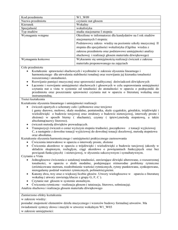 Kod przedmiotu Nazwa przedmiotu Kierunek Specjalność Typ studiów Wymagania wstępne Wymagania końcowe W1_W09 czytanie nut głosem Wokalny wokalistyka studia stacjonarne I stopnia Określone w informatorze dla kandydatów na I rok studiów stacjonarnych I stopnia: Podstawowy zakres wiedzy na poziomie szkoły muzycznej II stopnia dla specjalności wokalistyka (Ogólna wiedza z zakresu przedmiotu oraz podstawowe umiejętności analizy słuchowej i realizacji głosem materiału dźwiękowego) Wykazanie się umiejętnością realizacji ćwiczeń z zakresu materiału proponowanego na zajęciach Cele przedmiotu Kształcenie sprawności słuchowych i wyobraźni w zakresie słyszenia linearnego i harmonicznego dla utrwalenia stabilności tonalnej oraz rozwijanie jej kierunku tonalności rozszerzonej i atonalności. Rozwijanie pamięci muzycznej oraz sprawności analitycznej doświadczeń dźwiękowych Łączenie i rozwijanie umiejętności słuchowych i głosowych w celu usprawniania umiejętności czytania nut a vista w systemie od tonalności do atonalności w oparciu o podręczniki do przedmiotu oraz poszerzanie sprawności czytania nut w oparciu o literaturę wokalną oraz instrumentalną. Treści kształcenia Kształcenie słyszenia linearnego i umiejętności realizacji: ćwiczeń opartych o schematy cało i półtonowe oraz tercjowe ( gamy durowe, molowe, skale modalne, pentatonika, skale cygańskie, góralskie, trójdźwięki i wielodźwięki o budowie tercjowej oraz struktury o budowie nietercjowej, interwały proste i złożone) w sposób bierny ( słuchanie), czynny ( śpiew),metodą stopniową, a także absolutną(nazwy literowe). ćwiczeń metodą dźwięków prowadzących. Transpozycji ćwiczeń o coraz wyższym stopniu trudności, początkowo z tonacji wyjściowej C, a następnie z dowolne tonacji wyjściowej do dowolnej tonacji docelowej, metodą stopniowa oraz absolutna. Kształcenie słyszenia harmonicznego i umiejętności praktycznego zastosowania Ćwiczenia interwałowe w oparciu o interwały proste, złożone Ćwiczenia akordowe w oparciu o trójdźwięki i wielodźwięki o budowie tarcjowej (akordy w układzie skupionym, rozległym, ciągi akordowe o powiązaniach funkcyjnych oraz bez powiązań funkcyjnych) i nietercjowej, w słyszeniu sukcesywnym i symultatywnym. Czytanie a Vista Jednogłosowe ćwiczenia o ustalonej tonalności, zawierające dźwięki alterowane, o rozszerzonej tonalności, w oparciu o skale modalne, podejmujące różnorodne problemy rytmiczne (zróżnicowane metrum, rozdrobnienie wartości rytmicznych, rytmy punktowane, synkopowane, nieregularny podział wartości rytmicznych, polimetria),pieśni. Kanony dwu, trzy oraz o większej liczbie głosów. Utwory wielogłosowe w oparciu o literaturę wokalną ( utwory zawierają klucze z grupy G, F, C ). Czytanie nut głosem w systemie atonalnym. Ćwiczenia rytmiczne - realizacja głosem ( tataizacja, literowo, solmizacją). Analiza słuchowa i realizacja głosem materiału dźwiękowego Zamierzone efekty kształcenia w zakresie wiedzy: posiadać znajomość elementów dzieła muzycznego i wzorców budowy formalnej utworów. Ma świadomość syntezy słowa i muzyki w utworze wokalnym W1_W03 w zakresie umiejętności: posiadać umiejętność właściwego odczytania tekstu nutowego, literackiego , biegłego i pełnego przekazania materiału muzycznego, tekstu oraz zawartych w utworze idei i jego formy W1_U08 posiadać umiejętność rozumienia i kontrolowania struktur rytmicznych, metro-rytmicznych, harmonicznych, oraz aspektów dotyczących frazowania, artykulacji, itp. opracowywanych utworów ( dotyczy także warstwy słownej utworu i związanych z nią elementów mowy) W1_U012 posiadać umiejętność w zakresie słuchowego rozpoznawania materiału muzycznego, zapamiętywania go i operowania nimW1_U013 w zakresie kompetencji społecznych: umieć posługiwać się fachową terminologią z zakresu dziedziny muzyki W1_K09 jest zdolnym do efektywnego wykorzystania wyobraźni, intuicji, twórczej postawy i samodzielnego myślenia w celu rozwiązywania problemówW1_K11 Formy kształcenia wykład / ćwiczenia Rok I II III Semestr 1 2 3 4 5 6 Punkty ECTS 2016/17 1 1 2 2 2 2 Punkty ECTS 2015/16 1 1 2 2 2 2 Punkty ECTS 2014/15 2 2 2 2 Ilość godzin w tygodniu 2 2 2 2 Rodzaj zaliczenia 1zst zst zst zst zst egz Legenda: zst – zaliczenie ze stopniem; egz – egzamin Kryteria oceny Student otrzymuje pozytywną ocenę w wyniku wykazania się zadowalająca znajomością materiału realizowanego w danym semestrze. Wiedzę i umiejętności studenta (kolokwium składające się z prezentacji ustnej materiału) sprawdza i ocenia wykładowca przedmiotu. Literatura Ćwiczenia dedykowane do czytania nut głosem, wybrane pozycje z literatury wokalnej oraz instrumentalnej. T. Zieliński Problemy harmoniki nowoczesnej T. Zieliński Style, kierunki i twórcy w muzyce XX wieku Fr. Wesołowski Materiały do nauki o skalach muzycznych N. M. Ładuchin Solfeż jednogłosowy M. Dziewulska, a. Frączkiewicz, K. Palowska Materiały do kształcenia słuchu H. Danyszowa Zbiór ćwiczeń do kszałcenia słuchu Z.Kodaly Tricinia A.Rubec – Jednogłosowe ćwiczenia J. Dzielska Materiały pomocnicze do kształcenia słuchu I.W. Sposobin Slofeż dwu i trzy głosowe L. Antal Kanony zebrane Lars Edlund Modus Vetus Lars Edlund Modus Novus Wlazł kotek i inne Piosenki dla dzieci na głos i fortepian red. M. Kaczurbina, L. Miklaszewski Antologia muzyki chóralnej renesansu na chór mieszany a capella – redakcja St. Wiechowicz J. S. Bach Inwencja dwu i trzy głosowe J. S. Bach 48 Preludia i fugi J. S bach Chorały J. S. Bach Łatwe utwory Orlando di Lasso Motety Śpiewnik Swojski opracował F. Ryling St. Moniuszko Pieśni Wybrane na Chór mieszany i na chór żeński Muzyka chóralna pięciu wieków Muzyka chóralna tysiąca lat -Utwory chóralne a capella W. A. Mozart Msza F-dur brevis ,Msza brevis D-dur KV 194, Vesperae Solennes de Cofessore KV