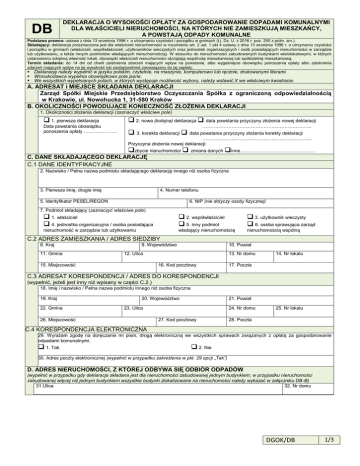 DB DEKLARACJA O WYSOKOŚCI OPŁATY ZA GOSPODAROWANIE ODPADAMI KOMUNALNYMI DLA WŁAŚCICIELI NIERUCHOMOŚCI, NA KTÓRYCH NIE ZAMIESZKUJĄ MIESZKAŃCY, A POWSTAJĄ ODPADY KOMUNALNE Podstawa prawna: ustawa z dnia 13 września 1996 r. o utrzymaniu czystości i porządku w gminach (t.j. Dz. U. z 2016 r. poz. 250 z późn. zm.). Składający: deklaracja przeznaczona jest dla właścicieli nieruchomości w rozumieniu art. 2 ust. 1 pkt 4 ustawy z dnia 13 września 1996 r. o utrzymaniu czystości i porządku w gminach (właścicieli, współwłaścicieli, użytkowników wieczystych oraz jednostek organizacyjnych i osób posiadających nieruchomości w zarządzie lub użytkowaniu, a także innych podmiotów władających nieruchomością). W stosunku do nieruchomości zabudowanych budynkami wielolokalowymi, w których ustanowiono odrębną własność lokali, obowiązki właścicieli nieruchomości obciążają wspólnotę mieszkaniową lub spółdzielnię mieszkaniową. Termin składania: do 14 dni od chwili zaistnienia zdarzeń mających wpływ na powstanie, albo wygaśnięcie obowiązku ponoszenia opłaty albo zaistnienia zdarzeń mających wpływ na jej wysokość lub osobę/podmiot zobowiązany do jej zapłaty. Deklarację należy wypełnić w języku polskim, czytelnie, na maszynie, komputerowo lub ręcznie, drukowanymi literami. Wnioskodawca wypełnia obowiązkowo pola jasne. We wszystkich wypełnianych polach, w których występuje możliwość wyboru, należy wstawić X we właściwym kwadracie. A. ADRESAT i MIEJSCE SKŁADANIA DEKLARACJI Zarząd Spółki Miejskie Przedsiębiorstwo Oczyszczania Spółka z ograniczoną odpowiedzialnością w Krakowie, ul. Nowohucka 1, 31-580 Kraków B. OKOLICZNOŚCI POWODUJĄCE KONIECZNOŚĆ ZŁOŻENIA DEKLARACJI 1. Okoliczności złożenia deklaracji (zaznaczyć właściwe pole) 1. pierwsza deklaracja Data powstania obowiązku ponoszenia opłaty ………..………. 2. nowa (kolejna) deklaracja data powstania przyczyny złożenia nowej deklaracji ………………………………………………………….. 3. korekta deklaracji data powstania przyczyny złożenia korekty deklaracji ………………………………………………………….. Przyczyna złożenia nowej deklaracji: zbycie nieruchomości zmiana danych inne…..…………………………………… C. DANE SKŁADAJĄCEGO DEKLARACJĘ C.1 DANE IDENTYFIKACYJNE 2. Nazwisko / Pełna nazwa podmiotu składającego deklarację innego niż osoba fizyczna 3. Pierwsze imię, drugie imię 4. Numer telefonu 5. Identyfikator PESEL/REGON 6. NIP (nie dotyczy osoby fizycznej) 7. Podmiot składający (zaznaczyć właściwe pole) 1. właściciel 4. jednostka organizacyjna / osoba posiadająca 2. współwłaściciel 5. inny podmiot 3. użytkownik wieczysty 6. osoba sprawująca zarząd nieruchomość w zarządzie lub użytkowaniu władający nieruchomością nieruchomością wspólną C.2 ADRES ZAMIESZKANIA / ADRES SIEDZIBY 8. Kraj 11. Gmina 9. Województwo 10. Powiat 12. Ulica 15. Miejscowość 13. Nr domu 16. Kod pocztowy 14. Nr lokalu 17. Poczta C.3 ADRESAT KORESPONDENCJI / ADRES DO KORESPONDENCJI (wypełnić, jeżeli jest inny niż wpisany w części C.2.) 18. Imię i nazwisko / Pełna nazwa podmiotu innego niż osoba fizyczna 19. Kraj 22. Gmina 20. Województwo 21. Powiat 23. Ulica 26. Miejscowość 24. Nr domu 27. Kod pocztowy 25. Nr lokalu 28. Poczta C.4 KORESPONDENCJA ELEKTRONICZNA 29. Wyrażam zgodę na doręczanie mi pism, drogą elektroniczną we wszystkich sprawach związanych z opłatą za gospodarowanie odpadami komunalnymi. 1. Tak 2. Nie 30. Adres poczty elektronicznej (wypełnić w przypadku zakreślenia w pkt. 29 opcji „Tak”) D. ADRES NIERUCHOMOŚCI, Z KTÓREJ ODBYWA SIĘ ODBIÓR ODPADÓW (wypełnić w przypadku gdy deklaracja składana jest dla nieruchomości zabudowanej jednym budynkiem; w przypadku nieruchomości zabudowanej więcej niż jednym budynkiem wszystkie budynki zlokalizowane na nieruchomości należy wykazać w załączniku DB-B) 31.Ulica 32. Nr domu DGOK/DB 1/3 E. WYSOKOŚĆ OPŁATY ZA GOSPODAROWANIE ODPADAMI KOMUNALNYMI 33. Sposób zbierania odpadów komunalnych: (zaznaczyć właściwe pole) 1. Zbieranie w sposób selektywny 2. Zbieranie w sposób nieselektywny Uwaga: w polu „Częstotliwość odbiorów w ciągu miesiąca” należy wpisać liczbę: 1,00 dla 1 odbioru w miesiącu, 2,17 dla 1 odbioru co 2 tygodnie, 4,33 dla 1 odbioru w tygodniu, 8,67 dla 2 odbiorów w tygodniu, 13,00 dla 3 odbiorów w tygodniu, 17,33 dla 4 odbiorów w tygodniu, 21,67 dla 5 odbiorów w tygodniu, 26,00 dla 6 odbiorów w tygodniu, 30,00 dla 7 odbiorów w tygodniu. Liczba pojemników z odpadami komunalnymi powstałymi na nieruchomości B A C Pojemność pojemnika [m3] Ilość pojemników [szt.] x Częstotliwość odbiorów w ciągu miesiąca x Stawka opłaty za jednokrotny odbiór odpadów z pojemnika D E ZBIÓRKA ZBIÓRKA NIESELEKTYWNA SELEKTYWNA (dotyczy zaznaczonej (dotyczy zaznaczonej opcji 33.2) opcji 33.1) 0,12 x x 14,00 21,00 0,12 (do selekcji) x x 14,00 - 0,12 (odpady kuchenne) x x 14,00 21,00 0,18 x x 21,00 31,00 0,24 x x 27,00 41,00 0,24 (do selekcji) x x 27,00 - 0,66 x x 39,00 58,00 0,77 x x 45,00 68,00 0,77 (do selekcji) x x 45,00 - 0,80 x x 47,00 71,00 1,1 x x 65,00 97,00 1,1(do selekcji) x x 65,00 - 2,5 x x 164,00 246,00 5 x x 328,00 492,00 689,00 7 x x 460,00 10 x x 656,00 984,00 12 x x 787,00 1181,00 15 x x 984,00 1476,00 16 x x 1050,00 1575,00 18 x x 1181,00 1772,00 20 x x 1312,00 1968,00 30 x x 1968,00 2952,00 38 x x 2493,00 3740,00 40 x x 2624,00 3936,00 x x 349,00 (za 1m3) 524,00 (za 1m3) x x 122,00 (za 1m3) 183,00 (za 1m3) x x 58,00 (za 1m3) - Prasokontener (odpady sprasowane) Opłata [zł/miesiąc] w przypadku zbiórki selektywnej = BxCxD albo w przypadku zbiórki nieselektywnej = BxCxE ……. m3 Prasokontener (odpady sprasowane z targowisk - kod 200302) ……. m3 Pojemnik na szkło, opakowania ze szkła ……. m3 OPŁATA OGÓŁEM (W ZŁ/MIESIĄC) Sło