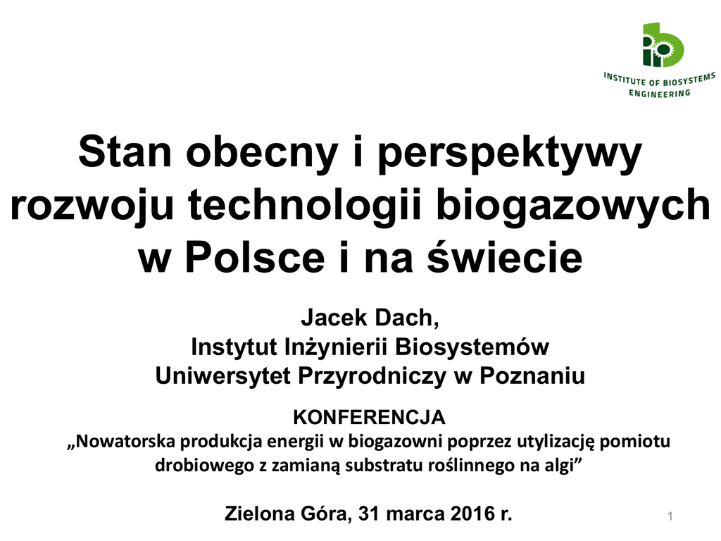 Stan obecny i perspektywy rozwoju technologii biogazowych w Polsce i na świecie Jacek Dach, Instytut Inżynierii Biosystemów Uniwersytet Przyrodniczy w Poznaniu KONFERENCJA „Nowatorska produkcja energii w biogazowni poprzez utylizację pomiotu drobiowego z zamianą substratu roślinnego na algi” Zielona Góra, 31 marca 2016 r. 1 Czym jest typowa biogazownia? Instalacja posiadająca zbiornik fermentacyjny, w którym w następuje rozkład uwodnionej biomasy w temperaturze 36-40oC, w warunkach beztlenowych, a końcowym produktem jest biogaz (mieszanina CH4 i CO2) oraz poferment. Stan obecny rynku biogazu w Polsce i w Europie Biogazownie rolnicze w Polsce: stan aktualny Funkcjonujące biogazownie rolnicze: • 80 biogazowni rolniczych • 100% produkcji energii w kogeneracji • Łączna moc elektryczna – 85,94 MWe • Powierzchnia użytków rolnych 18,9 mln ha (Niemcy ok. 17 mln ha) Biogazownie rolnicze w Polsce: potencjał Wg ilości dostępnej biomasy i odpadów organicznych • 90 mln ton obornika i gnojowicy • 8 mln ton słomy zbóż i rzepaku • 4 mln ton słomy kukurydzianej • Odpadowa biomasa roślinna, odpady z przetwórstwa żywności, cukrowni, rzeźni, ubojni, mleczarni, gorzelni, refood (przeterminowana i zepsuta żywność) i in. (laboratorium biogazowe UP w Poznaniu przebadało wydajności ponad 1100 różnego rodzaju substratów biomasowych i odpadowych). Ostrożnie liczony potencjał produkcji: 13,5 mld m3 biogazu (7,8 mld m3 biometanu) NIEMCY: 9200 UK: 500 FRANCJA: 350 SŁOWACJA CZECHY: 550 WŁOCHY: 1900 Dominuje niemiecka technologia NaWaRo 6 NIEMCY do 270 €/MWh POLSKA ok. 65 €/MWh CZECHY 138 €/MWh WŁOCHY do 250 €/MWh 7 DBFZ (Deutsches Biomasseforschungszentrum) jest to federalny instytut (przy ministerstwie rolnictwa) monitorujący niemiecki rynek biogazu 8 Dominująca w Europie technologia NaWaRo polega na fermentacji typowych substratów rolniczych jak kiszonki, z dodatkiem odchodów zwierzęcych 9 Stosowanie innych substratów, gwałtowne zmiany w „diecie” bardzo negatywnie wpływają na przebieg procesów – aż do ich zatrzymania 10 Transfer na rynek polski technologii z krajów o wysokim stopniu subsydiowania OZE jest prostą drogą do bankructwa biogazowni. Tymczasem w Polsce rozwijają się technologie oparte na rodzimej myśli technicznej: - wysokowydajne, - pozwalające na fermentację szerokiej gamy odpadów organicznych, - tańsze w budowie i eksploatacji. Pożądanym kierunkiem rozwoju biogazowni jest obniżenie kosztów działania poprzez umożliwienie wykorzystania różnego rodzaju odpadów organicznych czy materiałów trudno fermentujących 12 Wybrane przykłady innowacyjnych polskich technologii biogazowych 13 Technologia stalowych, skręcanych fermentorów (1000 m3) z pionowym mieszaniem (Jaromierz) Szybka budowa (możliwość demontażu), wydajna fermentacja, niewiele problemów technologicznych, małe zużycie energii elektrycznej i cieplnej Biogazownia rolnicza 1,2 MW (Międzyrzec Podlaski) w układzie liniowym, z rozdzielonymi fazami fermentacji Ekstremalnie wysoka wydajność i bardzo duża stabilność procesu Bardzo szeroka gama przerabianych odpadów. Wydajność fermentacji sięga 545 m3 CH4 z t suchej masy. Możliwość przemysłowej produkcji H2 Innowacyjne rozwiązania techniczne: - wykorzystanie CO2 ze spalanego biogazu do beztlenowego przechowywania warzyw w chłodniach, a ciepła do produkcji chłodu 18 Pozaenergetyczne aspekty rozwoju biogazowni Ograniczenie emisji metanu Biogazownie powinny być budowane przy wszystkich większych fermach zwierzęcych. Składowane nawozy naturalne (zwłaszcza obornik) są źródłem bardzo silnej emisji metanu do atmosfery (dane z grantu „Technologie redukcji emisji metanu z produkcji zwierzęcej i gospodarki nawozami naturalnymi w kontekście opłat za emisje gazów cieplarnianych (GHG) finansowanego przez MNiSW 2010-13). 19 Pozaenergetyczne aspekty rozwoju biogazowni Proekologiczne przetwarzanie odpadów Biogazownie powinny być wykorzystywane do przetwarzania różnych odpadów organicznych na cele energetyczne i nawozowe, z korzyścią dla środowiska. 20 Pulpa pofermentacyjna – poferment - Wartościowy materiał nawozowy; - Brak nieprzyjemnego zapachu; - Obniżone ryzyko stosowania dla środowiska (wielokrotnie niższe BZT5 czy ChZT w porównaniu do substratów wyjściowych); - Możliwość dodatkowego przychodu dla biogazownia. Dziękuję za uwagę Dr hab. inż. Jacek Dach, prof. nadzw. Uniwersytet Przyrodniczy w Poznaniu Wydział Rolnictwa i Bioinżynierii e-mail: [email protected]