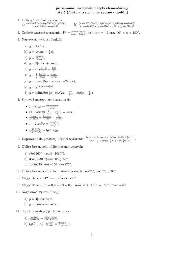 proseminarium z matematyki elementarnej lista 5 (funkcje trygonometryczne - część I) 1. Obliczyć wartość wyrażenia: 2 ◦ −6ab tg 2 30◦ +(b tg45◦ )2 a) 4a sin45 , 2a sin30◦ −2b cos2 45◦ 2. Znaleźć wartość wyrażenia: W = b) (x sin90◦ )3 −x2 y 2 tg0◦ +xy 2 ctg90◦ +(y cos180◦ )3 (x cos180◦ )2 +xy sin270◦ cos180◦ +(y sin270◦ )2 2sinα+cosα cosα−3sinα , jeśli tgα = −2 oraz 90◦ < α < 180◦ . 3. Narysować wykresy funkcji: a) y = 2 sinx, b) y = |cos(x + π4 )|, c) y = 2|sinx| sinx , d) y = 2|cosx| + cosx, e) y = cos |x|−x 2 − f) y = 12 ( |sinx| cosx + 2|x| x , sinx |cosx| ), g) y = max(|tgx|, cos2x, −2sinx), √ h) y = x2+ |sinx|−1 , i) y = min(sin( 12 x), cos(2x − π3 ), −ctg(x + π4 )) 4. Sprawdź następujące tożsamości: sinx+cosx , sinx 1 (1 + sinx)( cosx − tgx) = sinx 1+cosx 2 1+cosx + sinx = sinx , • 1 + ctgx = • • • 1 − 2sin2 x = • tgx+tgy ctgx+ctgy cosx, 1−tg 2 x , 1+tg 2 x = tgx · tgy 5. Doprowadź do prostszej postaci wyrażenie: tg(π−α)ctg 2 (α−π)−tg 3 (α−2π)tg 2 ( 23 π−α) . tg(α− π2 )[sin2 (α− 32 π)+sin2 ( 32 π+α)] 6. Oblicz bez użycia tablic matematycznych: a) sin1200◦ + cos(−1080◦ ), b) 3cos(−300◦ )sin120◦ tg135◦ , c) 10ctg315◦ sin(−150◦ )cos225◦ , 7. Oblicz bez użycia tablic matematycznych: sin75◦ , cos15◦ , tg105◦ . 8. Mając dane sin12◦ = a oblicz cos33◦ . 9. Mając dane sinα = 0, 6 sinβ = 0, 8 oraz α + β + γ = 180◦ oblicz sinγ. 10. Narysować wykres funckji: a) y = 4|sinx|cosx, b) y = |sin4 x − cos4 x|. 11. Sprawdź następujące tożsamości: a) b) cos2x cosx−sinx 1+sin2x = cosx+sinx , tg( π6 + α) · tg( π6 ) = 2cos2α−1 2cos2α+1 , 1 c) d) 1+2tgα−tg 2 α 1 cos2α+sin2α = cos2 α , cosα α sin2α 1+cos2α · 1+cosα = tg 2 12. Oblicz cos6x wiedząc, że tg( π4 + 3x) = tg6x + 2. 13. Rozwiąż równania: a) sin5x = 12 , b) cos(2x − π3 ) = − √ 2 2 , c) cos2x + cosx + 1 = 0, d) tg 3 x − 2tg 2 x − tgx + 2 = 0, e) 2cos2 x + 3sinx = 3, f) 3sin2 2x + 2cos2 x − 2 = 0, g) ( 32 )4sin h) sinx 1−cosx 2x 2x + ( 23 )4cos = 26 27 , = 0, i) cos4x + 2cos2 x = 1, j) sin10x − sin6x = 2sin2x, k) cos4x + cos2x = 2cosx, l) tgx + tg 3 x + tg 5 x + . . . = √ 3 2 2