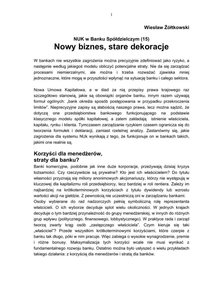 1 Wiesław Żółtkowski NUK w Banku Spółdzielczym (15) Nowy biznes, stare dekoracje W bankach nie wszystkie zagrożenia można precyzyjnie zdefiniować jako ryzyko, a następnie według jakiegoś modelu obliczyć potencjalne straty. Nie da się zarządzać procesami niemierzalnymi, ale można i trzeba rozważać zjawiska mniej jednoznaczne, które mogą w przyszłości wpłynąć na sytuację banku i całego sektora. Nowa Umowa Kapitałowa, a w ślad za nią przepisy prawa krajowego raz szczegółowo stanowią, jakie są obowiązki organów banku, innym razem używają formuł ogólnych: „bank określa sposób postępowania w przypadku przekroczenia limitów”. Nieprecyzyjne zapisy są słabością naszego prawa, lecz można sądzić, że dotyczą one przedsiębiorstwa bankowego funkcjonującego na podstawie klasycznego modelu spółki kapitałowej, a zatem zakładają istnienie właściciela, kapitału, rynku i klienta. Tymczasem zarządzanie ryzykiem czasem ogranicza się do tworzenia formułek i deklaracji, zamiast rzetelnej analizy. Zastanówmy się, jakie zagrożenia dla systemu NUk wynikają z tego, że funkcjonuje on w bankach takich, jakimi one realnie są. Korzyści dla menedżerów, straty dla banku? Banki komercyjne, podobnie jak inne duże korporacje, przeżywają dzisiaj kryzys tożsamości. Czy rzeczywiście są prywatne? Kto jest ich właścicielem? Do tytułu własności przyznają się miliony anonimowych akcjonariuszy, którzy nie występują w kluczowej dla kapitalizmu roli przedsiębiorcy, lecz bardziej w roli rentiera. Zależy im najbardziej na krótkoterminowych korzyściach z tytułu dywidendy lub wzrostu wartości akcji na giełdzie. Z pewnością nie uczestniczą oni w zarządzaniu bankami. Osoby wybierane do rad nadzorczych pełnią symboliczną rolę reprezentanta właścicieli. O ich wyborze decyduje splot wielu okoliczności. W jednych krajach decyduje o tym bardziej przynależność do grupy menedżerskiej, w innych do różnych grup wpływu (politycznego, finansowego, lobbystycznego). W praktyce rada i zarząd tworzą zwarty krąg osób „zastępczego właściciela”. Czym kieruje się taki „właściciel”? Przede wszystkim krótkoterminowymi korzyściami, które czerpie z banku tak długo, póki w nim pracuje. Więc zabiega o wysokie wynagrodzenie, premie i różne bonusy. Maksymalizacja tych korzyści wcale nie musi wynikać z fundamentalnego rozwoju banku. Ostatnio można było usłyszeć o wielu przykładach takiego działania: z korzyścią dla menedżerów i stratą dla banków. 2 Czy banki działają na wolnym rynku? W klasycznej gospodarce kapitalistycznej, z której wywodzi się wiele głoszonych prawd, było wielu przedsiębiorców konkurujących z sobą. Jak jest dzisiaj? Wiele obszarów rynku finansowego zostało zdominowanych przez niewielką liczbę wielkich korporacji. Firmy te, także banki, bywają zbiurokratyzowane i często nieefektywne, ale trwają. Małe podmioty nie mają szans na konkurowanie z nimi, ze względy na efekt skali, natomiast nieliczne duże powielają te same praktyki. Mają duże, nadmiernie rozbudowane struktury biurokratyczne, mało kompetentne kierownictwa, popełniają błędy. Dlaczego konkurencja ich nie wyeliminuje? Bo konkurencją jest równie wielką organizacją, podobnie działającą! Koszty tej nieefektywności przenosi się na cenę produktu i usługi, co można zrobić na częściowo monopolistycznym rynku. Żaden mały konkurent nie przeciwstawi się, bo zostanie wykupiony. Znów ostatnie czasy dały wiele na to dowodów. Niektórzy dostrzegają te problemy. Stąd poszukiwanie rozwiązań odbudowujących sens gospodarki kapitalistycznej. Namiastką takich działań jest zwiększanie uprawnień i obowiązków rad nadzorczych ustawianych w kontrze do zarządów. Chodzi o to, aby weszły one trochę w rolę prawdziwego właściciela, który egzekwuje efektywność zarządów. Przypomina mi to poszukiwanie miejsca dla samorządu pracowniczego w gospodarce socjalistycznej. Pokazuje to jedno - został zauważony problem sztucznej roli właściciela i ograniczeń rynku. Bez tych dwóch filarów nie ma klasycznego kapitalizmu, jest coś pośredniego, żywiołowego, chowającego się za starymi szyldami. Co to jest spółdzielczość? Byłem na zebraniu mojej grupy członkowskiej banku spółdzielczego. Kilku udziałowców wystąpiło z wnioskiem o podjęcie starań, aby przekształcić bank spółdzielczy w spółkę akcyjną. Chodziło im o to, aby mogli później zbyć swoje akcje. Uważali, że ich udziały wniesione do banku nie dają im żadnych korzyści, bo dywidenda nie jest satysfakcjonująca. Abstrahując od tego, czy banki komercyjne wypłacają wyższą dywidendę (często nie wypłacają), to pojawił się problem. Zebranie olbrzymią większością odrzuciło jednak te wnioski. Dominujący na sali starsi spółdzielcy nie mieli wątpliwości jak postąpić. Czyj jest bank spółdzielczy? Kto ma czerpać i jakie korzyści z tytułu bycia jego właścicielem? Wydaje się, że nierozumienie tej kwestii może być wkrótce źródłem wielkiego, fundamentalnego ryzyka dla bankowości spółdzielczej. Ryzyko polega bowiem na tym, że instytucja może ponosić straty także z tytułu tego, że nie rozumie sensu swego działania. Inaczej mówiąc, czy wiemy na czyje ryzyko zarządza się bankiem? Kto i dlaczego ma egzekwować efektywność banku? I jak rozumieć tę efektywność? Może warto dobrze zastanowić się nad tymi prostymi pytaniami. 3 Jest wiele opracowań dotyczących historii spółdzielczości kredytowej. W 1934 r. wydawnictwo Społem opublikowało broszurę pt. „Co to jest spółdzielczość”, jako materiał do odczytów i referatów. Ponieważ teoretyczna myśl spółdzielcza niezbyt dynamicznie się rozwija, więc spróbuję posłużyć się pomocą naukową sprzed 75. lat. Ówczesny prelegent mówił: „Spółdzielnia jest zrzeszeniem lub połączeniem grupy osób dla osi
