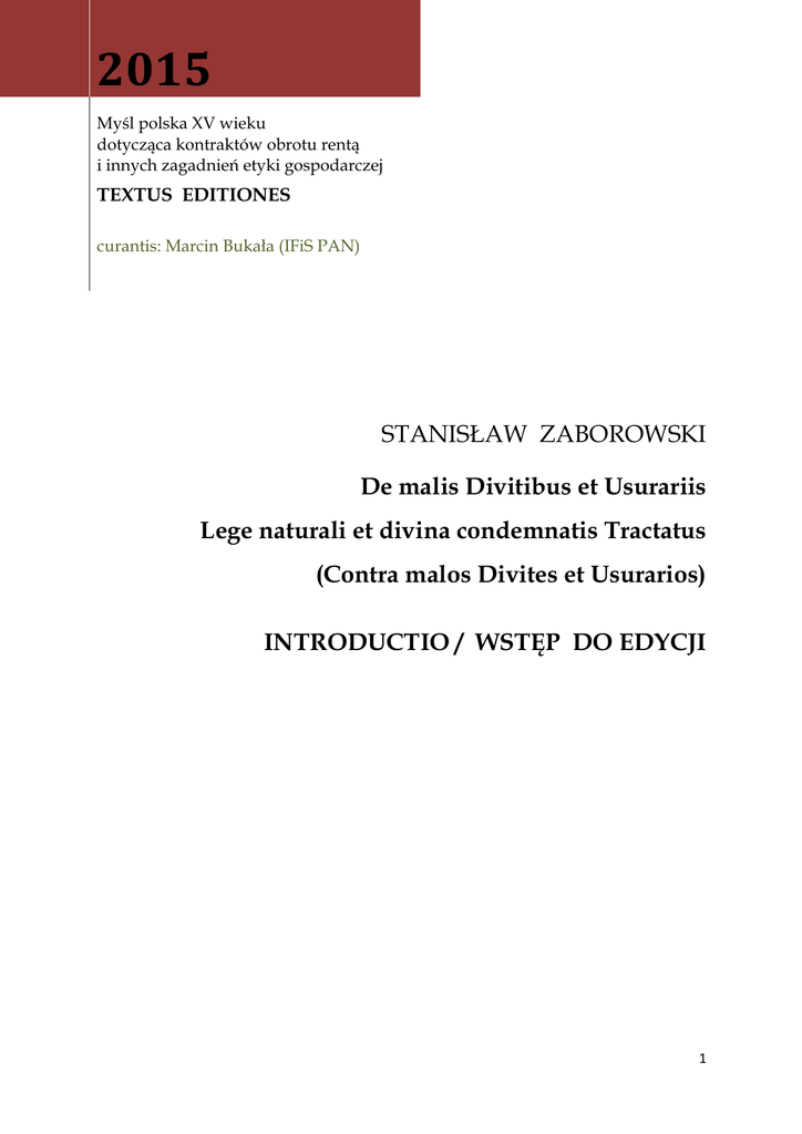 2015 Myśl polska XV wieku dotycząca kontraktów obrotu rentą i innych zagadnień etyki gospodarczej TEXTUS EDITIONES curantis: Marcin Bukała (IFiS PAN) STANISŁAW ZABOROWSKI De malis Divitibus et Usurariis Lege naturali et divina condemnatis Tractatus (Contra malos Divites et Usurarios) INTRODUCTIO / WSTĘP DO EDYCJI 1 Stanisław Zaborowski, De malis Divitibus et Usurariis... TRAKTAT STANISŁAWA ZABOROWSKIEGO DE MALIS DIVITIBUS ET USURARIIS WSTĘP DO EDYCJI A. WSTĘP RZECZOWY Traktat anty-lichwiarski Stanisława Zaborowskiego ukazał się drukiem w Krakowie w 1512 r.1. Na stronie tytułowej wydania znajdujemy skrócony tytuł tekstu: Contra Malos Divites et Usurarios. Pełny tytuł — podany przed incipitem “Sanctus Paulus divinus nuncius”, na str. 2 — brzmi: De malis Divitibus et Usurariis Lege naturali et divina condamnatis Tractatus. Autor traktatu Choć w druku nie jest podane nazwisko autora, był nim bez wątpienia był Stanisław Zaborowski, na co wskazuje odniesienie do jego wcześniejszego traktatu De natura iurium et bonorum Regis: „et de hoc etiam dixi in Tractatu de natura iurium et bonorum Regis, qui incipit »Gemitus et planctus pauperum plurimus« etc.” (s. 15 edycji)2. Stanisław Zaborowski (1470/77-1530) pochodził ze średnio zamożnej rodziny szlacheckiej z ziemi sieradzkiej, która posiadała kilka wsi, w tym Zaborów. Choć był księdzem katolickim, przez większą część życia pracował w administracji skarbowej. Studiował na Akademii Krakowskiej, gdzie 1 Contra Malos Divites et Usurarios Tractatus, Cracouie 1512 (expl. p. 22: „Impressum Cracouie opera Floriani in Platea Wisliciensi, quarto idis aprilis Anno salutis MCCCCCXII, feliciter regnante divo Sigismundo, anno eius sexto, cui salus et victoria”); cf. K. Estreicher, Bibliografia polska, t. 34, Kraków 1951, s. 55-57. 2 Cf. S. Zaborowski, Traktat w czterech częściach o naturze praw i dóbr królewskich oraz o naprawie królestwa i o kierowaniu państwem (Tractatus quadrifidus de natura iurium et bonorum Regis, et de reformatione Regni ac eius reipublicae regimine), wyd. H. Litwin, Kraków 2005. WSTĘP RZECZOWY prawdopodobnie uzyskał doktorat z prawa kanonicznego3. W czasach Aleksandra Jagiellończyka Zaborowski był już Regni Polonie thesauri Notarius, a za Zygmunta I uzyskał tytuł Custos thesauri Regni4. Na początku swej kariery ksiądz Stanisław był związany z biskupem Janem Łaskim (starszym, † 1531), wówczas biskupem kujawskim i kanclerzem (a potem prymasem)5. Właśnie kanclerz Łaski był inicjatorem wydania słynnego statutu króla Aleksandra z 1504 r., który zasadniczo zmieniał zasady przyjmowania w zastaw ziem domeny królewskiej, wprowadzając wymóg zaliczania pożytków na poczet sumy dłużnej6. Podobnie jak prymas Łaski, Zaborowski był oddany Kościołowi rzymskiemu, a przeciwny nowinkom religijnym i rozwijającym się od przełomu wieków XV i XVI prądom prereformacyjnym. Był jednak zarazem krytyczny wobec hierarchów kościelnych; dał temu wyraz również w wydawanym tu traktacie, gdzie z oburzeniem wskazuje na pobłażliwość niektórych biskupów i przedstawicieli wyższego duchowieństwa wobec lichwiarzy (warto przy tym zauważyć, że część ówczesnych biskupów sprzyjała potem Reformacji). Pomimo dobrej orientacji w prawie rzymskim i kanonicznym, nasz autor nie był jurystą — jego prace dotyczące problemów polityki i życia gospodarczego należy raczej wiązać z dziedziną theologia practica. Przywołując rozróżnienie Josepha Schumpetera7, należy zaliczyć Zaborowskiego raczej do ‘filozofów prawa naturalnego’ niż do zorientowanych praktycznie autorów piszących na Niestety nie można tego potwierdzić, gdyż archiwa wydziału prawa z tego okresu nie zachowały się. 4 O życiu Zaborowskiego zob. w edycji tratatu De natura iurium et bonorum Regis: H. Litwin, „Stanisława Zaborowskiego życie, sylwetka i traktat”, w: Zaborowski, Traktat w czterech częściach o naturze praw i dóbr królewskich..., pp. V-LXXVIII; zob. też: L. Szczucki, Filozofia i myśl społeczna XVI wieku, Warszawa 1978 (ser. „700 lat myśli polskiej”, 36). 5 Cf. W. Dworzaczek, „Łaski, Jan, h. Korab (1456-1531)”, w: Polski słownik biograficzny, 18 (1973), s. 229-337 6 Ed.: Volumina legum, ed. J. Ohryzko, t. I, Petersburg 1859, s. 294-299; zob.: A. SucheniGrabowska, A. Wyczański, Les révisions des biens fonciers appartenant au domaine de la couronne en Pologne au cours des XVI-XVIII siècles. La source et son edition, „Studia Historiae Oeconomicae Uniwersytetu Adama Mickiewicza“, 7 (1972), s. 59-90; A. Sucheni-Grabowska, Odbudowa domeny królewskiej w Polsce: 1504-1548, Warszawa 2007 (2. wyd.), passim. 7 Cf. J. Schumpeter, History of Economic Analysis, New York 1954, s. 115-122 i 159-167. 3 3 Stanisław Zaborowski, De malis Divitibus et Usurariis... podstawie własnych doświadczeń administracyjnych (consultant administrators). Oprócz wymienionych tekstów Zaborowski opublikował również traktat o celibacie duchownych8 oraz podręczniki polskiej ortografii i łacińskiej gramatyki9. Autor De malis Divitibus et Usurariis uważany za jednego z ważnych prekursorów idei ruchu egzekucyjnego. Najprawdopodobniej wywarł on istotny wpływ również na myśl Andrzeja Frycza-Modrzewskiego10 (wydaje się, że Modrzewski nie cytował otwarcie Zaborowskiego, ze względu na zasadniczą odmienność w poglądach religijnych między obu autorami). Charakter traktatu De malis Divitibus et Usurariis był pierwszym ze znanych traktatów antylichwiarskich z powstałych w Polsce, który został napisany przez urzędnika administracji królewskiej. Może więc być przeciwstawiony wcześniejszym pismom w tej dziedzinie, które wyszyły z pod pióra profesorów Akademii Krakowskiej11: kanonistów, jak Stanisław ze Skarbimierza12, lub teologów, jak Jakub z Paradyża13. S. Zaborowski, De celibatu christianorum et presertim sacerdotum ac virginium, Cracouie