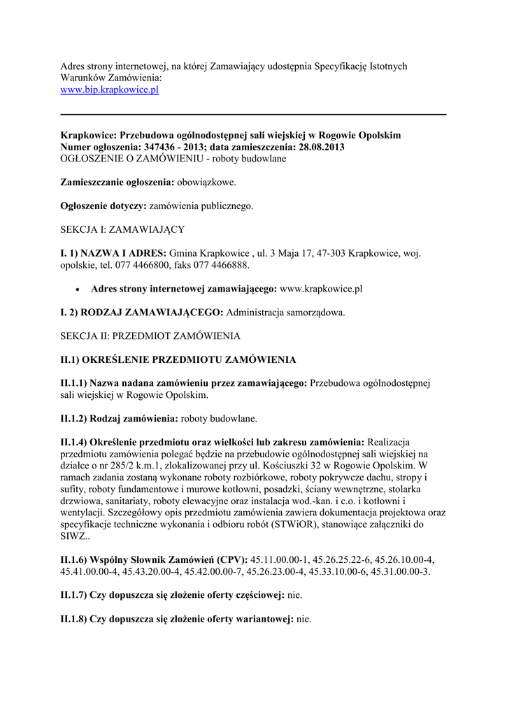 Adres strony internetowej, na której Zamawiający udostępnia Specyfikację Istotnych Warunków Zamówienia: www.bip.krapkowice.pl Krapkowice: Przebudowa ogólnodostępnej sali wiejskiej w Rogowie Opolskim Numer ogłoszenia: 347436 - 2013; data zamieszczenia: 28.08.2013 OGŁOSZENIE O ZAMÓWIENIU - roboty budowlane Zamieszczanie ogłoszenia: obowiązkowe. Ogłoszenie dotyczy: zamówienia publicznego. SEKCJA I: ZAMAWIAJĄCY I. 1) NAZWA I ADRES: Gmina Krapkowice , ul. 3 Maja 17, 47-303 Krapkowice, woj. opolskie, tel. 077 4466800, faks 077 4466888. Adres strony internetowej zamawiającego: www.krapkowice.pl I. 2) RODZAJ ZAMAWIAJĄCEGO: Administracja samorządowa. SEKCJA II: PRZEDMIOT ZAMÓWIENIA II.1) OKREŚLENIE PRZEDMIOTU ZAMÓWIENIA II.1.1) Nazwa nadana zamówieniu przez zamawiającego: Przebudowa ogólnodostępnej sali wiejskiej w Rogowie Opolskim. II.1.2) Rodzaj zamówienia: roboty budowlane. II.1.4) Określenie przedmiotu oraz wielkości lub zakresu zamówienia: Realizacja przedmiotu zamówienia polegać będzie na przebudowie ogólnodostępnej sali wiejskiej na działce o nr 285/2 k.m.1, zlokalizowanej przy ul. Kościuszki 32 w Rogowie Opolskim. W ramach zadania zostaną wykonane roboty rozbiórkowe, roboty pokrywcze dachu, stropy i sufity, roboty fundamentowe i murowe kotłowni, posadzki, ściany wewnętrzne, stolarka drzwiowa, sanitariaty, roboty elewacyjne oraz instalacja wod.-kan. i c.o. i kotłowni i wentylacji. Szczegółowy opis przedmiotu zamówienia zawiera dokumentacja projektowa oraz specyfikacje techniczne wykonania i odbioru robót (STWiOR), stanowiące załączniki do SIWZ.. II.1.6) Wspólny Słownik Zamówień (CPV): 45.11.00.00-1, 45.26.25.22-6, 45.26.10.00-4, 45.41.00.00-4, 45.43.20.00-4, 45.42.00.00-7, 45.26.23.00-4, 45.33.10.00-6, 45.31.00.00-3. II.1.7) Czy dopuszcza się złożenie oferty częściowej: nie. II.1.8) Czy dopuszcza się złożenie oferty wariantowej: nie. II.2) CZAS TRWANIA ZAMÓWIENIA LUB TERMIN WYKONANIA: Zakończenie: 31.01.2014. SEKCJA III: INFORMACJE O CHARAKTERZE PRAWNYM, EKONOMICZNYM, FINANSOWYM I TECHNICZNYM III.1) WADIUM Informacja na temat wadium: 1. Zamawiający żąda wniesienia wadium w wysokości 8 000 zł. 2. Wadium należy wnieść przed upływem terminu składania ofert. 3. Wadium może być wniesione w jednej lub kilku następujących formach: - pieniądzu , - poręczeniach bankowych lub poręczeniach spółdzielczej kasy oszczędnościowo- kredytowej, z tym że poręczenie kasy jest zawsze poręczeniem pieniężnym, - gwarancjach bankowych, - gwarancjach ubezpieczeniowych, - poręczeniach udzielanych przez podmioty, o których mowa w art. 6b ust. 5 pkt 2 ustawy z dnia 9 listopada 2000 r. o utworzeniu Polskiej Agencji Rozwoju Przedsiębiorczości (tekst jednolity Dz.U z 2007 r. . Nr 42, poz. 275). 4.Wadium wnoszone w formie pieniężnej należy wpłacić przelewem na rachunek bankowy: Urząd Miasta i Gminy w Krapkowicach, Bank Spółdzielczy w Krapkowicach, nr rachunku 66 8884 0004 2001 0000 7777 0002 z dopiskiem - wadium-postępowanie przetargowe : Przebudowa ogólnodostępnej Sali w Rogowie Opolskim 5.Wadium wnoszone w pozostałych formach należy złożyć przed upływem terminu na składanie ofert w Wydziale Finansowo-Budżetowym Urzędu Miasta i Gminy w Krapkowicach przy ul. 3 Maja 17, parter, pokój nr 14. 6.W przypadku wniesienia wadium w pieniądzu przelew należy dokonać na tyle wcześniej, by wadium znalazło się na rachunku Zamawiającego przed upływem terminu składania ofert. 7.Wykonawca, który nie wniesie w wymaganym terminie wadium zostanie wykluczony z postępowania. 8. Wykonawca, którego oferta została wybrana traci wadium wraz z odsetkami na rzecz Zamawiającego w okolicznościach przewidzianych w art. 46 ust. 4a i 5 ustawy Prawo zamówień publicznych. III.2) ZALICZKI III.3) WARUNKI UDZIAŁU W POSTĘPOWANIU ORAZ OPIS SPOSOBU DOKONYWANIA OCENY SPEŁNIANIA TYCH WARUNKÓW III. 3.1) Uprawnienia do wykonywania określonej działalności lub czynności, jeżeli przepisy prawa nakładają obowiązek ich posiadania Opis sposobu dokonywania oceny spełniania tego warunku o Zamawiający nie wyznacza szczegółowego warunku w tym zakresie. III.3.2) Wiedza i doświadczenie Opis sposobu dokonywania oceny spełniania tego warunku o Wykonawca winien wykazać, iż w okresie ostatnich 5 lat przed upływem terminu składania ofert, a jeżeli okres prowadzenia działalności jest krótszy w tym okresie wykonał w sposób należyty, zgodnie z zasadami sztuki budowlanej i prawidłowo ukończył przynajmniej dwie roboty polegającą na przebudowie lub remoncie obiektu kubaturowego o kubaturze nie mniejszej niż 2 300 m3. III.3.3) Potencjał techniczny Opis sposobu dokonywania oceny spełniania tego warunku o Zamawiający nie wyznacza szczegółowego warunku w tym zakresie. III.3.4) Osoby zdolne do wykonania zamówienia Opis sposobu dokonywania oceny spełniania tego warunku Zamawiający nie wyznacza szczegółowego warunku w tym zakresie. III.3.5) Sytuacja ekonomiczna i finansowa o Opis sposobu dokonywania oceny spełniania tego warunku o Wykonawca winien posiadać środki finansowe lub zdolność kredytową w wysokości nie mniejszej niż 200 tys. zł. lub polegać na zasobach finansowych innych podmiotów, niezależnie od charakteru prawnego łączących go z nimi stosunków. III.4) INFORMACJA O OŚWIADCZENIACH LUB DOKUMENTACH, JAKIE MAJĄ DOSTARCZYĆ WYKONAWCY W CELU POTWIERDZENIA SPEŁNIANIA WARUNKÓW UDZIAŁU W POSTĘPOWANIU ORAZ NIEPODLEGANIA WYKLUCZENIU NA PODSTAWIE ART. 24 UST. 1 USTAWY III.4.1) W zakresie wykazania spełniania przez wykonawcę warunków, o których mowa w art. 22 ust. 1 ustawy, oprócz oświadczenia o spełnianiu warunków udziału w postępowaniu należy przedłożyć: wykaz robót budowlanych wykonanych w okresie ostatnich pięciu lat przed upływem terminu składania ofert albo wniosków o dopuszczenie do udziału w postępowaniu, a jeżeli okres prowadzenia działalności jest krótszy - w tym okresi