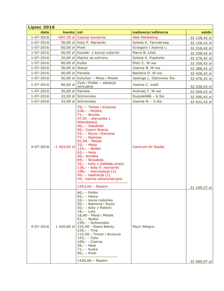 Lipiec 2016 data kwota cel 1-07-2016 -597,78 zł Czynsz kociarnia 1-07-2016 nadawca/odbiorca saldo A&A Marketing 32 128,42 zł 30,00 zł Koty P. Marzenki Sylwia K. Tarnobrzeg 32 158,42 zł 1-07-2016 60,00 zł Pixel Grzegorz i Joanna L. 32 218,42 zł 1-07-2016 40,00 zł Kociaki z kociej rodzinki Maria B. Łódź 32 258,42 zł 1-07-2016 20,00 zł Markiz ze schronu Sylwia K. Popówko 32 278,42 zł 1-07-2016 80,00 zł Kulka Piotr C. W-wa 32 358,42 zł 1-07-2016 30,00 zł Wasyl Joanna B. W-wa 32 388,42 zł 1-07-2016 40,00 zł Pamela Barbara D. W-wa 32 428,42 zł 1-07-2016 Jadwiga L. Ostrowiec Św. 32 478,42 zł Joanna C. Łódź 1-07-2016 50,00 zł Kotylion – Misia i Misiek Zyta i Fiołek – adopcja 60,00 zł wirtualna 30,00 zł Pamela Andrzej T. W-wa 32 568,42 zł 1-07-2016 22,00 zł Schronisko Duszek686 – b.Sis 32 590,42 zł 1-07-2016 32,00 zł Schronisko Joanna N. - b.Sis 32 622,42 zł 1-07-2016 4-07-2016 4-07-2016 70,- - Timon i druzyna 236,- - Pestka 71,- - Brunia 47,01 - staruszka z Wierzbowej 90,- - Sokolniki 90,- Czarni Bracia 22,- - Rysio i Ramona 77,- - Ramzes 81,04 - Misiak 33,- - Misia -1 453,05 zł 122,- - Nellek 63,- - Hela 40,- Amelka 69,- - BrzydUla 32,- - koty z Zakładu pracy 126,- - koty P. marzenki 100,- - sterylizacja (1) 50,- - kastracja (1) 44,- karma weterynaryjna --------------------------------1453,05 – Razem 60,- - Feliks 65,- - Hania 10,- - kocia rodzinka 50,- - Ramona i Rysio 20,- - koty z Retkini 18,- - Lola 18,60 - Misia i Misiek 61,- - Nutka 159,- - Schronisko 1 420,60 zł 216,50 - Stare Bałuty 235,- - Tina 115,50 - Timon i drużyna 102,- - Zyta 100,- - Czarna 29,- - Hela 71,- - Kulka 90,- - Pixel -------------------------1420,60 – Razem 32 538,42 zł Centrum Dr Siedla 31 169,37 zł PayU Allegro 32 589,97 zł 4-07-2016 100,00 zł Hela Grzegorz i Joanna L. 32 689,97 zł 4-07-2016 25,00 zł Amelka Andrzej D – od Hatsu 32 714,97 zł 4-07-2016 18,86 zł Hela Radosłąw S. Częstochowa 32 733,83 zł 4-07-2016 100,00 zł Kulka Grzegorz i Joanna L. 32 833,83 zł 4-07-2016 30,00 zł Wituń Monika H-T 32 863,83 zł Ala i Adam J. Wrocław 32 893,83 zł 4-07-2016 4-07-2016 5-07-2016 5-07-2016 5-07-2016 5-07-2016 5-07-2016 30,00 zł Pestka – adopcja wirtualna karma kociarnia – 100,- , -224,56 zł maluchy w hoteliku – 124,56 -37,60 zł Wysyłki allegro 20,00 zł Markiz 150,00 zł Koty Joli Dworcowej Leczenie kotów: Hektor, 200,00 zł Zepsutka2, Markiz, Pixel 50,00 zł Adaś – adopcja wirtualna Zooplus 32 669,27 zł 32 631,67 zł Martyna Cz. Łódź 32 651,67 zł anonimowy darczyńca 32 801,67 zł anonimowy darczyńca Marika Sz-M. Łódź 33 001,67 zł 33 051,67 zł 5-07-2016 30,00 zł Zepsutka2 Monika D. Łódź 33 081,67 zł 5-07-2016 30,00 zł Hektor Ewa R. Łódź 33 111,67 zł 50,00 zł Zepsutka2 Joanna M. Łódź 33 161,67 zł Aleksandra K. Dzierżoniów 33 284,67 zł Karol B. Przysucha 33 334,67 zł Joanna P. Olsztyn 33 339,67 zł 5-07-2016 5-07-2016 5-07-2016 123,00 zł Torby 50,00 zł Zepsutka2 5-07-2016 5,00 zł Zepsutka2 5-07-2016 50,00 zł Zepsutka2 Stanisława Sz-S Rybnik 33 389,67 zł 5-07-2016 50,00 zł Zepsutka2 Łukasz K. Konstantynów Ł. 33 439,67 zł 5-07-2016 50,00 zł Zepsutka2 Wiesława N.S. Łódź 33 489,67 zł 5-07-2016 32,00 zł Torby Anna L. Łódź 33 521,67 zł 6-07-2016 70,00 zł Schronisko Joanna N. 33 591,67 zł 6-07-2016 40,00 zł Fiołek – adopcja wirtualna Joanna Z. Koszalin 33 631,67 zł 6-07-2016 50,00 zł Piratka Sylwia K. Marki 33 681,67 zł 7-07-2016 10,00 zł Kociaki w hoteliku – b.andorka Beata S. Kluczbork 7-07-2016 35,00 zł Kociaki w hoteliku – b.andorka Czarno-czarni 7-07-2016 7-07-2016 7-07-2016 7-07-2016 200,00 zł Leczenie kotów: Hektor, Lisek 30,00 zł Ptyś – adopcja wirtualna 5,00 zł Kotylion Kamila L-N Świdwin Justyna H. Łódź 33 691,67 zł 33 726,67 zł 33 926,67 zł 33 956,67 zł Edyta W. Gdynia 33 961,67 zł anonimowy darczyńca 33 991,67 zł Lecznica Wardęszkiewicz 7-07-2016 30,00 zł Hela – adopcja wirtualna 50,- kociaki hotelik, 80,- koty -220,00 zł z Retkini, 90,- Ovo -424,00 zł 267 – Piratka, 157 – Hektor Klinika Szulca 33 347,67 zł 7-07-2016 -353,00 zł Piratka Klinika Szulca 32 994,67 zł 7-07-2016 -21,00 zł Wysyłki allegro 113,40 – Lily, 80,- kociarnia -193,40 zł karma -418,48 zł Kociarnia – karma wet. 7-07-2016 8-07-2016 8-07-2016 33 771,67 zł 32 973,67 zł Zooplus 32 780,27 zł Zooplus 32 361,79 zł 8-07-2016 50,00 zł Kociarnia Kotyliona Dagmara L. Ostrów Wlkp. 32 411,79 zł 8-07-2016 10,00 zł Kotylion Marzena R. Łódź 32 421,79 zł 8-07-2016 50,00 zł Koty Starszego Pana Dagmara L. Ostrów Wlkp. 32 471,79 zł 9-07-2016 30,00 zł Fiołek Ewa L. Łódź 32 501,79 zł 9-07-2016 20,20 zł Torba Natalia K-B Lublin 32 521,99 zł 9-07-2016 30,00 zł Sugar Ewa L. Łódź 32 551,99 zł 11-07-2016 30,00 zł Zyta – adopcja wirtualna Agnieszka M. Piotrków 32 581,99 zł 11-07-2016 11-07-2016 37,49 zł Lisek – myszki z allegro Justyna K. Szczecin 32 619,48 zł 60,00 zł Czarni Bracia z Sokolnik Kalina, Krzysztof, Janusz Z. 11-07-2016 32 679,48 zł 14,00 zł Piratka Małgorzata D. Ciechanów 32 693,48 zł 11-07-2016 30,00 zł Piratka Katarzyna K. Jaworzno 32 723,48 zł 11-07-2016 700,00 zł Piratka Aleksander B. - PayPal 33 423,48 zł 11-07-2016 600,00 zł Kociarnia Kotyliona Katarzyna i Maciej M. - PayPal 11-07-2016 100,00 zł Koty P. Marzenki 34 023,48 zł 34 123,48 zł 11-07-2016 50,00 zł Kotylion – Lisek i Kicia Iwona N. Konstatntynów 34 173,48 zł 11-07-2016 15,00 zł Kotylion – Lisek Sebastian R. Kolonia Góra P. 34 188,48 zł 11-07-2016 10,00 zł Lisek Magdalena Cz. Łódź 34 198,48 zł 11-07-2016 10,00 zł Piratka Monika M. Łódź 34 208,48 zł 12-07-2016 12,00 zł Lisek Milena C. Łódź 34 220,48 zł 12-07-2016 50,00 zł Koty z Sokolnik Aneta K. Zgierz 34 270,48 zł 12-07-2016 200,00 zł Hektor Małgorzata Z. Łódź 34 470,48 zł 13-07-2016 30,00 zł Lily Bałuckie podwórko – adopcja 120,00 zł wirtualna 15,24 zł Piratka Joanna K. Łódź