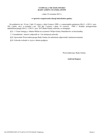 UCHWAŁA NR XXIX/155/2013 RADY GMINY STANISŁAWÓW z dnia 19 września 2013 r. w sprawie rozpatrzenia skargi mieszkańca gminy. Na podstawie art. 18 ust. 2 pkt 15 ustawy z dnia 8 marca 1990 r. o samorządzie gminnym (Dz.U. z 2013 r. poz. 594 z późn. zm.) w związku z art. 229 pkt 3 ustawy z dnia 14 czerwca 1960 r. Kodeks postępowania administracyjnego (Dz.U. z 2013 r. poz. 267) Rada Gminy uchwala, co następuje: § 1. 1. Uznać skargę p. Adama Micha na czynności Wójta Gminy Stanisławów za bezzasadną. 2. Uzasadnienie stanowi załącznik nr 1 do niniejszej uchwały. § 2. Upoważnić Przewodniczącego Rady Gminy do udzielenia odpowiedzi zainteresowanemu. § 3. Uchwała wchodzi w życie z dniem podjęcia. Przewodniczący Rady Gminy Andrzej Kopacz Id: E207D9FD-9823-477A-B316-5315781AD4A0. Podpisany Strona 1 Uzasadnienie W dniu 15 .10.2012 roku Wójt Gminy Stanisławów wydał postanowienie Nr RIiGK .5.2012 i ustalił koszty postępowania rozgraniczeniowego na kwotę 2.700 złotych a do ich poniesienia zobowiązał każdą ze stron w równych częściach po 1.350 złotych. Państwo: Wiesławę i Jana Berchman oraz Państwo Janinę i Adama Mich. Na postanowienie, w ustawowym terminie, zażalenie złożyli Państwo Wiesława i Jan Berchman. Postanowieniu strony zarzuciły naruszenie przepisów postępowania tj. art. 262, 263, 264 § 1 kpa, poprzez błędną ich wykładnię, polegającą na obciążeniu połową kosztów postępowania rozgraniczeniowego wszystkich stron tego postępowania. Żalący wnieśli o uchylenie zaskarżonego postanowienia i umorzenia postępowania w sprawie. Samorządowe Kolegium Odwoławcze na podstawie zgromadzonych akt sprawy jak również kierując się treścią postanowienia zważyło co następuje: Zgodnie z art.29 ust. l ustawy z dnia 17 mają 1989 roku Prawo geodezyjne i kartograficzne (Dz. U. z 2010 r Nr 193 poz.1287 z późn. zm.) rozgraniczenie nieruchomości ma na celu ustalenie przebiegu ich granic poprzez określenie położenia punktów i linii granicznych oraz sporządzenia odpowiednich dokumentów. Czynności ustalenia przebiegu granic wykonuje geodeta upoważniony przez Wójta. Koszty udziału geodety uprawnionego w tym postępowaniu są kosztami postępowania administracyjnego, o których mowa w art.263 § l i 2 Kpa. Jednakże zgodnie z uchwałą Naczelnego Sądu Administracyjnego z dnia 11 grudnia 2006 roku sygn. I OPS.5/06 podjętą w powiększonym składzie siedmiu sędziów, wójt, prezydent może obciążyć kosztami rozgraniczenia strony będące właścicielami nieruchomości, a nie tylko tego kto wystąpił o wszczęcie postępowania. O takim rozstrzygnięciu zadecydowały dwie okoliczności. Rozgraniczenie leży w interesie obu sąsiadów, skoro granice z jakichś względów stały się sporne. Tak jest również, w sytuacji, w której ten drugi nie kwestionuje przebiegu granic. Druga kwestia to przepisy Kodeksu cywilnego dot. rozgraniczenia. Przepisy te obowiązują nie tylko wówczas, gdy sprawa wskutek np. zakwestionowania decyzji o rozgraniczeniu wydanej przez Wójta ( burmistrza) trafia do sądu. Muszą być one respektowane także w trakcie postępowania toczącego się w gminie i tak zgodnie z art.152 Kodeksu cywilnego ( Oz U z 1964 Nr 16 poz.93 z późn zm) właściciele gruntów sąsiadujących obowiązani są do współdziałania w rozgraniczeniu gruntów oraz utrzymywaniu znaków granicznych. Zapisano w nim w sposób jednoznaczny, że „koszty rozgraniczenia ponoszą po połowie”. Tym samym rozgraniczenie nieruchomości przeprowadzono w interesie właścicieli obu rozgraniczanych działek. W związku z tym Samorządowe Kolegium Odwoławcze postanowiło utrzymać w mocy zaskarżone postanowienie Wójta Gminy. W dniu 23.02.2013 roku zostało wszczęte postępowanie egzekucyjne – wysłane zostało upomnienie na kwotę 1.402,55 zł do Państwa Berchman w sprawie uiszczenia należności tytułem rozgraniczenia nieruchomości i do wiadomości dostali Państwo Mich Następnie w dniu 16.04.2013 roku Państwo Wiesława i Jan Berchman złożyli do Wójta Gminy podanie z prośbą o rozłożenie należności na raty po 200 zł miesięcznie motywując trudną sytuacją materialną. W dniu 22.04.2013 roku pracownik Urzędu Gminy przeprowadził rozmowę telefoniczną z Panem Michem, informując, że Państwo Berchman złożyli do Wójta Gminy podanie o rozłożenie należności na raty. W trakcie prowadzonej rozmowy telefonicznej p Adam Mich poinformował, że kwota miesięcznej raty w wysokości 200 zł jest zbyt mała i nie będzie czekał do zimy na spłacenie całej należności. Jednakże po dłuższej rozmowie zgodził się na raty po 300 zł miesięcznie podając numer konta bankowego. Na podstawie Uchwały nr XXIII147/09 Rady Gminy Stanisławów z dnia 29 lipca 2009 roku zgodnie z § 7 ust. 1 Wójt Gminy Stanisławów może samodzielnie umorzyć należność określona w § 1 niniejszej uchwały Id: E207D9FD-9823-477A-B316-5315781AD4A0. Podpisany Strona 1 lub udzielić ulgi w jej spłaceniu (odroczyć termin zapłaty, rozłożyć na raty) jeżeli należność ta nie przekracza 2 – krotnej wysokości przeciętnego wynagrodzenia miesięcznego ogłaszanego kwartalnie przez Prezesa Głównego Urzędu Statystycznego. W dniu 25.04.2013 roku Wójt Gminy postanowił należności rozłożyć na miesięczne raty gdzie na bieżąco należności będą przekazywane na konto bankowe p Mich. W dniu 23.05.2013 roku wpłynęło pismo od Państwa Janiny i Adama Mich dot spłaty połowy kosztów rozgraniczenia i naliczenia odsetek od tych należności W dniu 06.06.2013 roku Wójt Gminy udzielił odpowiedzi na pismo p Micha w sprawie kosztów rozgraniczenia jak również należnych odsetek, informując, że brak jest podstaw do żądania rozliczenia kosztów w trybie administracyjnym, dlatego w postanowieniu organ administracji rozdzielił wyłącznie rzeczywiste koszty rozgraniczenia. Podstawą do żądania rozliczeniowego kosztów jest pra