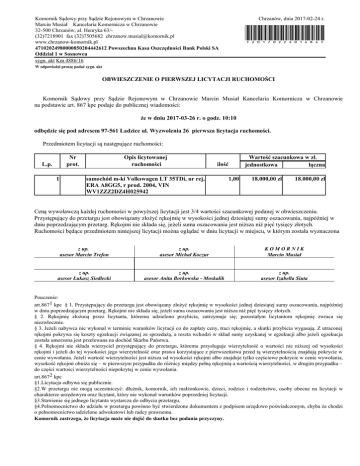 Komornik Sądowy przy Sądzie Rejonowym w Chrzanowie Marcin Musiał Kancelaria Komornicza w Chrzanowie 32-500 Chrzanów, al. Henryka 63/(32)7218901 fax (32)7505682 [email protected] www.chrzanow-komornik.pl 47102024980000850204442612 Powszechna Kasa Oszczędności Bank Polski SA Oddział 1 w Sosnowcu sygn. akt Km 4886/16 Chrzanów, dnia 2017-02-24 r. *2017022401484* W odpowiedzi proszę podać sygn. akt OBWIESZCZENIE O PIERWSZEJ LICYTACJI RUCHOMOŚCI Komornik Sądowy przy Sądzie Rejonowym w Chrzanowie Marcin Musiał Kancelaria Komornicza w Chrzanowie na podstawie art. 867 kpc podaje do publicznej wiadomości: że w dniu 2017-03-26 r. o godz. 10:10 odbędzie się pod adresem 97-561 Ładzice ul. Wyzwolenia 26 pierwsza licytacja ruchomości. Przedmiotem licytacji są następujące ruchomości: Nr prot. L.p. 1 Opis licytowanej ruchomości Wartość szacunkowa w zł. jednostkowa łączna ilość samochód m-ki Volkswagen LT 35TDi, nr rej, ERA A8GG5, r prod. 2004, VIN WV1ZZZ2DZ4H025942 1,00 18.000,00 zł 18.000,00 zł Ceną wywoławczą każdej ruchomości w powyższej licytacji jest 3/4 wartości szacunkowej podanej w obwieszczeniu. Przystępujący do przetargu jest obowiązany złożyć rękojmię w wysokości jednej dziesiątej sumy oszacowania, najpóźniej w dniu poprzedzającym przetarg. Rękojmi nie składa się, jeżeli suma oszacowania jest niższa niż pięć tysięcy złotych. Ruchomości będące przedmiotem niniejszej licytacji można oglądać w dniu licytacji w miejscu, w którym została wyznaczona z up. asesor Marcin Trefon z up. asesor Michał Koczur KOMORNIK Marcin Musiał z up. asesor Łukasz Siedlecki z up. asesor Anita Borkowska - Moskalik z up. asesor Izabella Siuta Pouczenie: art.8671 kpc § 1. Przystępujący do przetargu jest obowiązany złożyć rękojmię w wysokości jednej dziesiątej sumy oszacowania, najpóźniej w dniu poprzedzającym przetarg. Rękojmi nie składa się, jeżeli suma oszacowania jest niższa niż pięć tysięcy złotych. § 2. Rękojmię złożoną przez licytanta, któremu udzielono przybicia, zatrzymuje się; pozostałym licytantom rękojmię zwraca się niezwłocznie. § 3. Jeżeli nabywca nie wykonał w terminie warunków licytacji co do zapłaty ceny, traci rękojmię, a skutki przybicia wygasają. Z utraconej rękojmi pokrywa się koszty egzekucji związanej ze sprzedażą, a reszta wchodzi w skład sumy uzyskanej w egzekucji albo jeżeli egzekucja została umorzona jest przelewana na dochód Skarbu Państwa. § 4. Rękojmi nie składa wierzyciel przystępujący do przetargu, któremu przysługuje wierzytelność o wartości nie niższej od wysokości rękojmi i jeżeli do tej wysokości jego wierzytelność oraz prawa korzystające z pierwszeństwa przed tą wierzytelnością znajdują pokrycie w cenie wywołania. Jeżeli wartość wierzytelności jest niższa od wysokości rękojmi albo znajduje tylko częściowe pokrycie w cenie wywołania, wysokość rękojmi obniża się – w pierwszym przypadku do różnicy między pełną rękojmią a wartością wierzytelności, w drugim przypadku – do części wartości wierzytelności niepokrytej w cenie wywołania. art.8672 kpc §1.Licytacja odbywa się publicznie. §2.W przetargu nie mogą uczestniczyć: dłużnik, komornik, ich małżonkowie, dzieci, rodzice i rodzeństwo, osoby obecne na licytacji w charakterze urzędowym oraz licytant, który nie wykonał warunków poprzedniej licytacji. §3.Stawienie się jednego licytanta wystarcza do odbycia przetargu. §4.Pełnomocnictwo do udziału w przetargu powinno być stwierdzone dokumentem z podpisem urzędowo poświadczonym, chyba że chodzi o pełnomocnictwo udzielone adwokatowi lub radcy prawnemu. Komornik zastrzega, że licytacja może nie dojść do skutku bez podania przyczyny.