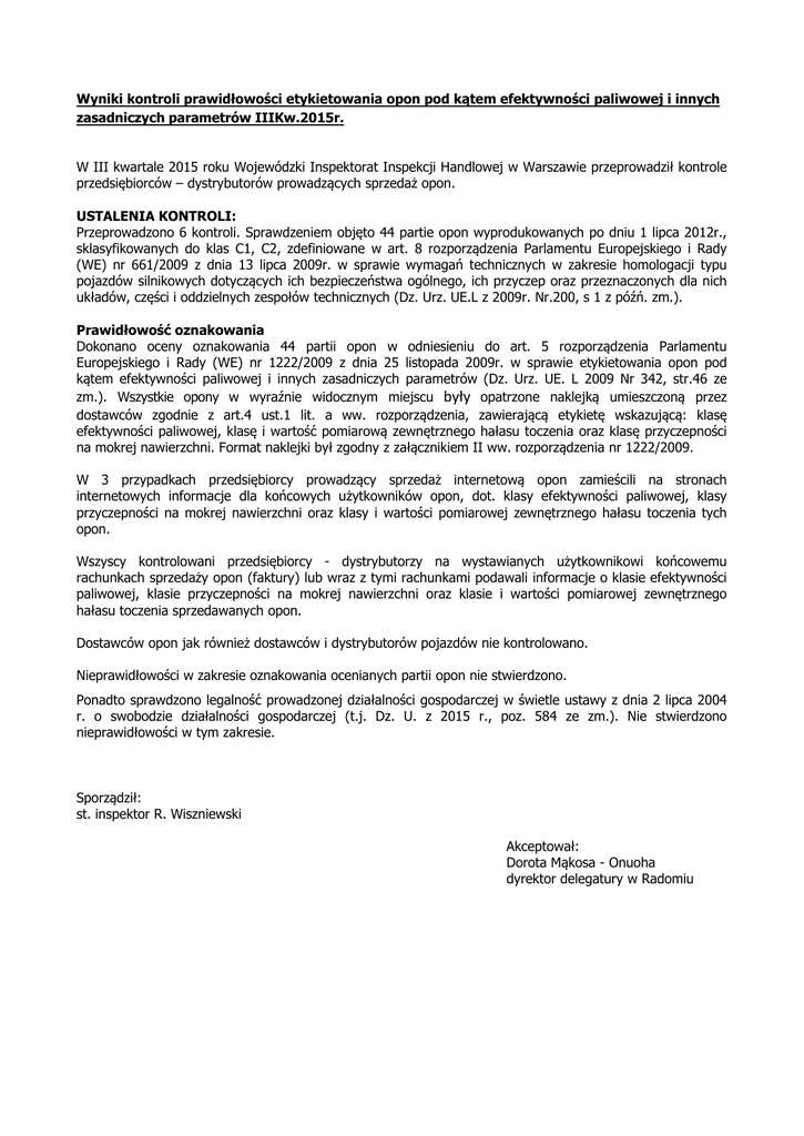 Wyniki kontroli prawidłowości etykietowania opon pod kątem efektywności paliwowej i innych zasadniczych parametrów IIIKw.2015r. W III kwartale 2015 roku Wojewódzki Inspektorat Inspekcji Handlowej w Warszawie przeprowadził kontrole przedsiębiorców – dystrybutorów prowadzących sprzedaż opon. USTALENIA KONTROLI: Przeprowadzono 6 kontroli. Sprawdzeniem objęto 44 partie opon wyprodukowanych po dniu 1 lipca 2012r., sklasyfikowanych do klas C1, C2, zdefiniowane w art. 8 rozporządzenia Parlamentu Europejskiego i Rady (WE) nr 661/2009 z dnia 13 lipca 2009r. w sprawie wymagań technicznych w zakresie homologacji typu pojazdów silnikowych dotyczących ich bezpieczeństwa ogólnego, ich przyczep oraz przeznaczonych dla nich układów, części i oddzielnych zespołów technicznych (Dz. Urz. UE.L z 2009r. Nr.200, s 1 z późń. zm.). Prawidłowość oznakowania Dokonano oceny oznakowania 44 partii opon w odniesieniu do art. 5 rozporządzenia Parlamentu Europejskiego i Rady (WE) nr 1222/2009 z dnia 25 listopada 2009r. w sprawie etykietowania opon pod kątem efektywności paliwowej i innych zasadniczych parametrów (Dz. Urz. UE. L 2009 Nr 342, str.46 ze zm.). Wszystkie opony w wyraźnie widocznym miejscu były opatrzone naklejką umieszczoną przez dostawców zgodnie z art.4 ust.1 lit. a ww. rozporządzenia, zawierającą etykietę wskazującą: klasę efektywności paliwowej, klasę i wartość pomiarową zewnętrznego hałasu toczenia oraz klasę przyczepności na mokrej nawierzchni. Format naklejki był zgodny z załącznikiem II ww. rozporządzenia nr 1222/2009. W 3 przypadkach przedsiębiorcy prowadzący sprzedaż internetową opon zamieścili na stronach internetowych informacje dla końcowych użytkowników opon, dot. klasy efektywności paliwowej, klasy przyczepności na mokrej nawierzchni oraz klasy i wartości pomiarowej zewnętrznego hałasu toczenia tych opon. Wszyscy kontrolowani przedsiębiorcy - dystrybutorzy na wystawianych użytkownikowi końcowemu rachunkach sprzedaży opon (faktury) lub wraz z tymi rachunkami podawali informacje o klasie efektywności paliwowej, klasie przyczepności na mokrej nawierzchni oraz klasie i wartości pomiarowej zewnętrznego hałasu toczenia sprzedawanych opon. Dostawców opon jak również dostawców i dystrybutorów pojazdów nie kontrolowano. Nieprawidłowości w zakresie oznakowania ocenianych partii opon nie stwierdzono. Ponadto sprawdzono legalność prowadzonej działalności gospodarczej w świetle ustawy z dnia 2 lipca 2004 r. o swobodzie działalności gospodarczej (t.j. Dz. U. z 2015 r., poz. 584 ze zm.). Nie stwierdzono nieprawidłowości w tym zakresie. Sporządził: st. inspektor R. Wiszniewski Akceptował: Dorota Mąkosa - Onuoha dyrektor delegatury w Radomiu