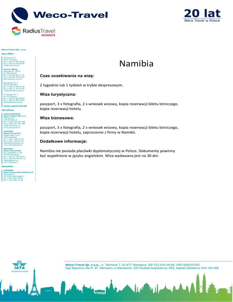 Namibia Czas oczekiwania na wizę: 2 tygodnie lub 1 tydzień w trybie ekspresowym. Wiza turystyczna: paszport, 3 x fotografia, 2 x wniosek wizowy, kopia rezerwacji biletu lotniczego, kopia rezerwacji hotelu. Wiza biznesowa: paszport, 3 x fotografia, 2 x wniosek wizowy, kopia rezerwacji biletu lotniczego, kopia rezerwacji hotelu, zaproszenie z firmy w Namibii. Dodatkowe informacje: Namibia nie posiada placówki dyplomatycznej w Polsce. Dokumenty powinny być wypełnione w języku angielskim. Wiza wydawana jest na 30 dni.