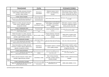 22.02. 2016 ŚNIADANIE ZUPA I Owsianka na mleku, pieczywo mieszane, masło, kiełbasa żywiecka podsuszana, pomidor, sałata, herbata Gulaszowa z ziemniakami Makaron razowy z serem białym, sos truskawkowy, kompot Chleb ciemny sojowy z masłem, szynka wiejska, papryka, ogórek świeży, mandarynka, kawa inka wywar marzywno-mięsny, marcherka, por, seler, pietruszka, ziemniaki, papryka, cebula, koncentrat pomidorowy makaron razowy, ser biały, truskawki, wiśnia chleb sojowy, masło, szynka, papryka, ogórek świeży, kawa, mleko Ogórkowa z ziemniakami i natką Wieprzowina w sosie własnym, kasza jaglana, marchewka z groszkiem, sałata zielona, kompot Chleb żytni z ziarnem z masłem, kresowiak, rzodkiewka, ogórek świeży, gruszka, kawa inka wieprzowina, kasza jaglana, marchewka z groszkiem, sałata zielona, olej, przyprawy, porzeczka chleb, masło, kiełbasa kresowiak, rzodkiewka, ogórek kiszony, gruszka, kawa, mleko Ryż na rosole z natką Pulpety drobiowe, ziemniaki, surówka z buraków, cykoria, kompot Bułka żytnia z masłem,serek waniliowy, graprfruit, mleko wywar warzywno-mięsny, marchewka, seler, por, pietruszka, ryż, natka mięso z piersi indyka, mąka ziemniaki, buraki, ogórek kiszony, cebula, cykoria, olej , truskawka bułka, masło, ser biały, laska wanilii, mleko, II owoc- banan, kanapka mleko, płatki owsiane, chleb baltonowski, chleb sojowy, masło, kiełbasa żywiecka podsuszana, pomidor, sałata, herbata 23.02. 2016 24.02. 2016 Makaron na mleku, pieczywo mieszane, masło, szynka z wędzarki, pomidor, szczypiorek, herbata wywar marzywno-mięsny, II owoc- mandarynka, kisiel marcherka, por, seler, makaron, mleko, chleb baltonowski, chleb z ziarnem, masło, szynka, pietruszka,ogórki kiszone, śmietana, pomidor, szczypiorek, herbata natka I Płatki kukurydziane na mleku, pieczywo mieszkane z masłem, polędwica tradycyjna, pomidor, ogórek kiszony, herbata II owoc- mandarynka, kanapka płatki kukurydziane, mleko, chleb baltonowski, chleb zdrówko, masło, polędwica tradycyjna, pomidor, ogórek kiszony, herbata 25.02. 2016 I Kasza kukurydziana na mleku, pieczywo mieszkane z masłem, baleron odtłuszczony, papryka, szczypiorek, herbata II owoc- banan,herbatniki mleko, kasza kukurydziana, chleb baltonowski, chleb razowy, masło, baleron, papryka, szczypiorek, herbata 26.02. 2016 I Kakao, pieczywo mieszane, masło, salami, pomidor, ogórek kiszony, herbata II owoc- pomarańcza, kanapka mleko, kakao, chleb baltonowski, chleb 7 zbóż, masło, salami, pomodor, ogórek kiszony, herbata wyróżniono grubym drukiem alergeny Koperkowa z ziemniakami PODWIECZOREK Chleb razowy z masłem, szynka Sos spagetti, makaron, surówka pieczona z indyka, pomidor, sałata, z pora i jabłka, kompot winogrona, kawa inka wywar warzywno-mięsny, marchew, seler, por, pietruszka, koperek, śmietana łopatka wieprzowa, makaron, koncentrat pomidorowy, surówka -por, jabłko, oliwa z oliwek, cebula, wiśnia chleb razowy, masło, szynka z indyka, pomidor, sałata, winogrona, mleko, kawa Zacierkowa z natką Fitet z miruny smażony, ziemniaki, surówka z kapusty kiszonej, kompot Chałka z masłem, koktajl owocowy, herbata wywar warzywno-mięsny, mąka, marchew, por, pietruszka, seler, natka, przyprawy, olej, ryba, mąka orkiszowa,jaja, olej, ziemniaki, kapusta kiszona, porzeczka chałka, masło, maślanka , herbata