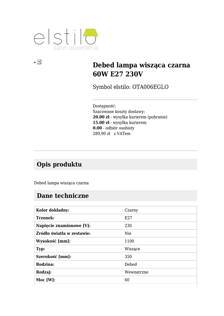 Debed lampa wisząca czarna 60W E27 230V ● Symbol elstilo: OTA006EGLO Dostępność: Szacowane koszty dostawy: 20.00 zł - wysyłka kurierem (pobranie) 15.00 zł - wysyłka kurierem 0.00 - odbiór osobisty 289,90 zł z VATem Opis produktu Debed lampa wisząca czarna Dane techniczne Kolor dokładny: Czarny Trzonek: E27 Napięcie znamionowe [V]: 230 Źródło światła w zestawie: Nie Wysokość [mm]: 1100 Typ: Wiszące Szerokość [mm]: 350 Rodzina: Debed Rodzaj: Wewnętrzne Moc [W]: 60 Kolor: Czarny Ilość źródeł światła: 1