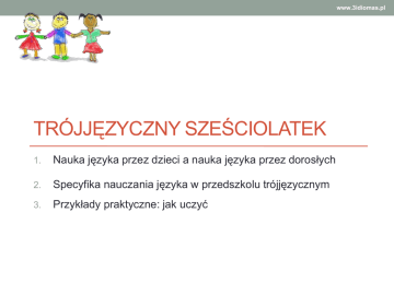 www.3idiomas.pl TRÓJJĘZYCZNY SZEŚCIOLATEK 1. Nauka języka przez dzieci a nauka języka przez dorosłych 2. Specyfika nauczania języka w przedszkolu trójjęzycznym 3. Przykłady praktyczne: jak uczyć www.3idiomas.pl Różnice w nauczaniu języka dorosłych i dzieci • Dorosłych motywuje nauka języka, dzieci wyłącznie przyjemność z tego czego się uczą • Dorośli są świadomi że i czego się uczą, dzieci nie( świadomość nauki jako procesu) • Dorośli porównują z językiem ojczystym, dzieci nie odróżniają języka ojczystego od obcego www.3idiomas.pl Różne metody używane w nauczaniu dorosłych i dzieci • Dorosłym wyjaśniamy jak „działa” język, dzieciom wyjaśniamy zabawę, jej reguły cały czas używając języka obcego • Z dorosłymi możemy robić ćwiczenia traktujące język jako strukturę, z dziećmi używamy języka jako narzędzia (zabawy, zajęć etc) www.3idiomas.pl Jak dzieci uczą się języków? • Główne źródła motywacji: zabawa, piosenki, krótkie rymowane wierszyki, zajęcia dostosowane do poziomu rozwoju i zainteresowań www.3idiomas.pl Co decyduje o sukcesie w nauce języka u dzieci • Uzywanie języka w kontekście naturalnym • Zabawy dostosowane do wieku i stopnia rozwoju dziecka • Pozytywne wzmocnienie! • „Motherese”-język nianiek (częste powtórzenia, uproszczone struktury) • Stworzenie częściowego zanurzenia w języku www.3idiomas.pl Jak uczymy w przedszkolu? • W przedszkolu uczymy i opiekujemy się „w języku” • 2 najważniejsze elementy: prawie całkowite zanurzenie i OPOL(One person one language) • Dostosowanie celów edukacyjnych do wieku dzieci • Włączenie do procesu Rodziców, którzy otrzymują zbiór szczegółowych informacji i aktualnych zajęciach i postępach dziecka W praktyce… • Żeby zobaczyć jak to robimy zapraszamy do obejrzenia filmu