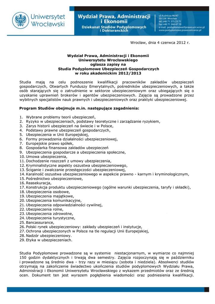 Wrocław, dnia 4 czerwca 2012 r. Wydział Prawa, Administracji i Ekonomii Uniwersytetu Wrocławskiego ogłasza zapisy na Studia Podyplomowe Ubezpieczeń Gospodarczych w roku akademickim 2012/2013 Studia mają na celu podnoszenie kwalifikacji pracowników zakładów ubezpieczeń gospodarczych, Otwartych Funduszy Emerytalnych, pośredników ubezpieczeniowych, a także osób starających się o zatrudnienie w sektorze ubezpieczeniowym oraz ubiegających się o uzyskanie uprawnień brokerów i agentów ubezpieczeniowych. Zajęcia są prowadzone przez wybitnych specjalistów nauk prawnych i ubezpieczeniowych oraz praktyki ubezpieczeniowej. Program Studiów obejmuje m.in. następujące zagadnienia: 1. Wybrane problemy teorii ubezpieczeń, 2. Ryzyko w ubezpieczeniach, podstawy teoretyczne i zarządzanie ryzykiem, 3. Zarys historii ubezpieczeń na świecie i w Polsce, 4. Podstawy prawne ubezpieczeń gospodarczych, 5. Ubezpieczenia w Unii Europejskiej, 6. Formy prowadzenia działalności ubezpieczeniowej, 7. Europejskie prawo spółek, 8. Gospodarka finansowa zakładów ubezpieczeń 9. Ubezpieczenia gospodarcze a ubezpieczenia społeczne, 10. Umowa ubezpieczenia, 11. Dochodzenie roszczeń z umowy ubezpieczenia, 12. Kryminalistyczne aspekty oszustwa ubezpieczeniowego, 13. Ściganie i zwalczanie przestępczości ubezpieczeniowej, 14. Karalność oszustwa ubezpieczeniowego w aspekcie prawno - karnym i kryminologicznym, 15. Pośrednictwo ubezpieczeniowe, 16. Reasekuracja, 17. Konstrukcja produktu ubezpieczeniowego (ogólne warunki ubezpieczenia, taryfy i składki), 18. Ubezpieczenia osobowe, 19. Ubezpieczenia majątkowe, 20. Ubezpieczenia komunikacyjne, 21. Ubezpieczenia odpowiedzialności cywilnej, 22. Ubezpieczenia rolne, 23. Ubezpieczenia zdrowotne, 24. Ubezpieczenia turystyczne, 25. Bancassurance, 26. Polski rynek ubezpieczeniowy: zakłady ubezpieczeń i instytucje, 27. Ochrona ubezpieczonych w Polsce na tle regulacji Unii Europejskiej, 28. Nadzór ubezpieczeniowy. 29. Etyka w ubezpieczeniach. Studia Podyplomowe prowadzone są w systemie niestacjonarnym, w wymiarze co najmniej 150 godzin dydaktycznych i trwają dwa semestry. Zajęcia rozpoczynają się w październiku i prowadzone są średnio dwa - trzy razy w miesiącu (sobota i niedziela). Absolwenci studiów otrzymają na zakończenie świadectwo ukończenia studiów podyplomowych Wydziału Prawa, Administracji i Ekonomii Uniwersytetu Wrocławskiego z wykazem przedmiotów oraz ze średnią ocen. Dokument ten jest wyrazem pogłębienia wiadomości oraz podniesienia kwalifikacji. Studia mają charakter dokształcający. Na studia może być przyjęta osoba posiadająca dyplom ukończenia studiów wyższych. Kandydaci powinni wypełnić formularz rejestracyjny www.irka.uni.wroc.pl oraz złożyć następujące dokumenty: ON-LINE na stronie 1. podanie o przyjęcie na studia podyplomowe adresowane do Rektora Uniwersytetu Wrocławskiego, 2. odpis dyplomu ukończenia studiów wyższych lub kserokopię dyplomu poświadczone przez jednostkę przyjmującą dokumenty, 3. umowę o warunkach wnoszenia opłaty za świadczone usługi edukacyjne na studiach podyplomowych (wzór umowy do pobrania ze strony internetowej), 4. kserokopię dowodu osobistego, 5. w przypadku studiów finansowanych z grantów - kopie innych dokumentów określonych w umowie o finansowanie studiów podyplomowych, 6. dwie fotografie o wymiarach 35 mm x 45 mm bez nakrycia głowy, na jasnym tle, podpisane imieniem i nazwiskiem. Kształcenie na studiach podyplomowych jest odpłatne. W roku akademickim 2012/2013 przewiduje się odpłatność od jednej osoby w wysokości około 2.950 zł za dwa semestry. Informujemy ponadto, że podejmujemy starania w celu pozyskania funduszy unijnych, które pozwoliłyby na obniżenie opłaty z tytułu kształcenia na studiach. Adres: Dziekanat Studiów Podyplomowych Wydziału Prawa, Administracji Uniwersytetu Wrocławskiego, Wrocław 50-138, ul. Kuźnicza 46/47, telefon: 71 37-52-371,email: [email protected] Adres internetowy: www.podyplomowe.prawo.uni.wroc.pl i Ekonomii Termin składania dokumentów od 18 czerwca 2012 r. do 30 września 2012 r. Zastrzegamy sobie prawo do nieuruchomienia studiów w razie braku odpowiedniej liczby Kandydatów.