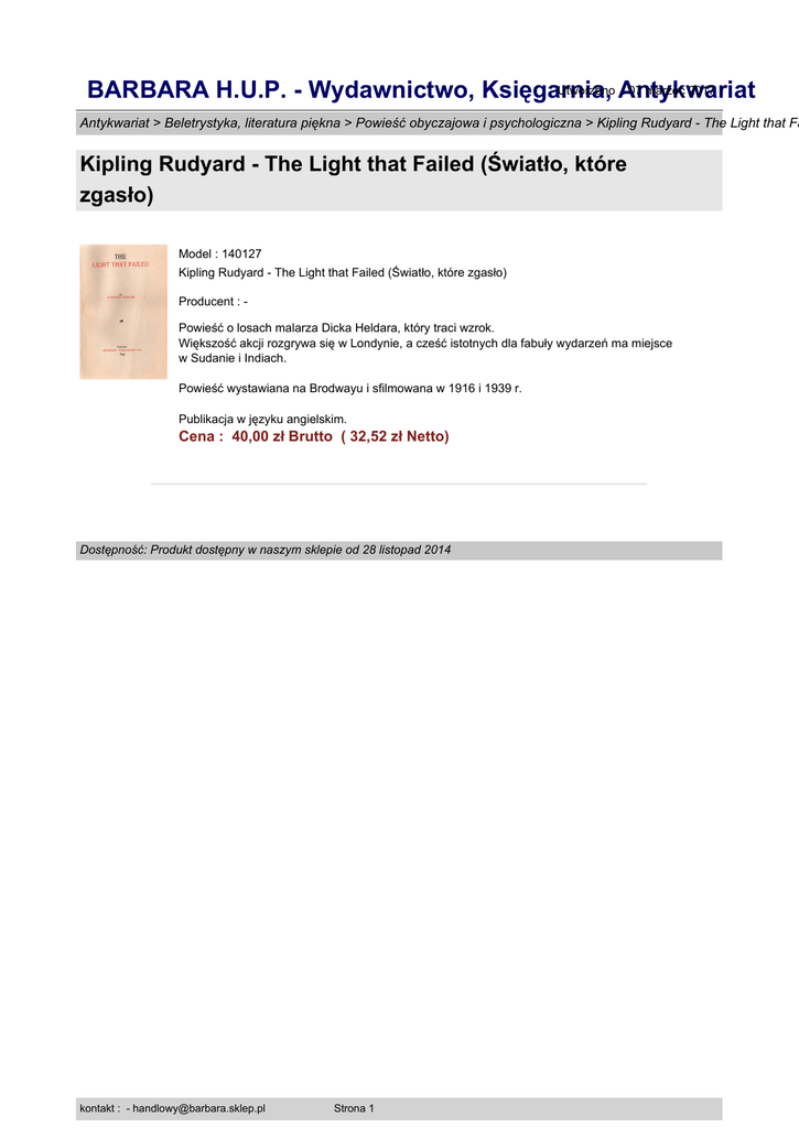 Utworzono Antykwariat : 07 marzec 2017 BARBARA H.U.P. - Wydawnictwo, Księgarnia, Antykwariat > Beletrystyka, literatura piękna > Powieść obyczajowa i psychologiczna > Kipling Rudyard - The Light that Fa Kipling Rudyard - The Light that Failed (Światło, które zgasło) Model : 140127 Kipling Rudyard - The Light that Failed (Światło, które zgasło) Producent : Powieść o losach malarza Dicka Heldara, który traci wzrok. Większość akcji rozgrywa się w Londynie, a cześć istotnych dla fabuły wydarzeń ma miejsce w Sudanie i Indiach. Powieść wystawiana na Brodwayu i sfilmowana w 1916 i 1939 r. Publikacja w języku angielskim. Cena : 40,00 zł Brutto ( 32,52 zł Netto) Dostępność: Produkt dostępny w naszym sklepie od 28 listopad 2014 kontakt : - [email protected] Strona 1