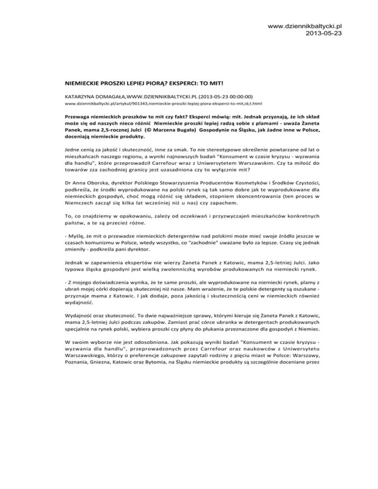 www.dziennikbaltycki.pl 2013-05-23 NIEMIECKIE PROSZKI LEPIEJ PIORĄ? EKSPERCI: TO MIT! KATARZYNA DOMAGAŁA,WWW.DZIENNIKBALTYCKI.PL (2013-05-23 00:00:00) www.dziennikbaltycki.pl/artykul/901343,niemieckie-proszki-lepiej-piora-eksperci-to-mit,id,t.html Przewaga niemieckich proszków to mit czy fakt? Eksperci mówią: mit. Jednak przyznają, że ich skład może się od naszych nieco różnić Niemieckie proszki lepiej radzą sobie z plamami - uważa Żaneta Panek, mama 2,5-rocznej Julci (© Marzena Bugała) Gospodynie na Śląsku, jak żadne inne w Polsce, doceniają niemieckie produkty. Jedne cenią za jakość i skuteczność, inne za smak. To nie stereotypowe określenie powtarzane od lat o mieszkańcach naszego regionu, a wyniki najnowszych badań "Konsument w czasie kryzysu - wyzwania dla handlu", które przeprowadził Carrefour wraz z Uniwersytetem Warszawskim. Czy ta miłość do towarów zza zachodniej granicy jest uzasadniona czy to wyłącznie mit? Dr Anna Oborska, dyrektor Polskiego Stowarzyszenia Producentów Kosmetyków i Środków Czystości, podkreśla, że środki wyprodukowane na polski rynek są tak samo dobre jak te wyprodukowane dla niemieckich gospodyń, choć mogą różnić się składem, stopniem skoncentrowania (ten proces w Niemczech zaczął się kilka lat wcześniej niż u nas) czy zapachem. To, co znajdziemy w opakowaniu, zależy od oczekiwań i przyzwyczajeń mieszkańców konkretnych państw, a te są przecież różne. - Myślę, że mit o przewadze niemieckich detergentów nad polskimi może mieć swoje źródło jeszcze w czasach komunizmu w Polsce, wtedy wszystko, co "zachodnie" uważane było za lepsze. Czasy się jednak zmieniły - podkreśla pani dyrektor. Jednak w zapewnienia ekspertów nie wierzy Żaneta Panek z Katowic, mama 2,5-letniej Julci. Jako typowa śląska gospodyni jest wielką zwolenniczką wyrobów produkowanych na niemiecki rynek. - Z mojego doświadczenia wynika, że te same proszki, ale wyprodukowane na niemiecki rynek, plamy z ubrań mojej córki dopierają skuteczniej niż nasze. Mam wrażenie, że te polskie detergenty są oszukane przyznaje mama z Katowic. I jak dodaje, poza jakością i skutecznością ceni w niemieckich również wydajność. Wydajność oraz skuteczność. To dwie najważniejsze sprawy, którymi kieruje się Żaneta Panek z Katowic, mama 2,5-letniej Julci podczas zakupów. Zamiast prać córce ubranka w detergentach produkowanych specjalnie na rynek polski, wybiera proszki czy płyny do płukania przeznaczone dla gospodyń z Niemiec. W swoim wyborze nie jest odosobniona. Jak pokazują wyniki badań "Konsument w czasie kryzysu wyzwania dla handlu", przeprowadzonych przez Carrefour oraz naukowców z Uniwersytetu Warszawskiego, którzy o preferencje zakupowe zapytali rodziny z pięciu miast w Polsce: Warszawy, Poznania, Gniezna, Katowic oraz Bytomia, na Śląsku niemieckie produkty są szczególnie doceniane przez www.dziennikbaltycki.pl 2013-05-23 gospodynie. ? Rodziny biorące udział w badaniu podkreślały, że mają lepszą jakość oraz smak, są też skuteczniejsze od ich polskich odpowiedników. Sklepy z niemiecką chemią popularne w Łodzi Zresztą dowodów nie trzeba szukać daleko, szczególnie jeśli zwrócimy uwagę na detergenty. W naszych miastach, nie tylko tych na Śląsku, sklepów z chemią gospodarczą importowaną z Niemiec nie brakuje. Kilka tygodni temu handel rozpoczął Albert Kłębek z Łaz. W kilkutysięcznej miejscowości na brak klientów nie narzeka. - Klienci są zadowoleni i wracają po kolejne opakowania czy inne produkty, choć niektórzy z nich na początku nie dowierzali w ich jakość - opowiada pan Albert. Tak było z mocno reklamowanymi w Polsce kapsułkami do prania. - Panie opowiadały, że przetestowały polskie i nie były zadowolone z rezultatów. Wahały się, czy kupić te z Niemiec. Zacząłem sprzedawać je na sztuki, by mogły je przetestować. Przyznały, że działają o wiele skuteczniej i zaczęły stosować je regularnie - mówi. Jego sklep odwiedzają również osoby, które przez kilka lat pracowały za granicą, gdzie korzystały z zagranicznych środków. Przykład? Ci, którzy przebywali w Holandii przyzwyczaili się do marki Dash, dlatego chcą jej używać również w kraju. Tymczasem wyniki badania zaskoczyły Andrzeja Gantnera, prezesa Polskiej Federacji Producentów Żywności Związek Pracodawców. - Nie ma podstaw, by sądzić, że produkty spożywcze, które są dostępne na polskim rynku, są gorszej jakości niż niemieckie - podkreśla Gantner. - Tym bardziej że w ostatnich latach w porównaniu do polskich producentów żywności, właśnie niemieccy odnotowali więcej wpadek, i to kilka poważnych. Chodzi między innymi o wykrycie w niemieckim mięsie i jajach rakotwórczych dioksyn. A co z ich składem? Prezes przyznaje, że może się on od siebie różnić. - To wynika z preferencji smakowych, które odróżniają nas od zachodnich sąsiadów - wyjaśnia prezes PFPŻ. I jak dodaje, jedni wolą napoje słodzone cukrem, drudzy syropem glukozowo-fruktozowym, jednak te różnice są tak znikome, że nie mają większego wpływu na jakość produktu. Także dr Anna Oborska, dyrektor Polskiego Stowarzyszenia Producentów Kosmetyków i Środków Czystości, podkreśla, że proszki, płyny do prania czy do płukania, cała chemia gospodarcza przeznaczona na rynek polski jest tak samo skuteczna, jak jej odpowiedniki wyprodukowane z myślą o gospodyniach niemieckich. ? Różnice wynikają - tak samo, jak w przypadku jedzenia - z odmiennych preferencji, np. Sklepy z niemiecką chemią popularne w Łodzi www.dziennikbaltycki.pl 2013-05-23 zapachowych. Z tą opinią nie zgadza się pani Żaneta, którą wczoraj spotkaliśmy w Katowicach, gdy kupowała proszek wyprodukowany na niemiecki rynek. - Polskie proszki nie poradziły sobie z plamami na ubrankach Julci, kiedy stosowałam niemieckie, takiego problemu nie było. Katarzyna Bosacka , autorka program