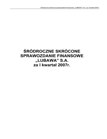 Śródroczne skrócone sprawozdanie finansowe „LUBAWA” S.A. za I kwartał 2007r. ŚRÓDROCZNE SKRÓCONE SPRAWOZDANIE FINANSOWE „LUBAWA” S.A. za I kwartał 2007r. Śródroczne skrócone sprawozdanie finansowe „LUBAWA” S.A. za I kwartał 2007r. Spis treści Str. 1. Skrócony bilans sporządzony na 31.03.2007r. w tys. PLN ....................................................... 4 2. Skrócony rachunek zysków i strat za okres od 01.01.2007r. do 31.03.2007r. w tys. PLN........ 5 3. Skrócony rachunek przepływów pieniężnych za okres od 01.01.2007r. do 31.03.2007r. w tys. PLN ……………………………………………………………………………………………………………5 4. Skrócone zestawienie zmian w kapitale własnym za okres od 01.01.2007r. do 31.03.2007r. w tys. PLN............................................................................................................................................. 7 5. Noty objaśniające do skróconego bilansu sporządzonego na 31.03.2007r. w tys. PLN ........... 8 6. Noty objaśniające do skróconego rachunku zysków i strat za okres od 01.01.2007r. do 31.03.2007r. w tys. PLN .................................................................................................................. 12 7. Informacje ogólne..................................................................................................................... 15 7.1 Format sprawozdania finansowego .....................................................................................................16 7.2 Okresy, za które prezentowane jest sprawozdanie finansowe oraz porównywalne dane finansowe16 8. Zasady rachunkowości............................................................................................................. 16 9. Transakcje z podmiotami powiązanymi ................................................................................... 20 10. Informacje o emisji, wykupie i spłacie dłużnych i kapitałowych papierów wartościowych.... 20 11. Informacje o rodzaju oraz kwotach zmian wartości szacunkowych kwot, które były podawane w poprzednich okresach śródrocznych bieżącego roku obrotowego ............................ 20 12. Informacje o wypłaconej ( lub zadeklarowanej) dywidendzie............................................... 20 13. Istotne zdarzenia następujące po zakończeniu okresu śródrocznego, które nie zostały odzwierciedlone w sprawozdaniu finansowym za dany okres śródroczny...................................... 20 14. Opis skutków zmian w strukturze jednostki gospodarczej w ciągu okresu śródrocznego, łącznie z połączeniem, przejęciem lub sprzedażą jednostek zależnych i inwestycji długoterminowych, restrukturyzacją i zaniechaniem działalności ................................................... 20 15. Segmenty działalności – podział branżowy w tys. PLN....................................................... 20 16. Informacja o zobowiązaniach warunkowych lub aktywach warunkowych, które nastąpiły od czasu zakończenia ostatniego roku obrotowego............................................................................. 22 17. Wybrane dane ze skróconego sprawozdania finansowego w tys. PLN i w przeliczeniu na EURO ………………………………………………………………………………………………………..22 18. Stanowisko zarządu odnośnie do możliwości zrealizowania wcześniej publikowanych prognoz wyników za dany rok, w świetle wyników zaprezentowanych w raporcie kwartalnym w stosunku do wyników prognozowanych .......................................................................................... 23 19. Wskazanie akcjonariuszy posiadających bezpośrednio lub pośrednio przez podmioty zależne co najmniej 5% ogólnej liczby głosów na walnym zgromadzeniu emitenta na dzień przekazania raportu kwartalnego wraz ze wskazaniem liczby posiadanych przez te podmioty akcji, ich procentowego udziału w kapitale zakładowym, liczby głosów z nich wynikających i ich 1 Śródroczne skrócone sprawozdanie finansowe „LUBAWA” S.A. za I kwartał 2007r. procentowego udziału w ogólnej liczbie głosów na walnym zgromadzeniu oraz wskazanie zmian w strukturze własności znacznych pakietów akcji emitenta w okresie od przekazania poprzedniego raportu kwartalnego,........................................................................................................................ 23 20. Zestawienie stanu posiadania akcji emitenta lub uprawnień do nich (opcji) przez osoby zarządzające i nadzorujące emitenta na dzień przekazania raportu kwartalnego, wraz ze wskazaniem zmian w stanie posiadania, w okresie od przekazania poprzedniego raportu kwartalnego, odrębnie dla każdej z osób ........................................................................................ 24 21. Wskazanie postępowań toczących się przed sądem, organem arbitrażowym, lub organem administracji publicznej, ( w tym pojedynczo – stanowiącego co najmniej 10 % kapitałów własnych emitenta, albo dwu lub więcej postępowań- których łączna wartość stanowi co najmniej 10 % kapitałów własnych emitenta).......................................................................................................... 24 22. Informacja o zawarciu przez emitenta lub jednostkę od niego zależną jednej lub wielu transakcji z podmiotami powiązanymi, jeżeli wartość tych transakcji (łączna wartość wszystkich transakcji zawartych od początku roku obrotowego) przekracza wyrażoną w złotych równowartość kwoty 500 000 EURO...................................................................................................................... 25 23. Informacja o udzieleniu przez emitenta lub jednostkę od niego zależną poręczeń kredytu lub pożyczki lub udzieleniu gwarancji – łącznie jednemu podmiotowi lub jednostce zależnej od tego podmiotu, jeżeli 