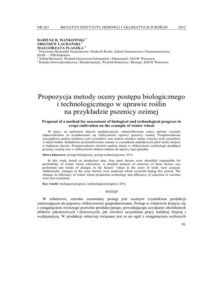 NR 263 BIULETYN INSTYTUTU HODOWLI I AKLIMATYZACJI ROŚLIN 2012 DARIUSZ R. MAŃKOWSKI 1 ZBIGNIEW LAUDAŃSKI 2 MAŁGORZATA FLASZKA 3 1 Pracownia Ekonomiki Nasiennictwa i Hodowli Roślin, Zakład Nasiennictwa i Nasionoznawstwa IHAR — PIB Radzików 2 Zakład Biometrii, Wydział Zastosowań Informatyki i Matematyki, SGGW Warszawa 3 Katedra Doświadczalnictwa i Bioinformatyki, Wydział Rolnictwa i Biologii, SGGW Warszawa Propozycja metody oceny postępu biologicznego i technologicznego w uprawie roślin na przykładzie pszenicy ozimej Proposal of a method for assessment of biological and technological progress in crops cultivation on the example of winter wheat W pracy, na podstawie danych produkcyjnych, zidentyfikowane cztery główne czynniki odpowiedzialne za kształtowanie się efektywności uprawy pszenicy ozimej. Przeprowadzono szczegółową analizę struktury tych czynników oraz analizę trendów zmian wartości tych czynników w latach badań. Dodatkowo przeanalizowano zmiany w czynnikach nakładowych jakie miały miejsce w badanym okresie. Przeprowadzono również analizę zmian w efektywności technologii produkcji pszenicy ozimej oraz w efektywności doboru odmian do uprawy tego gatunku. Słowa kluczowe: postęp biologiczny, postęp technologiczny, EFA In this work, based on production data, four main factors were identified responsible for profitability of winter wheat cultivation. A detailed analysis of structure of these factors was performed and trends of changes in the factors’ values in the years of study were assayed. Additionally, changes in the costs factors were analyzed which occurred during this period. The changes in efficiency of winter wheat production technology and efficiency of selection of varieties were also examined. Key words: biological progress, technological progress, EFA WSTĘP W rolnictwie, szeroko rozumiany postęp jest ważnym czynnikiem produkcji zmierzającym do poprawy efektywności gospodarowania. Postęp w rolnictwie kojarzy się z osiągnięciem wyższego poziomu produkcyjnego, powodującego uzyskanie określonych efektów jakościowych i ilościowych, jak również uczynienia pracy ludzkiej lżejszą i wydajniejszą. W produkcji rolniczej związane jest to na ogół z osiągnięciem szybszych 91 Dariusz R. Mańkowski ... przyrostów plonów roślin uprawnych w stosunku do tempa wzrostu nakładów. W rolnictwie mamy do czynienia z różnymi rodzajami postępu, które współdziałają ze sobą i wpływają na efektywność pracy rolnika. Można tu wymienić (Runowski, 1997; Mańkowski, 2009): — postęp biologiczny — całokształt zmian samoczynnych (naturalnych), bądź wynikających z celowej działalności człowieka (antropogeniczny), w organizmach roślinnych i zwierzęcych, wpływający na cechy indywidualne tych organizmów. W sensie rolniczym jest to całokształt zmian wpływających na wartość technologiczno-użytkową roślin i zwierząt gospodarskich; — postęp hodowlany w roślinach rolniczych — wszystkie nowe cechy użytkowe, bądź polepszenie cech posiadanych przez roślinę, wnoszone przez nowo wyhodowane rody i odmiany zgłoszone do doświadczeń przedrejestrowych; — postęp odmianowy w roślinach rolniczych —wszystkie nowe cechy użytkowe, bądź polepszenie cech posiadanych przez roślinę, wnoszone przez nowo zarejestrowane odmiany; — postęp techniczny — proces doskonalenia techniki wytwarzania, polegający na wprowadzaniu do produkcji rolniczej ulepszonych i doskonalszych środków technicznych; — postęp technologiczny — wprowadzanie nowych technologii produkcji; — postęp organizacyjny — proces zmian w organizacji gospodarstwa i organizacji pracy prowadzących do bardziej efektywnego wykorzystania postępu technicznego, technologicznego i biologicznego oraz do poprawy ekonomicznych wyników gospodarstwa; — postęp społeczno-ekonomiczny — zmiany w zakresie stosunków społecznych i ustroju rolnego. W literaturze dotyczącej postępu biologicznego można spotkać szereg różnych podejść do problemu jego ilościowej estymacji. Stosowane metody oceny są bardzo różne i zależą w głównej mierze od rodzaju i pochodzenia analizowanych danych. Oceny postępu hodowlanego i odmianowego dokonuje się często na podstawie ścisłych doświadczeń odmianowych i stosuje się analizę funkcji regresji liniowej ( ܽ = ݕ+ ܾ ∙ )ݔplonów względem lat rejestracji badanych odmian (Kamasa, 1983; Calderini i in., 1995; Schuster i in., 1977, 1982; Fisher i in., 1998; Sayre i in., 1998; Slafer i Peltonen-Sainio, 2001; Ustun i in., 2001; Trethowan i in., 2002). W przypadku ścisłych doświadczeń rzadziej od wymienionych wcześniej modeli regresyjnych stosuje się funkcję regresji wielomianowej drugiego stopnia ( ܽ = ݕ+ ܾ ∙ ݔ+ ܿ ∙ ݔଶ) (Hesselbach, 1985; Ustun i in., 2001). W literaturze można również odnaleźć prace, w których autorzy wykorzystali analizę regresji wielokrotnej połączoną z analizą wariancji do oceny potencjału plonotwórczego odmian, rodów i linii hodowlanych, a co za tym idzie do oceny postępu genetycznego w roślinach uprawnych (Teklu i Tefera, 2005). Różnice w obserwowanych wartościach cech ilościowych wynikające z występowania interakcji genotypowo-środowiskowych oraz z różnych warunków przeprowadzania doświadczeń mogą utrudniać i zaciemniać obraz wykonanych analiz. Dlatego też, zależnie od ilości dostępnych danych i od okresu jaki obejmuje analiza, często 92 Dariusz R. Mańkowski ... wykorzystuje się metody oparte na porównaniach efektów poszczególnych odmian z wzorcem stałym, wzorcem zbiorowym, bądź wzorcem pomostowym (Oleksiak i in., 2004; Mańkowski, 2009). Zastosowanie jednego z wyżej wymienionych wzorców pozwala wyeliminować lub zminimalizować zmienność, wynikającą ze zróżnicowanych warunków środowiskowych pomiędzy latami (Silvey, 1978 a, 1978 b, 1981, 1986; Bilski i in., 1979; Krzymuski i Kaczyński, 1980; K