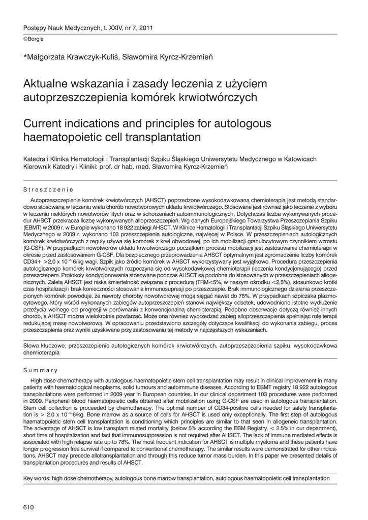 Postępy Nauk Medycznych, t. XXIV, nr 7, 2011 ©Borgis *Małgorzata Krawczyk-Kuliś, Sławomira Kyrcz-Krzemień Aktualne wskazania i zasady leczenia z użyciem autoprzeszczepienia komórek krwiotwórczych Current indications and principles for autologous haematopoietic cell transplantation Katedra i Klinika Hematologii i Transplantacji Szpiku Śląskiego Uniwersytetu Medycznego w Katowicach Kierownik Katedry i Kliniki: prof. dr hab. med. Sławomira Kyrcz-Krzemień Streszczenie Autoprzeszczepienie komórek krwiotwórczych (AHSCT) poprzedzone wysokodawkowaną chemioterapią jest metodą standardowo stosowaną w leczeniu wielu chorób nowotworowych układu krwiotwórczego. Stosowane jest również jako leczenie z wyboru w leczeniu niektórych nowotworów litych oraz w schorzeniach autoimmunologicznych. Dotychczas liczba wykonywanych procedur AHSCT przekracza liczbę wykonywanych alloprzeszczepień. Wg danych Europejskiego Towarzystwa Przeszczepiania Szpiku (EBMT) w 2009 r. w Europie wykonano 18 922 zabiegi AHSCT. W Klinice Hematologii i Transplantacji Szpiku Śląskiego Uniwersytetu Medycznego w 2009 r. wykonano 103 przeszczepienia autologiczne, najwięcej w Polsce. W przeszczepieniach autologicznych komórek krwiotwórczych z reguły używa się komórek z krwi obwodowej, po ich mobilizacji granulocytowym czynnikiem wzrostu (G-CSF). W przypadkach nowotworów układu krwiotwórczego początkiem procesu mobilizacji jest zastosowanie chemioterapii w okresie przed zastosowaniem G-CSF. Dla bezpiecznego przeprowadzenia AHSCT optymalnym jest zgromadzenie liczby komórek CD34+ >2,0 x 10^6/kg wagi. Szpik jako źródło komórek w AHSCT wykorzystywany jest wyjątkowo. Procedura przeszczepienia autologicznego komórek krwiotwórczych rozpoczyna się od wysokodawkowej chemioterapii (leczenia kondycjonującego) przed przeszczepem. Protokoły kondycjonowania stosowane podczas AHSCT są podobne do stosowanych w przeszczepieniach allogenicznych. Zaletą AHSCT jest niska śmiertelność związana z procedurą (TRM<5%, w naszym ośrodku <2,5%), stosunkowo krótki czas hospitalizacji i brak konieczności stosowania immunosupresji po przeszczepie. Brak immunologicznego działania przeszczepionych komórek powoduje, że nawroty choroby nowotworowej mogą sięgać nawet do 78%. W przypadkach szpiczaka plazmocytowego, który wśród wykonanych zabiegów autoprzeszczepień stanowi największy odsetek, udowodniono istotne wydłużenie przeżycia wolnego od progresji w porównaniu z konwencjonalną chemioterapią. Podobne obserwacje dotyczą również innych chorób, a AHSCT można wielokrotnie powtarzać. Może ona również wyprzedzać zabieg alloprzeszczepienia spełniając rolę terapii redukującej masę nowotworową. W opracowaniu przedstawiono szczegóły dotyczące kwalifikacji do wykonania zabiegu, proces przeszczepienia oraz wyniki uzyskiwane przy zastosowaniu tej metody w najczęstszych wskazaniach. Słowa kluczowe: przeszczepienie autologicznych komórek krwiotwórczych, autoprzeszczepienia szpiku, wysokodawkowa chemioterapia Summary High dose chemotherapy with autologous haematopoietic stem cell transplantation may result in clinical improvement in many patients with haematological neoplasms, solid tumours and autoimmune diseases. According to EBMT registry 18 922 autologous transplantations were performed in 2009 year in European countries. In our clinical department 103 procedures were performed in 2009. Peripheral blood haematopoietic cells obtained after mobilization using G-CSF are used in autologous transplantation. Stem cell collection is proceeded by chemotherapy. The optimal number of CD34-positive cells needed for safety transplantation is > 2.0 x 10^6/kg. Bone marrow as a source of cells for AHSCT is used only exceptionally. The first step of autologous haematopoietic stem cell transplantation is conditioning which principles are similar to that seen in allogeneic transplantation. The advantage of AHSCT is low transplant related mortality (below 5% according the EBM Registry, < 2.5% in our department), short time of hospitalization and fact that immunosuppression is not required after AHSCT. The lack of immune mediated effects is associated with high relapse rate up to 78%. The most frequent indication for AHSCT is multiple myeloma and these patients have longer progression free survival if compared to conventional chemotherapy. The similar results were demonstrated for other indications. AHSCT may precede allotransplantation and through this reduce tumor mass burden. In this paper we presented details of transplantation procedures and results of AHSCT. Key words: high dose chemotherapy, autologous bone marrow transplantation, autologous haematopoietic cell transplantation 610 Aktualne wskazania i zasady leczenia z użyciem autoprzeszczepienia komórek krwiotwórczych Wysokodawkowa chemioterapia wspomagana przeszczepieniem autologicznych komórek krwiotwórczych (AHSCT) jest uznaną metodą stosowaną w leczeniu nowotworów układu krwiotwórczego (1). Stosowana jest również w niektórych przypadkach chorób autoimmunologicznych, a także w leczeniu nowotworów litych. Przeszczepienia autologiczne odbywają się w ośrodkach hematoonkologicznych, które muszą spełniać odpowiednie warunki i posiadać odpowiednie akredytacje. W Polsce akredytacje takie wydaje Ministerstwo Zdrowia. W Europie 624 ośrodki przeszczepienia szpiku zgłaszają wszystkie wykonane procedury do EBMT. Wskazania do leczenia z użyciem tej procedury są określane w podobny sposób jak wskazania do przeszczepień allogenicznych. Definicje kryteriów wskazań obejmują kryteria określone jako: standardowe postępowanie, kliniczna opcja, wskazanie o charakterze rozwojowym i kategoria nazwana – na ogół niezalecane (2). Przeszczepienia autologicznych komórek krwiotwórczych wykonywane są standardowo od lat 70. ubiegłego wieku. Ogólna liczba wykonywanych co roku zabiegów AHSCT przekracza liczę przeszczepień al