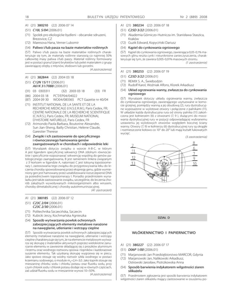 18 BIULETYN URZĘDU PATENTOWEGO Nr 2 (889) 2008 A1 (21) 380210 (22) 2006 07 14 (51) C10L 5/04 (2006.01) (71) Spolek pro ekologicke bydleni - obcanske sdruzeni, Brezovice, CZ (72) Maresova Hana, Verner Lubomir (54) Paliwo i/lub pasza na bazie materiałów roślinnych (57) Paliwo i/lub pasza na bazie materiałów roślinnych charak- A1 (21) 380234 (22) 2006 07 18 (51) C25D 3/22 (2006.01) (71) Akademia Górniczo-Hutnicza im. Stanisława Staszica, Kraków (72) Guzik Edward, Kopyciński Dariusz (54) Kąpiel do cynkowania ogniowego (57) Kąpiel do cynkowania ogniowego, zawierająca 0,05-0,1% ma- teryzuje się tym, że materiały roślinne stanowią co najmniej 50% całkowitej masy paliwa i/lub paszy. Materiał roślinny formowany jest w postaci granul (ziarn) brykietów lub pelet materiałem z grupy zawierającej otręby z młynów, słodowni lub gorzelni. (4 zastrzeżenia) sowych glinu reszta cynk i nieuniknione zanieczyszczenia, charakteryzuje się tym, że zawiera 0,005-0,01% masowych strontu. (1 zastrzeżenie) A1 (21) 382844 (22) 2004 03 18 (51) C12N 15/11 (2006.01) A61K 31/7088 (2006.01) (31) 03 0303311 (32) 2003 03 18 (33) FR (86) 2004 03 18 PCT/EP04/04022 (87) 2004 09 30 WO04/083365 PCT Gazette nr 40/04 (71) INSTITUT NATIONAL DE LA SANTE ET DE LA RECHERCHE MEDICALE (I.N.S.E.R.M.), Paris Cedex, FR; CENTRE NATIONALE DE LA RECHERCHE SCIENTIFIQUE (C.N.R.S.), Paris Cedex, FR; MUSEUM NATIONAL D’HISTOIRE NATURELLE, Paris Cedex, FR (72) Arimondo Paola Barbara, Boutorine Alexandre, Sun Jian-Sheng, Bailly Christian, Helene Claude, Garestier Therese (54) Związki i ich zastosowanie do specyficznego i równoczesnego hamowania genów zaangażowanych w chorobach i odpowiednie leki (57) Wynalazek dotyczy związku o wzorze A-B-C, w którym A1 (21) 380253 (22) 2006 07 19 (51) C25D 3/22 (2006.01) (71) REMIX S. A., Świebodzin (72) Rudolf Karol, Woźniak Alfons, Klorek Arkadiusz (54) Układ ogrzewania wanny, zwłaszcza do cynkowania ogniowego (57) Wynalazek dotyczy układu ogrzewania wanny, zwłaszcza do cynkowania ogniowego, zawierającego usytuowane w komorze grzejnej, pomiędzy wanną a jej obudową (2), rury dystrybucyjne wyposażone w wylotowe otwory i połączone z palnikami (11). W układzie każda dystrybucyjna rura od strony palnika (11) zakończona jest kołnierzem (6) z otworami (7, 9 ), służącymi do mocowania dystrybucyjnej rury w pozycji odpowiadającej wybranemu ustawieniu jej wylotowych otworów względem bocznej ściany wanny. Otwory (7, 9) w kołnierzu (6) dystrybucyjnej rury są okrągłe i rozmieszczone kołowo co 10° do 20° lub mają kształt łukowatych wycięć. (3 zastrzeżenia) A jest ligandem specyficznej sekwencji DNA zdolnym równocześnie i specyficznie rozpoznawać sekwencję wspólną do genów patologicznego zaangażowania, B jest ramieniem linkera związanym z 3’-końcem w ligandzie A, natomiast C jest toksyną topoizoomerazy I, zastosowania tego związku do przygotowywania leku do leczenia choroby spowodowanej przez ekspresję genu, gdzie wymieniony gen jest hamowany przez ustabilizowane rozszczepienie DNA za pośrednictwem topoizomerazy I. Ponadto przedmiotem wynalazku jest także zastosowanie związku, szczególnie, do leczenia chorób zakaźnych wywoływanych mikroorganizmem albo wirusem, choroby dimetabolicznej i choroby autoimmuninzacyjnej. (41 zastrzeżeń) A1 (21) 380185 (22) 2006 07 12 (51) C23C 2/04 (2006.01) C23C 2/30 (2006.01) (71) Politechnika Szczecińska, Szczecin (72) Kubicki Jerzy, Kochmańska Agnieszka (54) Sposób wytwarzania powłok ochronnych zabezpieczających elementy metalowe narażone na nawęglanie, utlenianie i wstrząsy cieplne (57) Sposób wytwarzania powłok ochronnych zabezpieczających elementy metalowe narażone na nawęglanie, utlenianie i wstrząsy cieplne charakteryzuje się tym, że na elemencie metalowym wytwarza się skorupę z materiałów aktywnych poprzez wielokrotne zanurzanie elementu w zawiesinie składającej się z proszków aluminium i krzemu oraz wodnego roztworu spoiwa i topników i każdorazowe suszenie elementu. Tak uzyskaną skorupę wygrzewa się w piecu. Jako spoiwo stosuje się wodny roztwór szkła wodnego w postaci krzemianu sodowego, o module mk=2,4÷3,0. Jako topnik stosuje się mieszaninę chlorku sodu i chlorku potasu oraz fluorku sodu, przy czym chlorek sodu i chlorek potasu dodaje się w równych częściach, zaś udział fluorku sodu w mieszaninie wynosi 10÷50%. (4 zastrzeżenia) DZIAŁ D WŁÓKIENNICTWO I PAPIERNICTWO A1 (21) 380227 (22) 2006 07 17 (51) D06P 1/00 (2006.01) (71) Marjanowski Jan Przedsiębiorstwo MARCOR, Gdynia (72) Marjanowski Jan, Nalikowski Arkadiusz, Ostrowski Jarosław, Piotrzkowska Anna (54) Sposób barwienia indykatorem wilgotności ziaren silikażelu (57) Przedmiotem zgłoszenia jest sposób barwienia indykatorem wilgotności ziaren silikażelu mający zastosowanie w osuszeniu po-