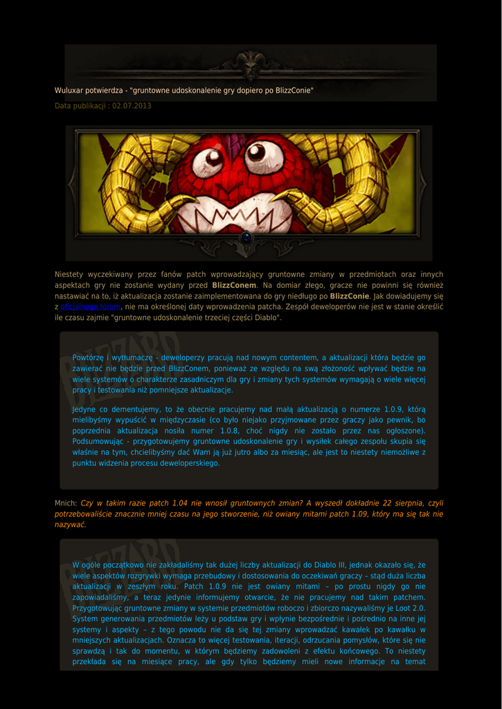 Wuluxar potwierdza - "gruntowne udoskonalenie gry dopiero po BlizzConie" Data publikacji : 02.07.2013 Niestety wyczekiwany przez fanów patch wprowadzający gruntowne zmiany w przedmiotach oraz innych aspektach gry nie zostanie wydany przed BlizzConem. Na domiar złego, gracze nie powinni się również nastawiać na to, iż aktualizacja zostanie zaimplementowana do gry niedługo po BlizzConie. Jak dowiadujemy się z oficjalnego forum, nie ma określonej daty wprowadzenia patcha. Zespół deweloperów nie jest w stanie określić ile czasu zajmie "gruntowne udoskonalenie trzeciej części Diablo". Powtórzę i wytłumaczę - deweloperzy pracują nad nowym contentem, a aktualizacji która będzie go zawierać nie będzie przed BlizzConem, ponieważ ze względu na swą złożoność wpływać będzie na wiele systemów o charakterze zasadniczym dla gry i zmiany tych systemów wymagają o wiele więcej pracy i testowania niż pomniejsze aktualizacje. Jedyne co dementujemy, to że obecnie pracujemy nad małą aktualizacją o numerze 1.0.9, którą mielibyśmy wypuścić w międzyczasie (co było niejako przyjmowane przez graczy jako pewnik, bo poprzednia aktualizacja nosiła numer 1.0.8, choć nigdy nie zostało przez nas ogłoszone). Podsumowując - przygotowujemy gruntowne udoskonalenie gry i wysiłek całego zespołu skupia się właśnie na tym, chcielibyśmy dać Wam ją już jutro albo za miesiąc, ale jest to niestety niemożliwe z punktu widzenia procesu deweloperskiego. Mnich: Czy w takim razie patch 1.04 nie wnosił gruntownych zmian? A wyszedł dokładnie 22 sierpnia, czyli potrzebowaliście znacznie mniej czasu na jego stworzenie, niż owiany mitami patch 1.09, który ma się tak nie nazywać. W ogóle początkowo nie zakładaliśmy tak dużej liczby aktualizacji do Diablo III, jednak okazało się, że wiele aspektów rozgrywki wymaga przebudowy i dostosowania do oczekiwań graczy – stąd duża liczba aktualizacji w zeszłym roku. Patch 1.0.9 nie jest owiany mitami – po prostu nigdy go nie zapowiadaliśmy, a teraz jedynie informujemy otwarcie, że nie pracujemy nad takim patchem. Przygotowując gruntowne zmiany w systemie przedmiotów roboczo i zbiorczo nazywaliśmy je Loot 2.0. System generowania przedmiotów leży u podstaw gry i wpłynie bezpośrednie i pośrednio na inne jej systemy i aspekty – z tego powodu nie da się tej zmiany wprowadzać kawałek po kawałku w mniejszych aktualizacjach. Oznacza to więcej testowania, iteracji, odrzucania pomysłów, które się nie sprawdzą i tak do momentu, w którym będziemy zadowoleni z efektu końcowego. To niestety przekłada się na miesiące pracy, ale gdy tylko będziemy mieli nowe informacje na temat przygotowywanych zmian, od razu je Wam udostępnimy. Mnich: Gdyby wyszedł tak jak 1.04 w sierpniu, nikt na konsoli nie kupiłby gry, bo już na starcie musieliby czekać na nowy content, którym by się cieszyli PC-towi gracze. Gdyby nie wersja konsolowa, gra wyglądałaby pewnie zupełnie inaczej. Tutaj muszę powiedzieć, że akurat niektóre pomysły, które zostały przedstawione wcześniej na naszym blogu już są wdrożone w wersji konsolowej, gdyż fakt, że gra w wersji na konsole jeszcze nie jest wydana znacznie ułatwia przeprowadzanie tak dogłębnych zmian. Jest to przykład tego, jak zespół konsolowy został zainspirowany przez zespół pracujący nad rozwojem wersji PC gry. ZAKA: A czemu nie wydadzą przed Blizzconem, bo chcą się przedstawić całemu światu i na pewno dużo osób wróci do gry lub kupi D3 jeśli zainteresuje się przedstawionym systemem, to po prostu marketing, a nie jakieś wrogie działanie. Uściślę w tym miejscu - zmiany systemu przedmiotów nie trafią do gry przed BlizzConem, ale nie oznacza to, że trafią do gry od razu po nim. BlizzCon to po prostu punkt na naszej tegorocznej linii czasu do którego deweloperzy odnieśli się w wywiadzie. Autor: BeLial Data publikacji : 02.07.2013 Data modyfikacji : 02.07.2013 Liczba wyświetleń tekstu: 4792 Tagi: aktualizacja, patch, zmiany POWRÓT DRUKUJ PDF POLEĆ ZNAJOMEMU Komentarz (28) dodaj komentarz Hahahahaha no to tego ich lootu 2.0 można się spodziewać na dwu lecie Diabełka :]~Dropson71 2013/07/02 21:28 Z lootem nie ma problemu w tejże grze . Problem bardziej leży u podstaw tej gry i tym jakże skromnym battle-net 2.0.~micio500 2013/07/02 21:34 Niech jeszcze bardziej znerfią inferno, aby mogła je przejść ślepa babcia, niech 50% lootu stanowią high-endowe legendy. Wtedy dopiero będzie crap nad crapami.~Vendeur 2013/07/02 21:36 Taa, problemem nie tylko są przedmioty, ale nudna farma. Latanie po tych samych terenach, które pozbawione są losowości każdemu może wyjść w końcu bokiem. Ale nie ukrywam, ciekaw jestem co tam szykują. :)~BeLial Battlenet Network 2013/07/02 21:39 Moim zdaniem wprowadzenie jakiegos tam lootu 2.0 mija sie z celem jesli nie zresetuja kont wszystkich graczy ...~Sumok 2013/07/02 21:57 Przecież to jest jakaś wielka kpina. Po bli$$conie i jeszcze nie wiadomo kiedy czyli min. 1,5 roku od premiery wprowadzają coś co ma naprawić tyle niedociagnięć. Jawne śmieją się nam w pysk , ja się pytam gdzie są do k..rwy nędzy ARENY !!! - element który miał być w dniu premiery a nie wiadomo czy będzie 1,5 roku po premierze, 1,5 roku !! Do tej pory czytalem sobie newsy i komentarze ze spokojem ale jak przeczytalem dzisiejszy news to na serio nie da się przejść obojętnie obok tego. I niech nikt mi tu nie pisze że nikt mi nie kazał kupować tej gry itp bo mam prawo jak każdy inny być wkrwiony potraktowaniem mnie jak jakiegoś idiotę. Szmaciarze a nie profesjonalna firma... pozdro~waceq 2013/07/02 22:09 ~BeLial Dokładnie. Moim zdaniem loot jest w miarę, da się przeżyć. Ale nuda po prostu wychodzi bokami. Nawet mi się odechciało grać, znam już wszystkie lokacje na pamięć. Nic nowego, nawet prostych eventów. Zaś tych debilnych osiągnięć dla przedszkolaków nie mam zamiaru z
