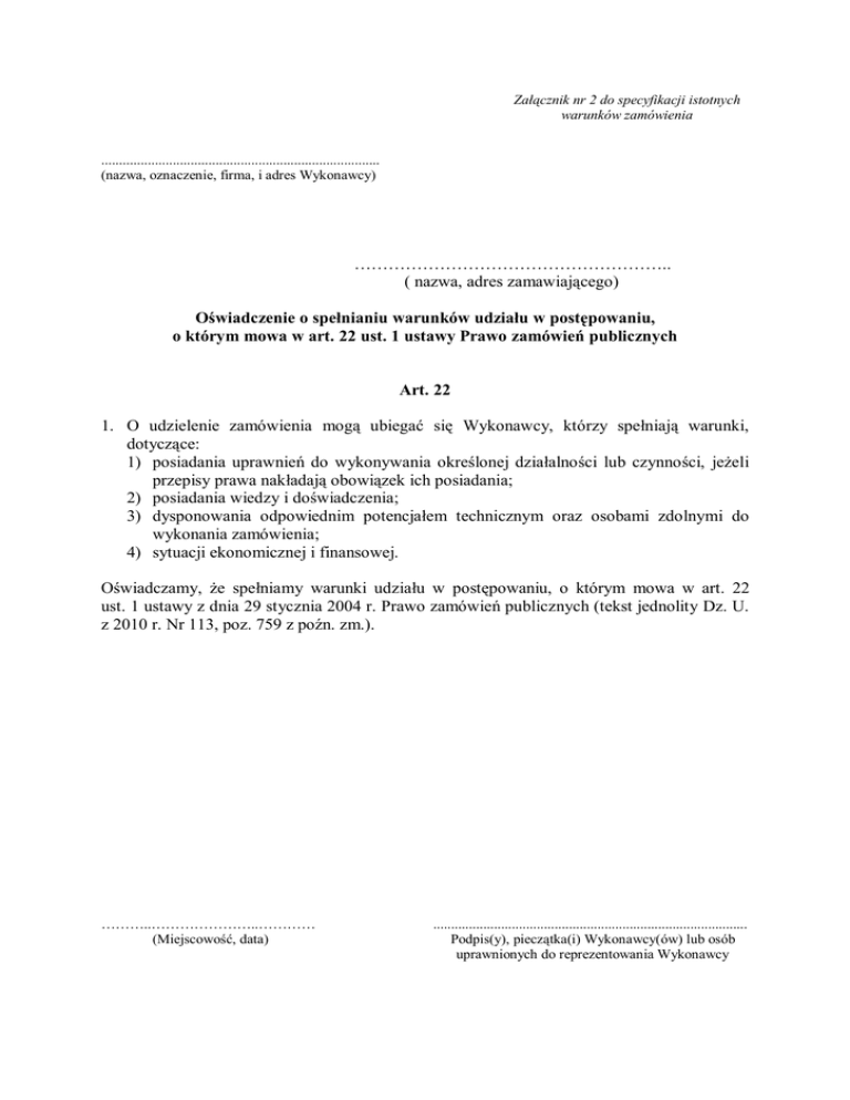 Załącznik nr 2 do specyfikacji istotnych warunków zamówienia .............................................................................. (nazwa, oznaczenie, firma, i adres Wykonawcy) ……………………………………………….. ( nazwa, adres zamawiającego) Oświadczenie o spełnianiu warunków udziału w postępowaniu, o którym mowa w art. 22 ust. 1 ustawy Prawo zamówień publicznych Art. 22 1. O udzielenie zamówienia mogą ubiegać się Wykonawcy, którzy spełniają warunki, dotyczące: 1) posiadania uprawnień do wykonywania określonej działalności lub czynności, jeżeli przepisy prawa nakładają obowiązek ich posiadania; 2) posiadania wiedzy i doświadczenia; 3) dysponowania odpowiednim potencjałem technicznym oraz osobami zdolnymi do wykonania zamówienia; 4) sytuacji ekonomicznej i finansowej. Oświadczamy, że spełniamy warunki udziału w postępowaniu, o którym mowa w art. 22 ust. 1 ustawy z dnia 29 stycznia 2004 r. Prawo zamówień publicznych (tekst jednolity Dz. U. z 2010 r. Nr 113, poz. 759 z poźn. zm.). ………..…………………..………… (Miejscowość, data) ........................................................................................ Podpis(y), pieczątka(i) Wykonawcy(ów) lub osób uprawnionych do reprezentowania Wykonawcy Załącznik nr 3 do specyfikacji istotnych warunków zamówienia ............................................................................ (nazwa, oznaczenie, firma i adres Wykonawcy) ..................................................... ( nazwa, adres zamawiającego ) Oświadczenie o braku podstaw do wykluczenia, o którym mowa w art. 24 ust. 1 ustawy Prawo zamówień publicznych Art. 24 1. Z postępowania o udzielenie zamówienia wyklucza się: 1) Wykonawców, którzy wyrządzili szkodę, nie wykonując zamówienia lub wykonując je nienależycie, jeżeli szkoda ta została stwierdzona orzeczeniem sądu, które uprawomocniło się w okresie 3 lat przed wszczęciem postępowania; 2) Wykonawców, w stosunku do których otwarto likwidację lub których upadłość ogłoszono, z wyjątkiem Wykonawców, którzy po ogłoszeniu upadłości zawarli układ zatwierdzony prawomocnym postanowieniem sądu, jeżeli układ nie przewiduje zaspokojenia wierzycieli przez likwidację majątku upadłego; 3) Wykonawców, którzy zalegają z uiszczeniem podatków, opłat lub składek na ubezpieczenia społeczne lub zdrowotne, z wyjątkiem przypadków gdy uzyskali oni przewidziane prawem zwolnienie, odroczenie, rozłożenie na raty zaległych płatności lub wstrzymanie w całości wykonania decyzji właściwego organu; 4) osoby fizyczne, które prawomocnie skazano za przestępstwo popełnione w związku z postępowaniem o udzielenie zamówienia, przestępstwo przeciwko prawom osób wykonujących pracę zarobkową, przestępstwo przeciwko środowisku, przestępstwo przekupstwa, przestępstwo przeciwko obrotowi gospodarczemu lub inne przestępstwo popełnione w celu osiągnięcia korzyści majątkowych, a także za przestępstwo skarbowe lub przestępstwo udziału w zorganizowanej grupie albo związku mających na celu popełnienie przestępstwa lub przestępstwa skarbowego; 5) spółki jawne, których wspólnika prawomocnie skazano za przestępstwo popełnione w związku z postępowaniem o udzielenie zamówienia, przestępstwo przeciwko prawom osób wykonujących pracę zarobkową, przestępstwo przeciwko środowisku, przestępstwo przekupstwa, przestępstwo przeciwko obrotowi gospodarczemu lub inne przestępstwo popełnione w celu osiągnięcia korzyści majątkowych, a także za przestępstwo skarbowe lub przestępstwo udziału w zorganizowanej grupie albo związku mających na celu popełnienie przestępstwa lub przestępstwa skarbowego; 6) spółki partnerskie, których partnera lub członka zarządu prawomocnie skazano za przestępstwo popełnione w związku z postępowaniem o udzielenie zamówienia, przestępstwo przeciwko prawom osób wykonujących pracę zarobkową, przestępstwo przeciwko środowisku, przestępstwo przekupstwa, przestępstwo przeciwko obrotowi gospodarczemu lub inne przestępstwo popełnione w celu osiągnięcia korzyści majątkowych, a także za przestępstwo skarbowe lub przestępstwo udziału w zorganizowanej grupie albo związku mających na celu popełnienie przestępstwa lub przestępstwa skarbowego; 7) spółki komandytowe oraz spółki komandytowo-akcyjne, których komplementariusza prawomocnie skazano za przestępstwo popełnione w związku z postępowaniem o udzielenie zamówienia, przestępstwo przeciwko prawom osób wykonujących pracę zarobkową, przestępstwo przeciwko środowisku, przestępstwo przekupstwa, przestępstwo przeciwko obrotowi gospodarczemu lub inne przestępstwo popełnione w celu osiągnięcia korzyści majątkowych, a także za przestępstwo skarbowe lub przestępstwo udziału w zorganizowanej grupie albo związku mających na celu popełnienie przestępstwa lub przestępstwa skarbowego; 8) osoby prawne, których urzędującego członka organu zarządzającego prawomocnie skazano za przestępstwo popełnione w związku z postępowaniem o udzielenie zamówienia, przestępstwo przeciwko prawom osób wykonujących pracę zarobkową, przestępstwo przeciwko środowisku, przestępstwo przekupstwa, przestępstwo przeciwko obrotowi gospodarczemu lub inne przestępstwo popełnione w celu osiągnięcia korzyści majątkowych, a także za przestępstwo skarbowe lub przestępstwo udziału w zorganizowanej grupie albo związku mających na celu popełnienie przestępstwa lub przestępstwa skarbowego; 9) podmioty zbiorowe, wobec których sąd orzekł zakaz ubiegania się o zamówienia, na podstawie przepisów o odpowiedzialności podmiotów zbiorowych za czyny zabronione pod groźbą kary. 2. Z postępowania o udzielenie zamówienia wyklucza się również Wykonawców, którzy: 1) wykonywali bezpośrednio czynności związane z przygotowaniem prowadzonego postępowania 