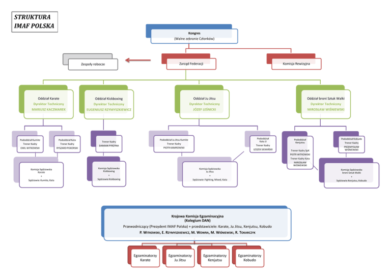 STRUKTURA IMAF POLSKA Kongres (Walne zebranie Członków) Zarząd Federacji Zespoły robocze Komisja Rewizyjna Oddział Karate Oddział Kickboxing Oddział Ju Jitsu Oddział broni Sztuk Walki Dyrektor Techniczny Dyrektor Techniczny Dyrektor Techniczny Dyrektor Techniczny MARIUSZ KACZMAREK EUGENIUSZ RZYMYSZKIEWICZ JÓZEF LEŚNICKI MIROSŁAW WIŚNIEWSKI Pododdział Kumite Pododdział Kata Trener Kadry Trener Kadry EMIL WITKOWSKI RYSZARD PISKORSKI Pododdział Kata JJ Pododdział Ju Jitsu Kumite Trener Kadry Trener Kadry DAMIAN PYRZYNA Pododdział Kenjutsu Trener Kadry PIOTR KAMROWSKI LESZEK SIEKAŃSKI Trener Kadry SpK Pododdział Kobudo Trener Kadry PRZEMYSŁAW WIŚNIEWSKI PIOTR WITKOWSKI Trener Kadry Kata MIROSŁAW WIŚNIEWSKI Komisja Sędziowska Karate Komisja Sędziowska Kickboxing Komisja Sędziowska Ju Jitsu Komisja Sędziowska broni Sztuk Walki + + + + Sędziowie: Kumite, Kata Sędziowie Kickboxing Sędziowie: Fighting, Mixed, Kata Sędziowie:Kenjutsu, Kobudo Krajowa Komisja Egzaminacyjna (Kolegium DAN) Przewodniczący (Prezydent IMAF Polska) + przedstawiciele: Karate, Ju Jitsu, Kenjutsu, Kobudo P. WITKOWSKI, E. RZYMYSZKIEWICZ, M. WOWRA, M. WIŚNIEWSKI, R. TOKARCZYK Egzaminatorzy Karate Egzaminatorzy Ju Jitsu Egzaminatorzy Kenjutsu Egzaminatorzy Kobudo
