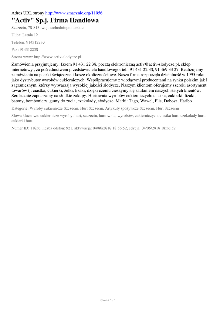 "Activ" Sp.j. Firma Handlowa, Szczecin, Letnia 12