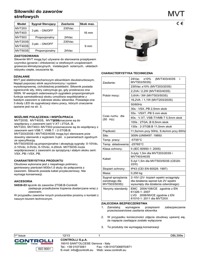 Siłowniki do zaworów strefowych Model MVT203 MVT403 MVT503 MVT203S MVT403S MVT503S Sygnał Sterujący 3 pkt. - ON/OFF Propocjonalny 3 pkt. - ON/OFF Proporcjonalny MVT Zasilanie Skok max. 230Vac 16 mm 24Vac 230Vac 9 mm 24Vac ZASTOSOWANIA Siłowniki MVT mogą być używane do sterowania przepływem czynnika (grzanie i chłodzenie) w strefowych urządzeniach grzewczo-klimatyzacyjnych, instalacjach solarnych, układach odzysku ciepła, osuszania itp. CHARACTERYSTYKA TECHNICZNA DZIAŁANIE MVT jest elektromechaniczym siłownikiem dwukierunkowym. Napęd poporzez silnik asynchroniczny i system wysokosprawnej, cichobieżnej przekładni. Siłownik posiada ogranicznik siły, który zatrzymuje go, gdy przekracza ona 300N. W wersjach osterowanych sygnałem proporcjonalnym funkcja samokalibracji skoku umożliwia współdziałnie z każdym zaworem w zakresie skoku siłownika. Posiadaja one 3 diody LED do sygnalizacji stanu pracy, których znaczenie opsiane jest na str. 3. Zasilanie: 24Vac ±10% MVT503/503S) (MVT403/403S 230Vac ±10% (MVT203/203S) 2,2VA / 2,2W (MVT403/403S) Pobór mocy: 3,6VA / 3W (MVT503/503S) 16,2VA / 1,1W (MVT203/203S) 50/60Hz 30s : VSX..PB 2,5mm skok Czas ruchu dla (50 Hz): MOŻLIWE POŁĄCZENIA I WSPÓŁPRACA MVT203S, MVT403S, MVT503S przeznaczone są do współpracy z zaworami serii V.XT i 2TGA..B. MVT203, MVT403 i MVT503 przeznaczone są do współpracy z zaworami serii VSB.T, VMB.T i 2-3TGB.B. MVT203/203S i MVT403/403S mogą być sterowane prze dowolny sterownik z wyjściem 3-pkt. o parametrach zgodnych ze specyfikacją. MVT503/503S są proporcjonalne i akceptują sygnały: 0-10Vdc, 2-10Vdc, 0-5Vdc, 6-10Vdc, 4-20mA. MVT503S może współpracować z zaworami ze sprzężyną i stałym skoku serii: VSX..PB i VSX..PB. 55s : VSXT..PB 5 mm skok 60s : V.XT, VSB.T/VMB.T 5,5mm skok 100s : 2TGA..B 8,5mm skok 130s : 2-3TGB.B 11,5mm skok Prędkość: 11,5s/mm przy 50Hz, 9,4s/mm przy 60Hz Siła: 300N (UNI9497: 1989)\ Temp. pracy: -5T55°C Temp. składowania: -25T65°C Klasa ochrony: Kabel: CHARAKTERYSTYKA PRODUKTU Obudowa wykonana jest z niepalnego polimeru; gwintowany pierścień M30x1,5 służy do połączenia z zaworem. Siłownik posiada kabel przyłaczeniowy. Nie wymaga konserwacji. AKCESORIA 54538-03 łącznik do zaworów 2TGB.B-Controlli zastepuje przedłużenie trzpienia dostarczane wraz z zaworami. W przypadku zaworów innych producentów prosimy o kontakt z naszym biurem technicznym. II (IEC 60950-1: 2005) 3-żyły 1,5m dla MVT203/203S i MVT403/403S 5-żył 1,5m dla MVT503/503S (CEI2022/II) Stopień ochrony: IP43 (CEI EN 60529: 1997) Masa: 0,250 kg Sygnał sprzężenia zwrotnego dla MVT503/503S): 2-10V (2V- trzpień wpełni wciągnięty dla działania wprost lub 2V wpełni wysunięty dla działania odwrotnego) Norymy standardy EMC 2004/108/CE zgodnie z EN 61326-1: 2007 LVD 2006/95/CE zgodnie z EN 61010-1: 2011 dla MVT2XX ZALECENIA BEZPIECZEŃSTWA 1. Zainstaluj wymagane przepisami przeciwzwarciowe zasilania siłownika 1st Issue 12/13 ISO 9001 i zabezpieczenie 2. W przypadku konieczności zdjęcia obudowy upewnij się, że napięcie zasilające zostało wyłączone 3. Te produkty nie wymagają konserwacji 1 CONTROLLI S.p.A. 16010 SANT’OLCESE Genova - Italy Tel.: +39 01073061 Fax: +39 0107306870/871 E-mail: [email protected] Web: www.controlli.eu DBL399e MONTAŻ I PODŁĄCZENIA • • MVT203S - MVT403S - MVT503S Przed zamontowaniem upewnij się czy trzpień napędu jest na górze. Jeśli nie, pamiętaj, że by zamontować siłownik na zaworze we właściwej pozyji, należy pokonać opór sprężyny zaworu. Pierścień mocujący M30x1,5 należy wpełni dokręcić. Modele MVT203 - MVT403 - MVT503 Montując siłownik na zaworze zakręć pierścień mocujący M3x1,5 (nie do oporu); przy użyciu ręcznego przestawiania siłownika ustaw jego trzpień równo z nakrętką (A), zabezbiecz wkrętem (B) poprzez nienagwintowany otwór w nakrętce (B). Ustaw siłownik we właściwej pozycji i dokręć pierścień M30x1,5. MVTXXXS MVTXXX ON/OFF - Podłączenie elektryczne Zastępowanie starych proporcjonalnych MVT Połącz ze sobą biały i zielony przewód; nastepnie podłącz biały przewód nowego siłownika w miejsce białego przewodu siłownika MVT56/57, nowy niebieski przewód w miejsce starego zielonego oraz nowy czerwony w miejsce starego brązowego. Nie dokonuj przełączeń pod napięciem. Dozwolone pozycje montażu: Zastepowanie 3-pkt, ON/OFF MVT28/44 Uwaga! W zastępowanych siłownikach 3-pkt i ON/OFF MVT, wspólny przewód jest biały, a w nowych jest on BRĄZOWY. Spójrz na schemat powyżej. WYBÓR ZAKRESU (tylko MVT503/503S) Siłowniki dostarczane są ze wstępnie wybranym zakresem 0-10V i działaniem prostym; aby to zmienić postępuj nastepująco: Zdejmj zatyczkę i złączkę (jak na rysunku): • SCHEMATY PODŁĄCZEŃ Wykonaj podłączenia zgodnie o obowiazującymi przepisami Aby sprawdzić kierunek ruchu, porównaj ruch nastawy ręcznej z informacją na podstawie. Ruch trzpienia można też zaobserwować przez szczeliny jarzma. Do ręcznego przestawienia użyj klucza imbusowego 3 mm. 1st Issue 12/13 ISO 9001 2 DBL399e Poprzez DIP 2,3 i 5 można wybrać 5 różnych zakresów sygnału. Jeśli DIP 5 jest ON, sygnał wejściowy jest 4-20mA a DIP 2 i 3 nie mają znaczenia. Jeśli DIP 5 jest OFF, możliwe zaresy to: 0-10/2-10. Gdy DIP 3 jest OFF i 0-5/6-10 gdy DIP 3 jest ON. Automatyczna kalibracja skoku (ważne gdy DIP4 jest OFF) . Ta funkcja może być wywołana gdy DIP 6 jest ON. Utrzymywanie DIP 6 w pozycji ON, wywoła tę funkcję ponownie popodaniu zasilania. Zmień pozycje DIP switch zgodnie z następującym schematem Wstępne pozycjonowanie Zostanie wykonane za każdym razem po podaniu zasilania. Ta procedura pozwala na start siłownika z okreslonej pozycji. Pozycja ta zależy od ustwienia DIP 1 (DIP 4 w poz. OFF). W przykadku gdy DIP 4 jest ON, pozycją tą jest pełne wysunięcie trzpienia. Siłownik może pracować z zaworami, które wymagają pchania/ wciągania VMB.T,
